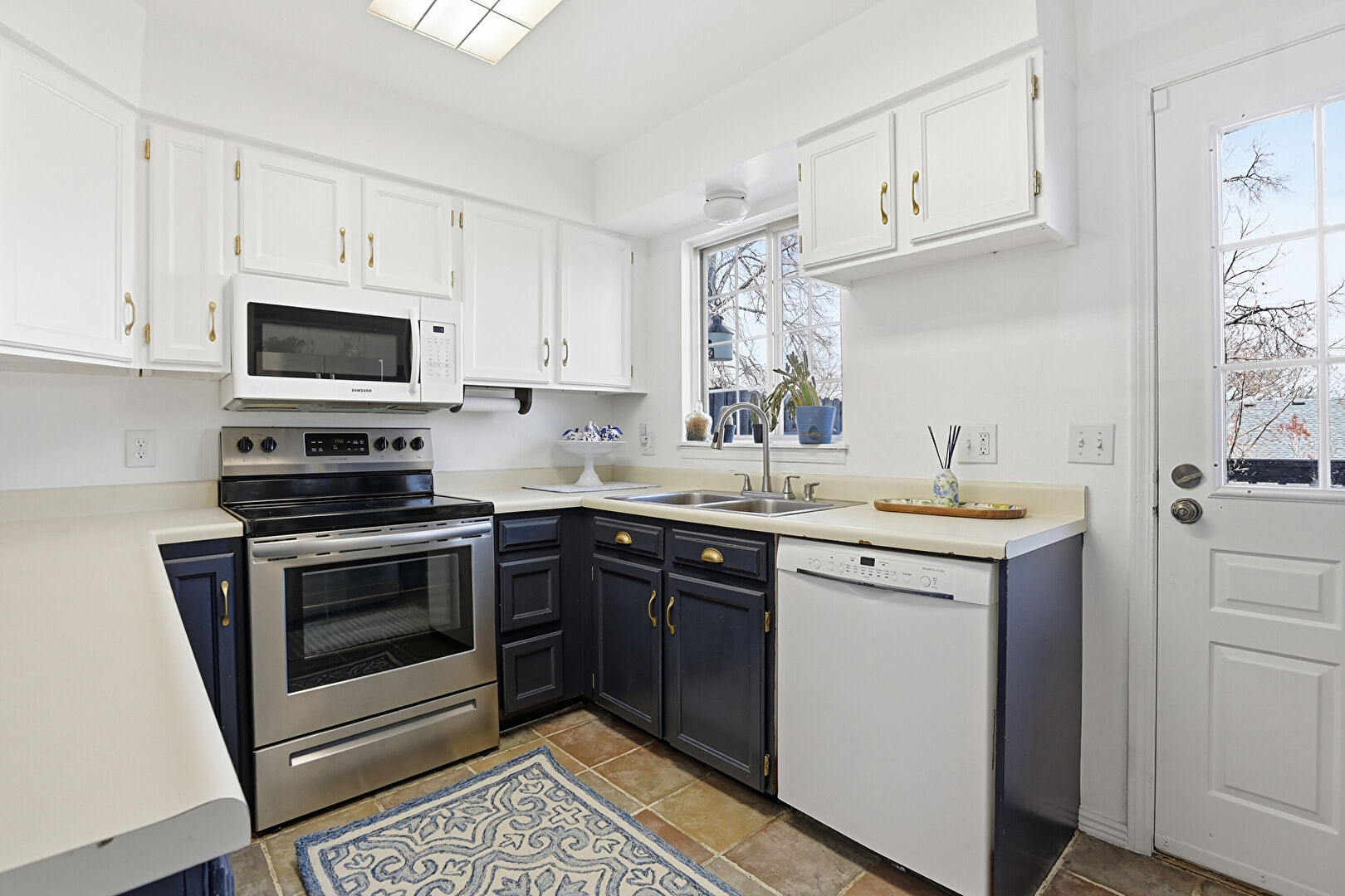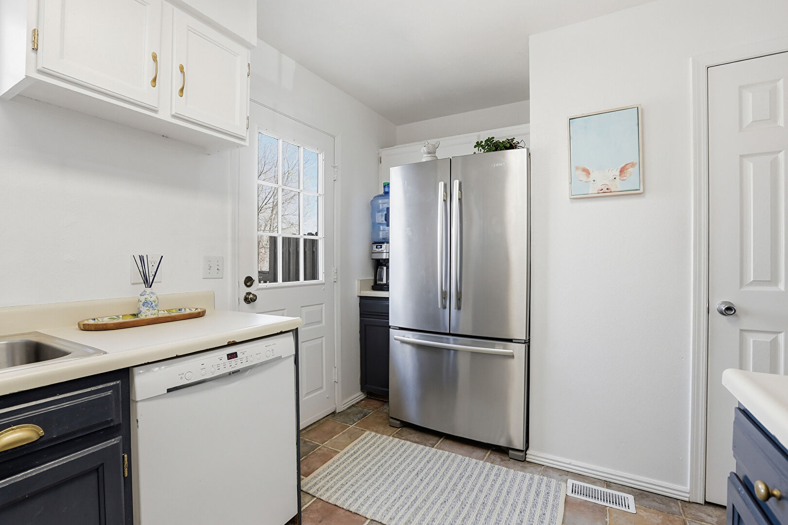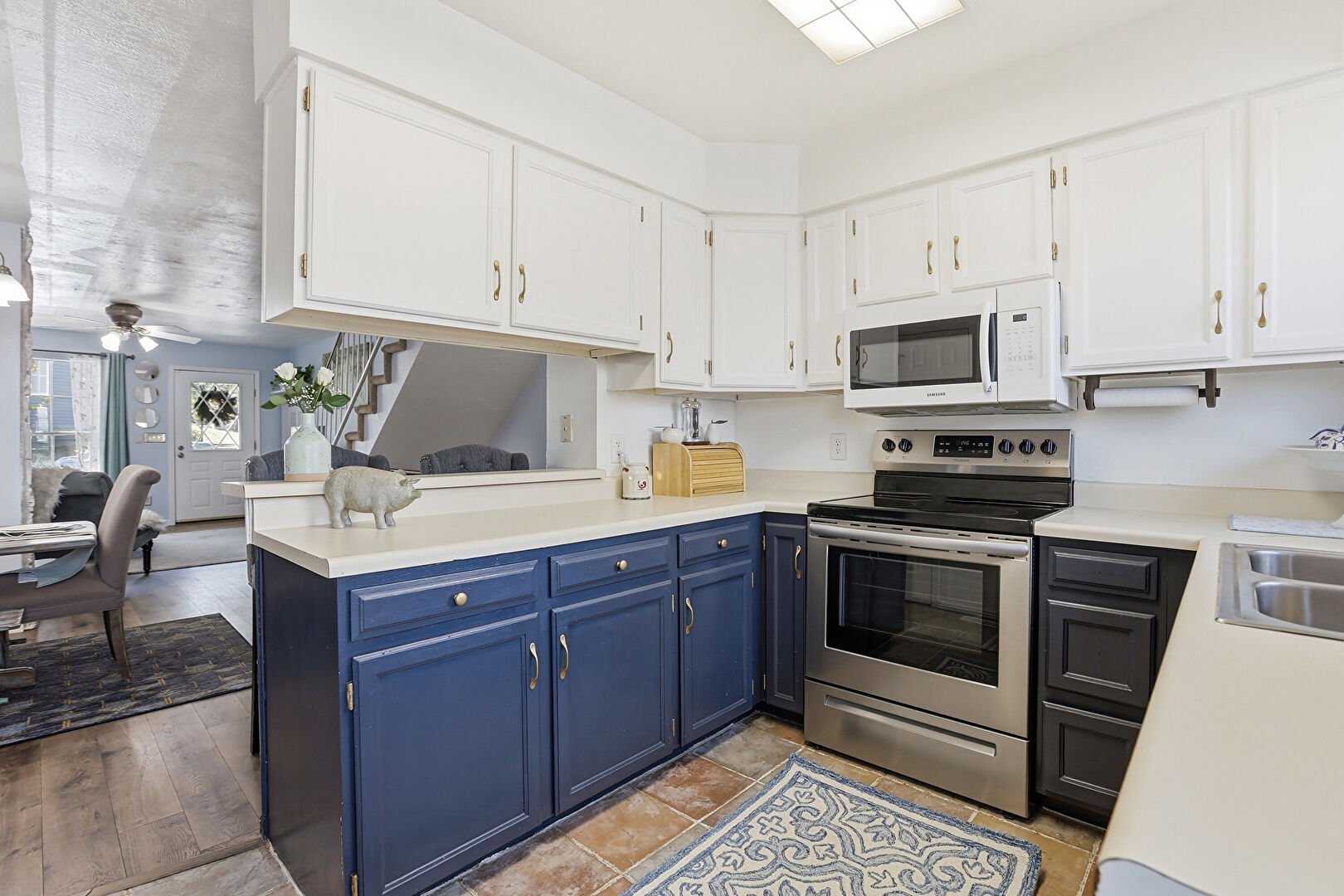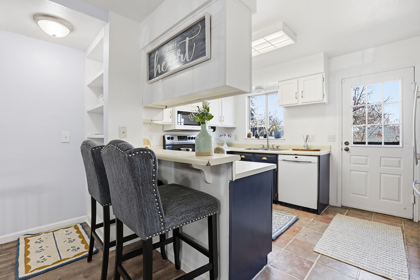 Baseboards Wall, Blue Cabinets, Ceiling Fan, Drywall, Kitchen Peninsula, Natural Light, Open Shelves, Opens To Living Area, Shaker Cabinets, Tile Floor, Visible Hinge Cabinets, Kitchen Bar, Shaker Cabinets, Vent, Visible Hinge Cabinets