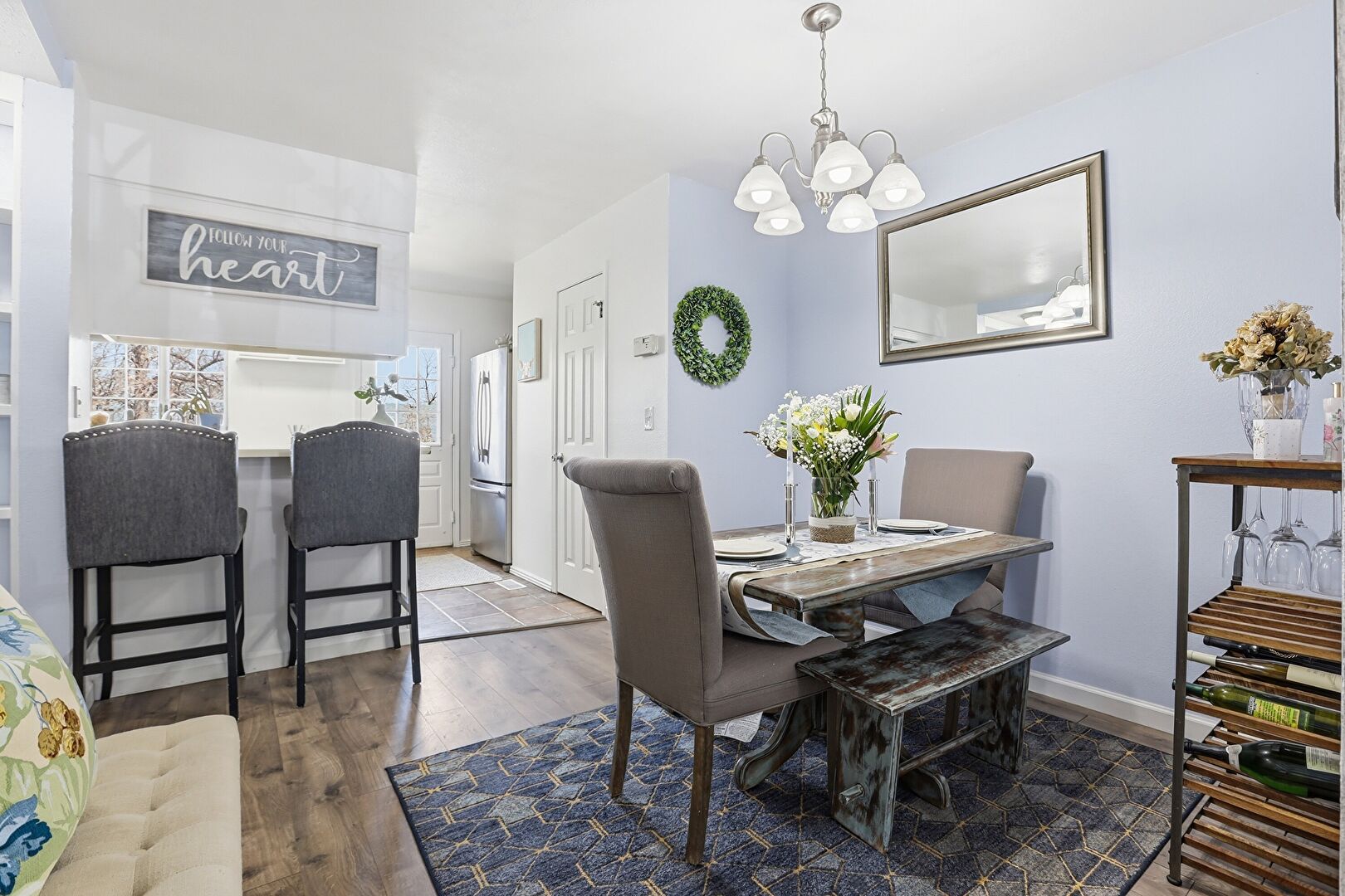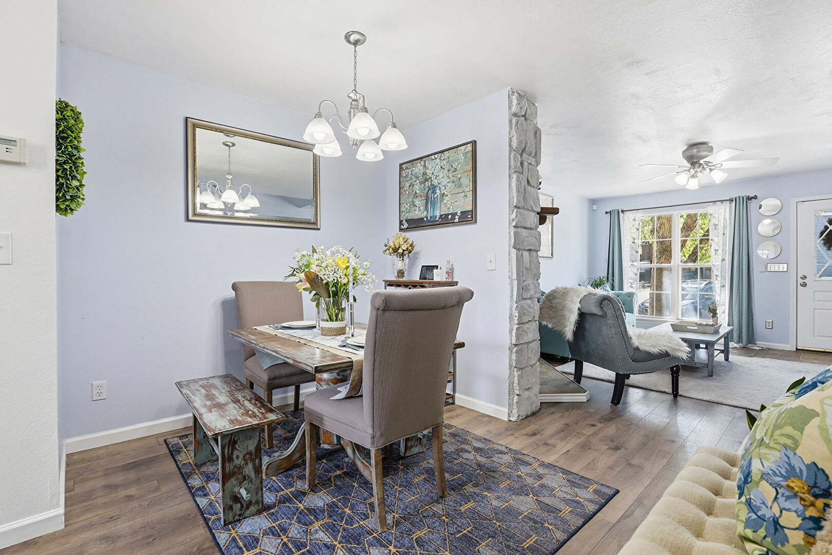 Baseboards Wall, Ceiling Fan, Drywall, Notable Chandelier, Wood Finish Floor, Natural Light, Notable Chandelier