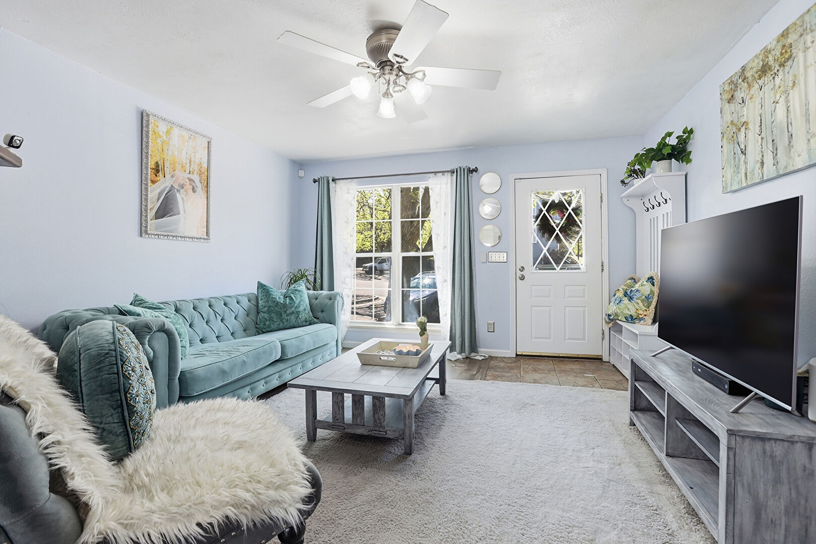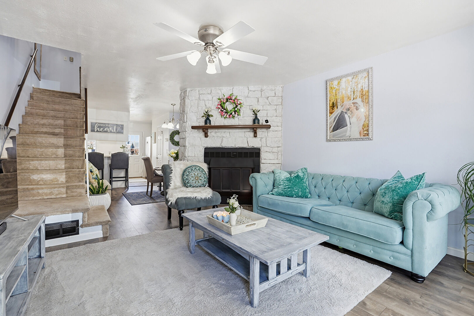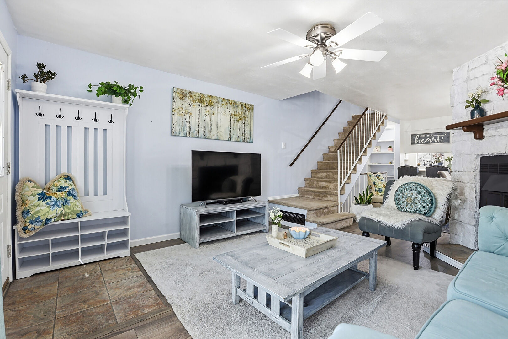 Baseboards Wall, Carpet, Ceiling Fan, Drywall, Fireplace, Natural Light, Stairs, Wood Finish Floor, Baseboards Wall, Drywall, Stairs