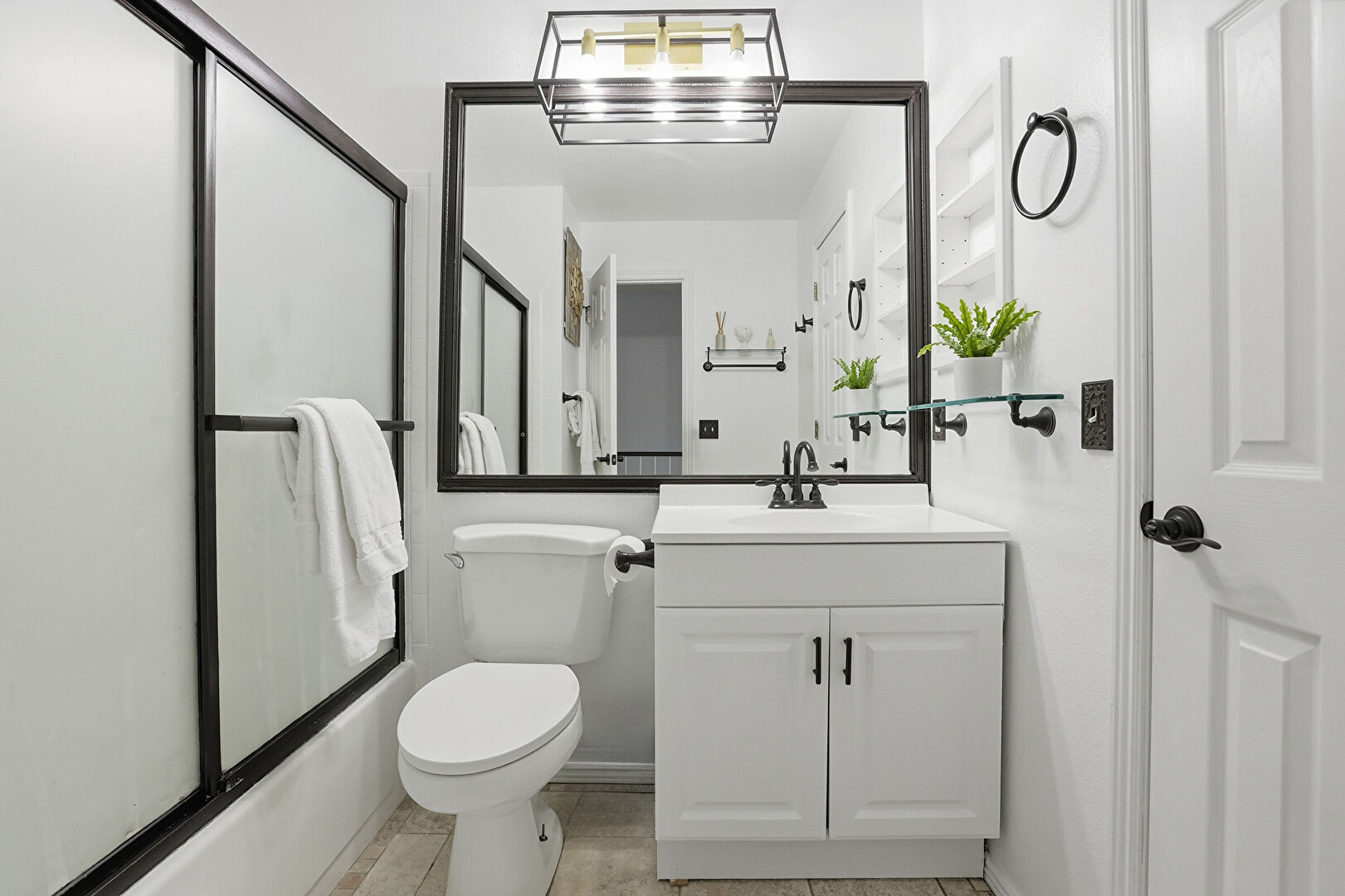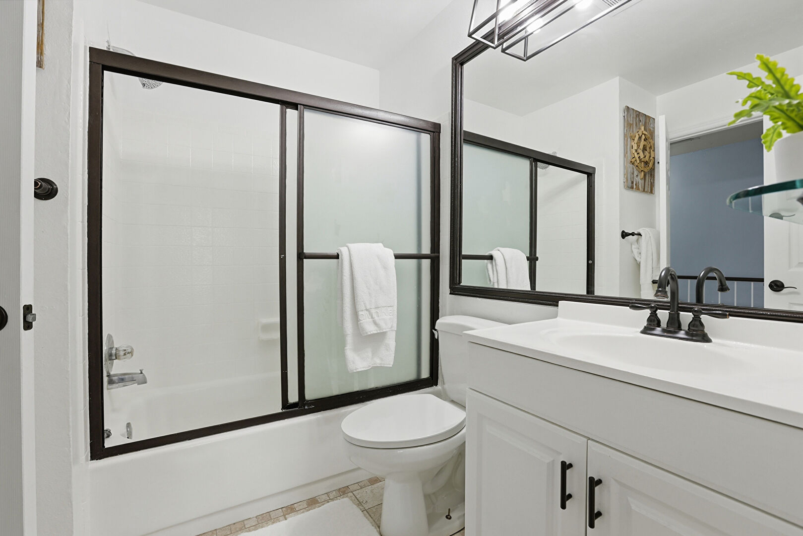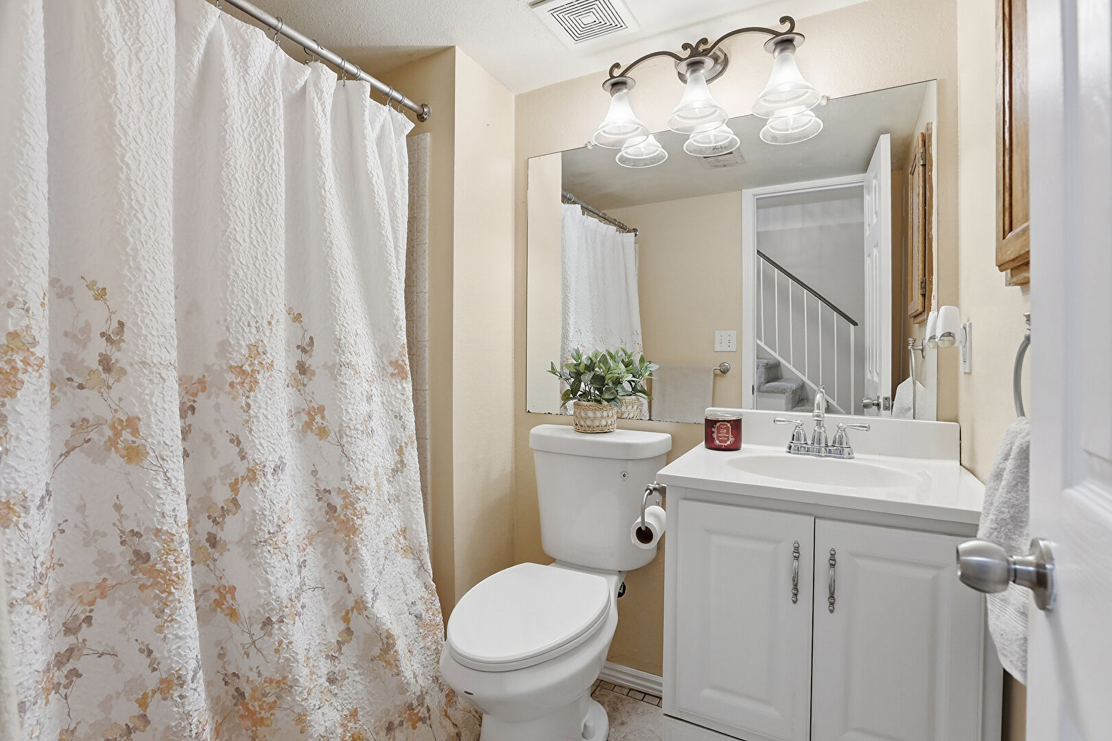 Baseboards Wall, Combined Bath Shower, Drywall, Full Bathroom, Tile Floor, Vanity, Vent, Combined Bath Shower, Vanity