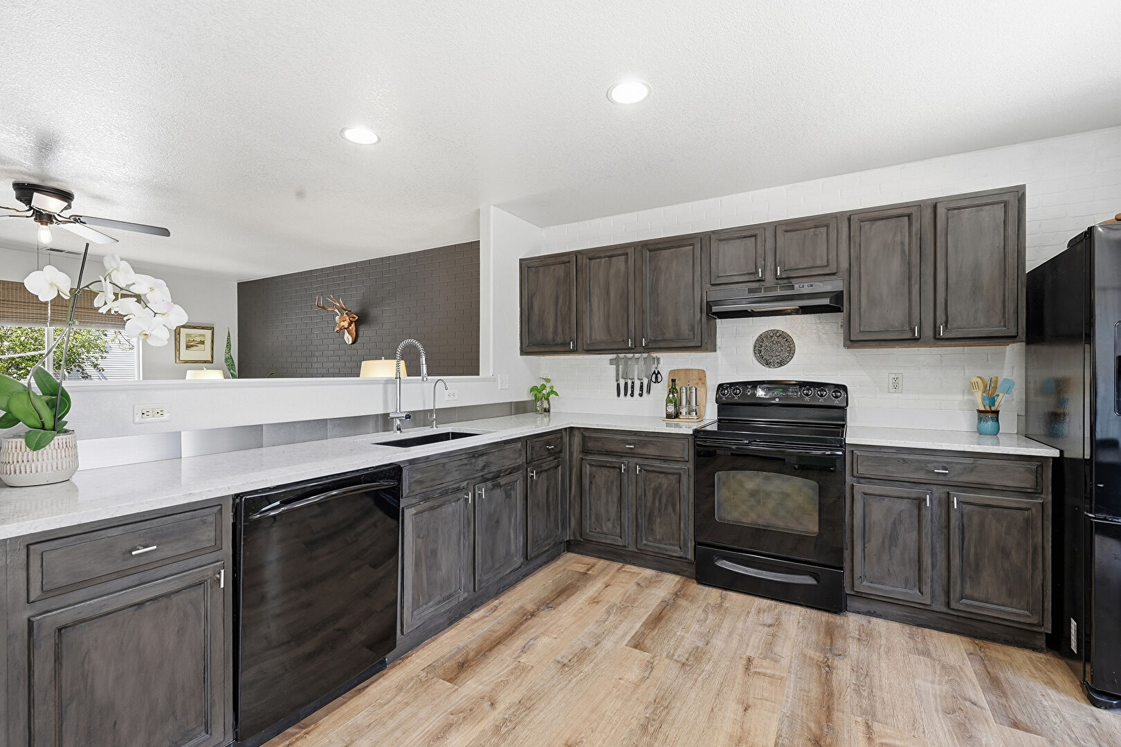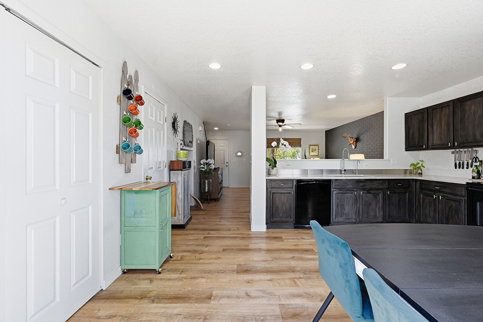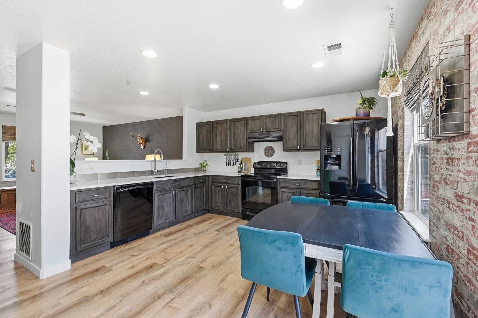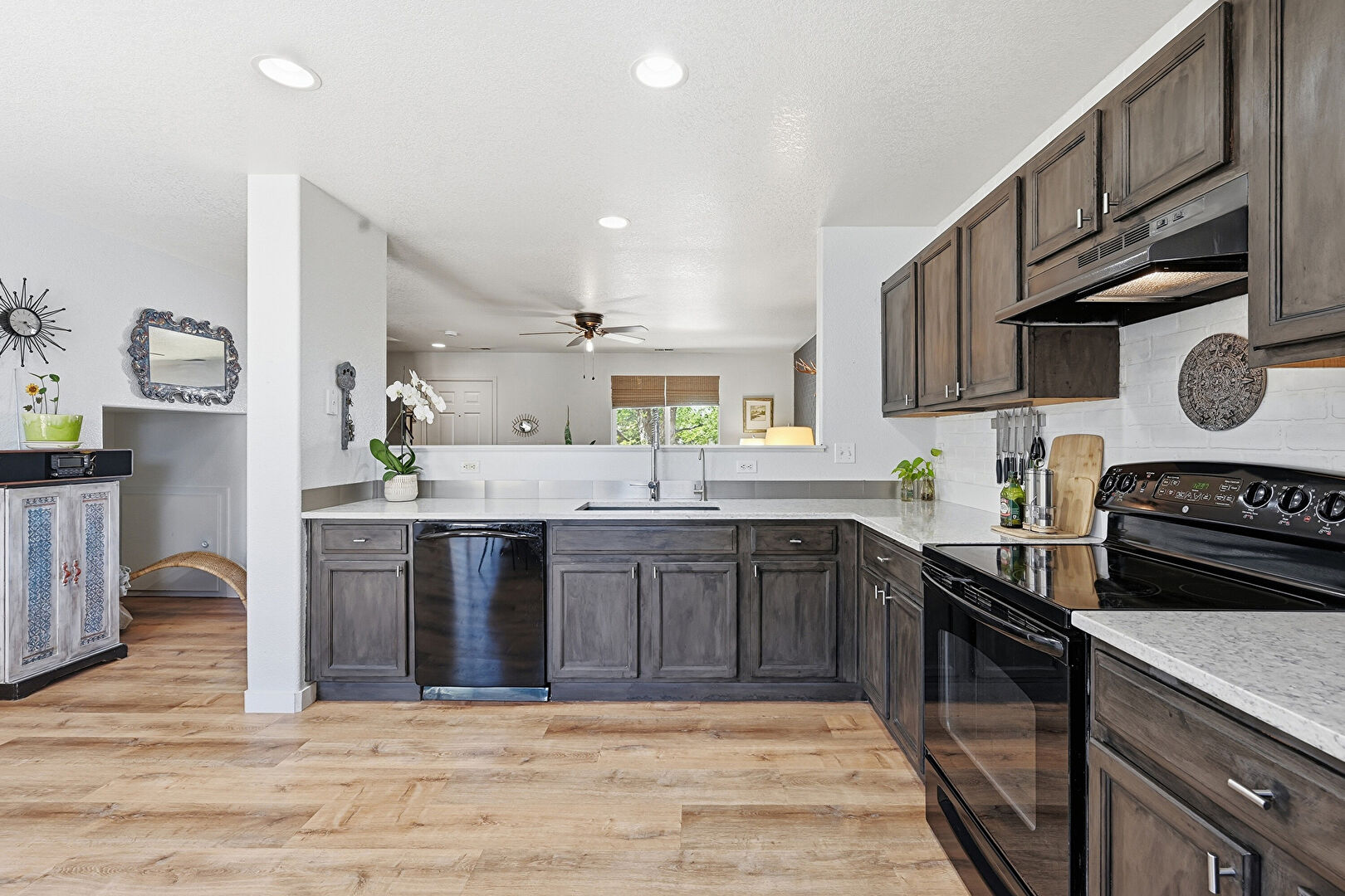 Baseboards Wall, Brick Wall, Ceiling Fan, Dark Brown Cabinets, Drywall, Kitchen Peninsula, Natural Light, Opens To Living Area, Pass Through Window, Recessed Lighting, Shaker Cabinets, Stone Countertops, Textured Ceiling, Vent, Wood Finish Floor, Ceiling Fan, Dark Brown Cabinets, L Shaped Kitchen, Wood Finish Floor