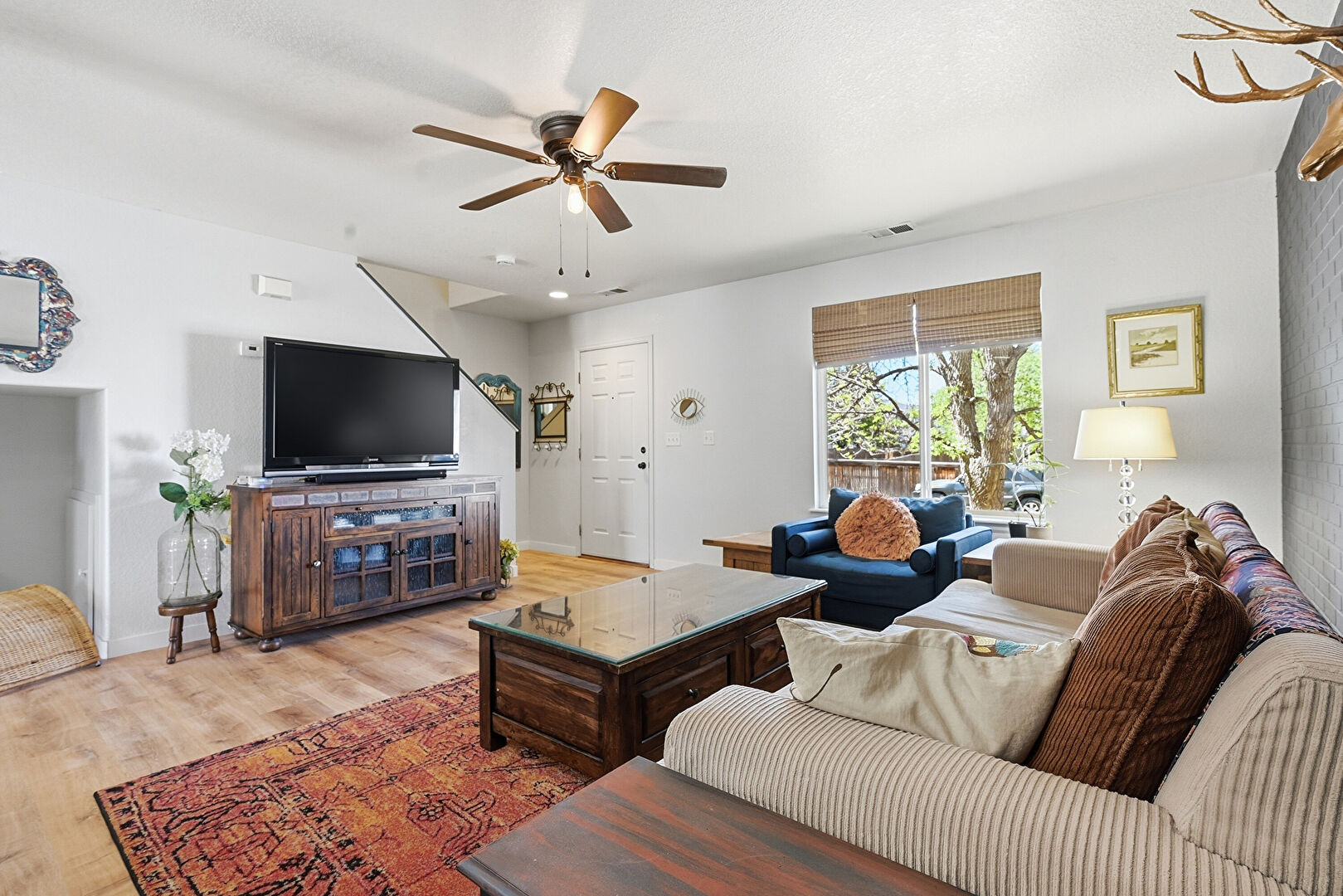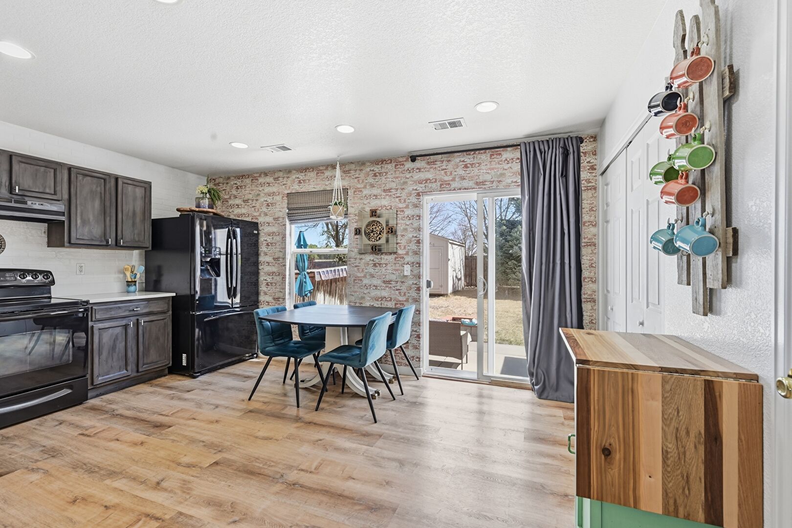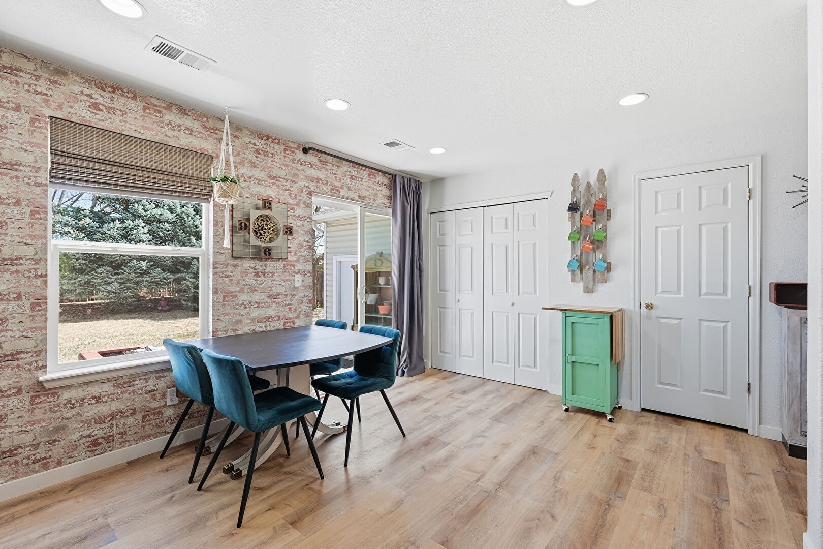Accent Wall, Baseboards Wall, Brick Wall, Ceiling Fan, Natural Light, Recessed Lighting, Vent, Wood Finish Floor, Drywall
