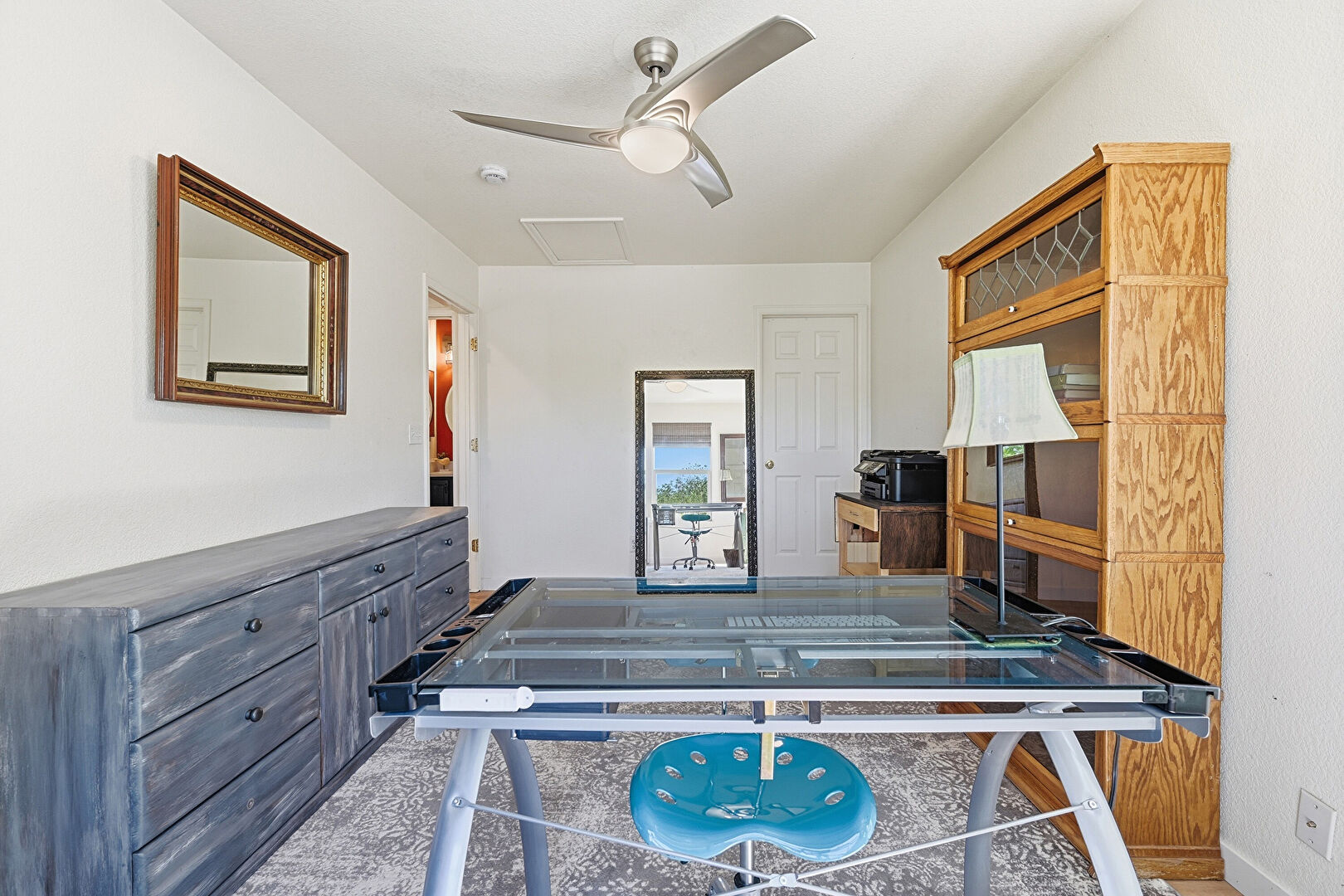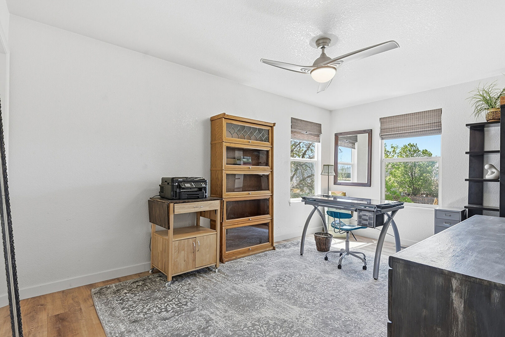 Baseboards Wall, Ceiling Fan, Drywall, Office Area, Scuttle, Textured Ceiling, Wood Finish Floor, Natural Light, Smoke Carbon Monoxide Detector