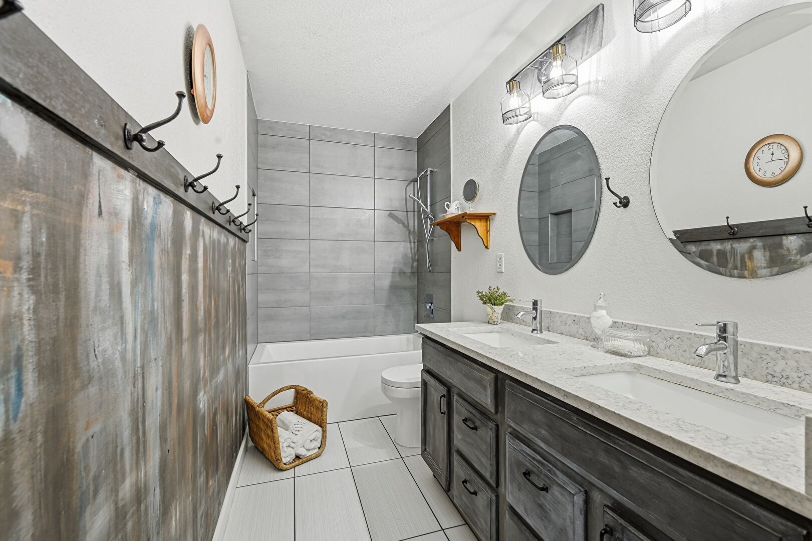 Combined Bath Shower, Double Vanity, Drywall, Textured Wall, Tile Floor, Full Bathroom