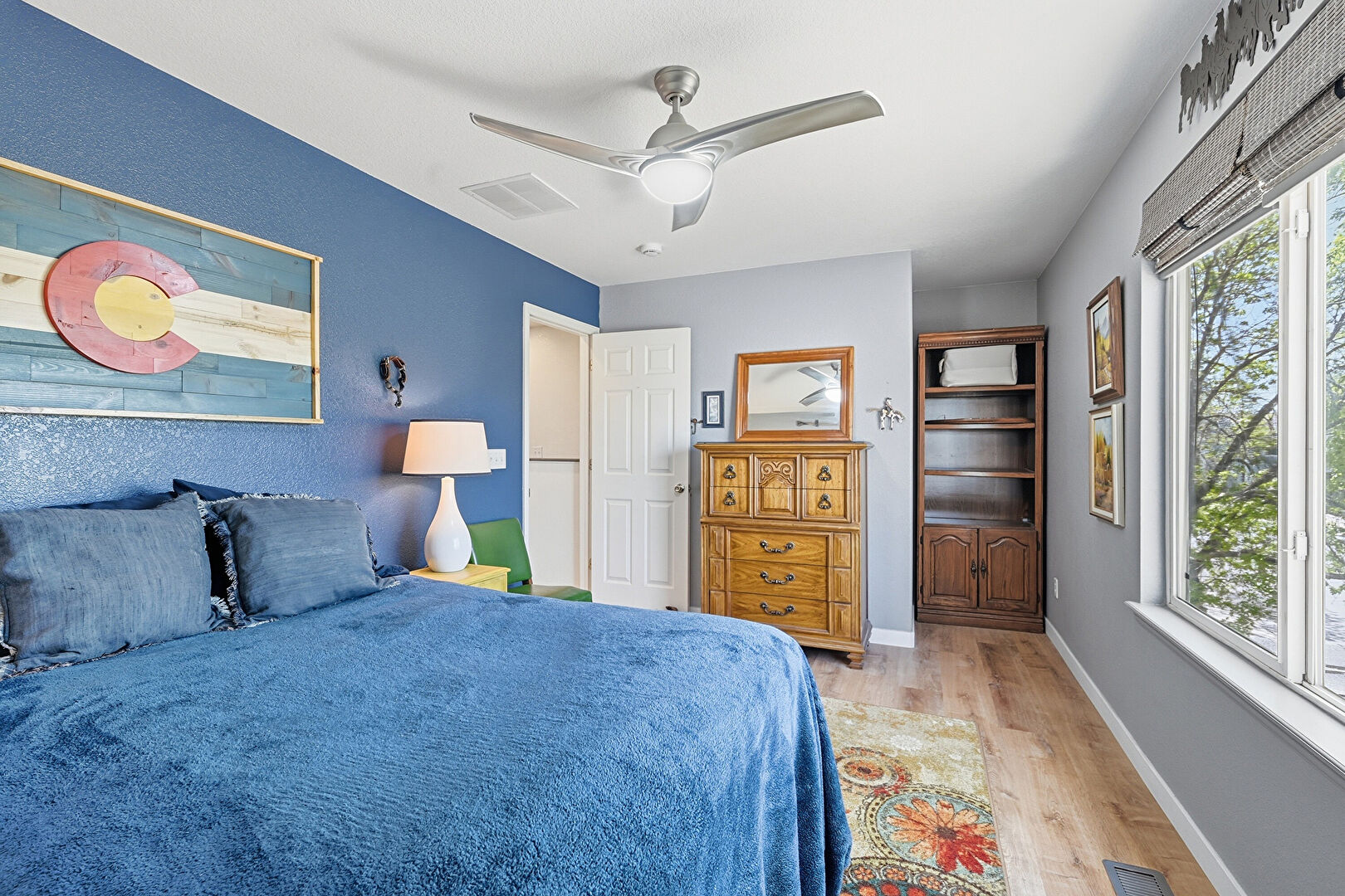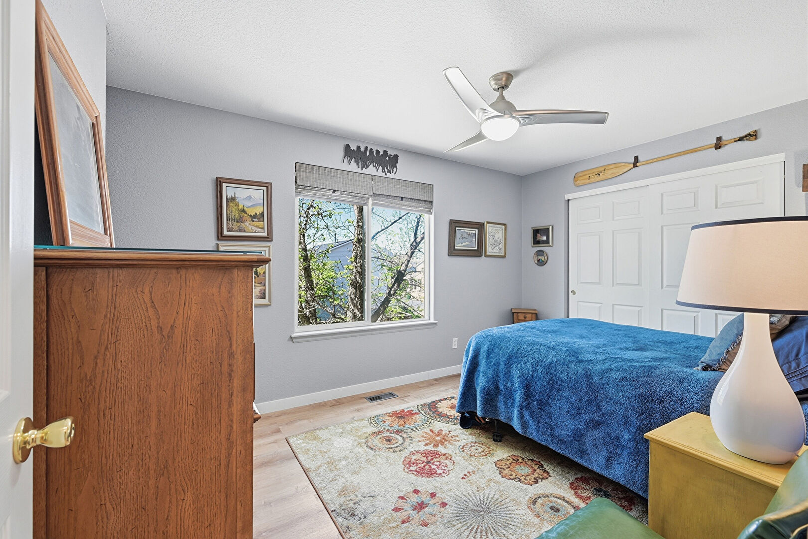 Baseboards Wall, Ceiling Fan, Drywall, Natural Light, Textured Wall, Vent, Wood Finish Floor, Closet, Natural Light