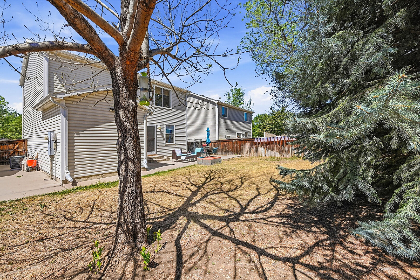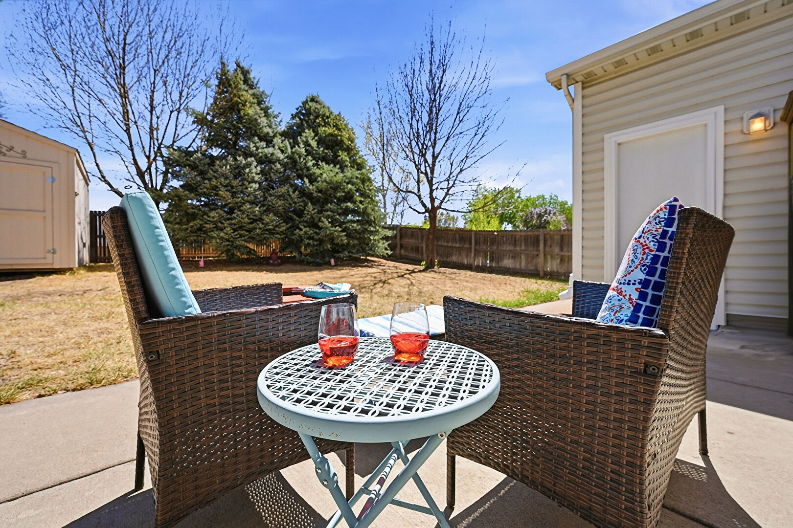 Concrete Foundation, Downspout, Electric Meter, Entry Steps, Fence, Fire Pit, Gutters, Horizontal Siding, Outdoor Structure, Patio, Satellite Dish, Shed, Lawn, Patio