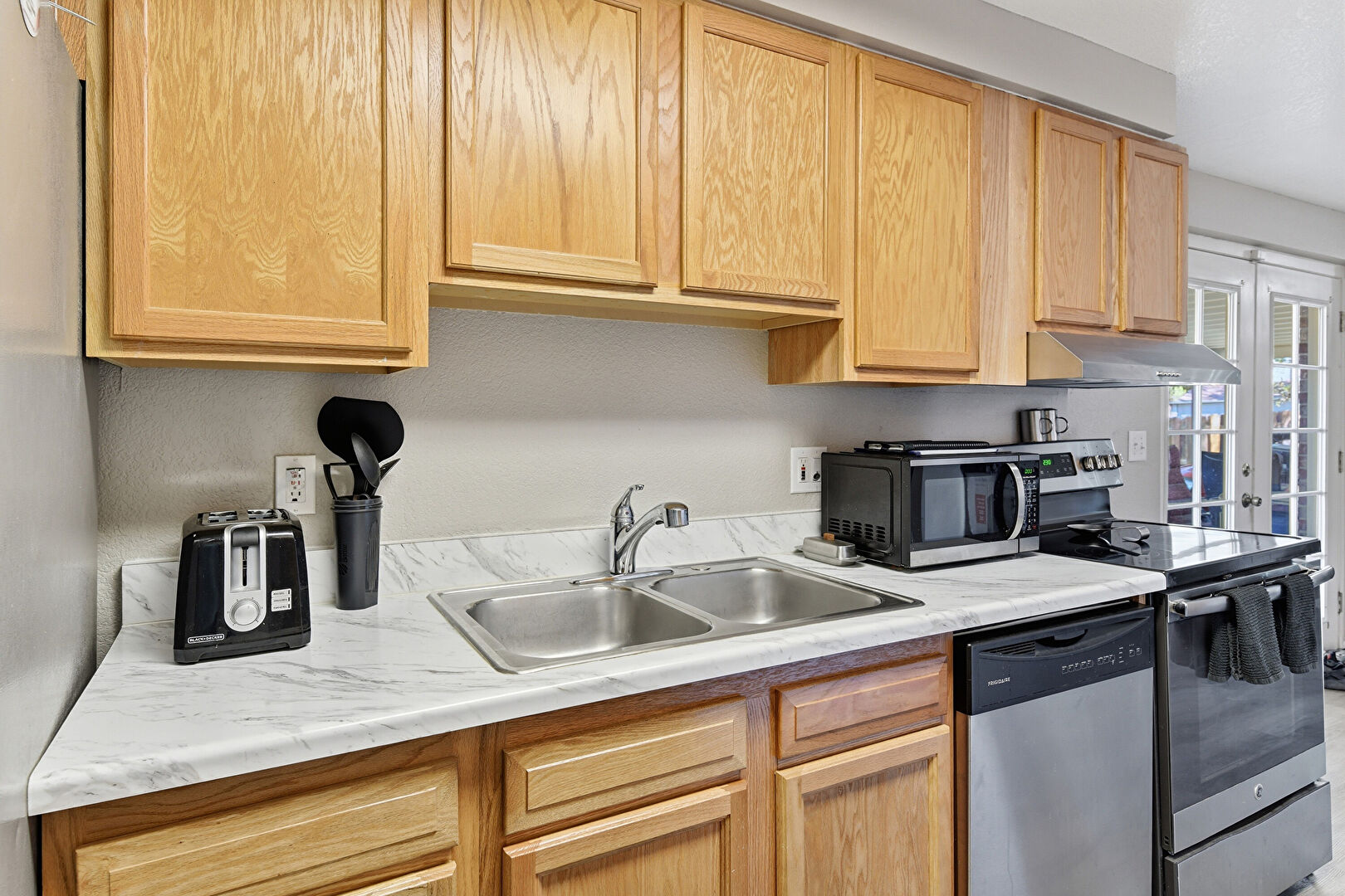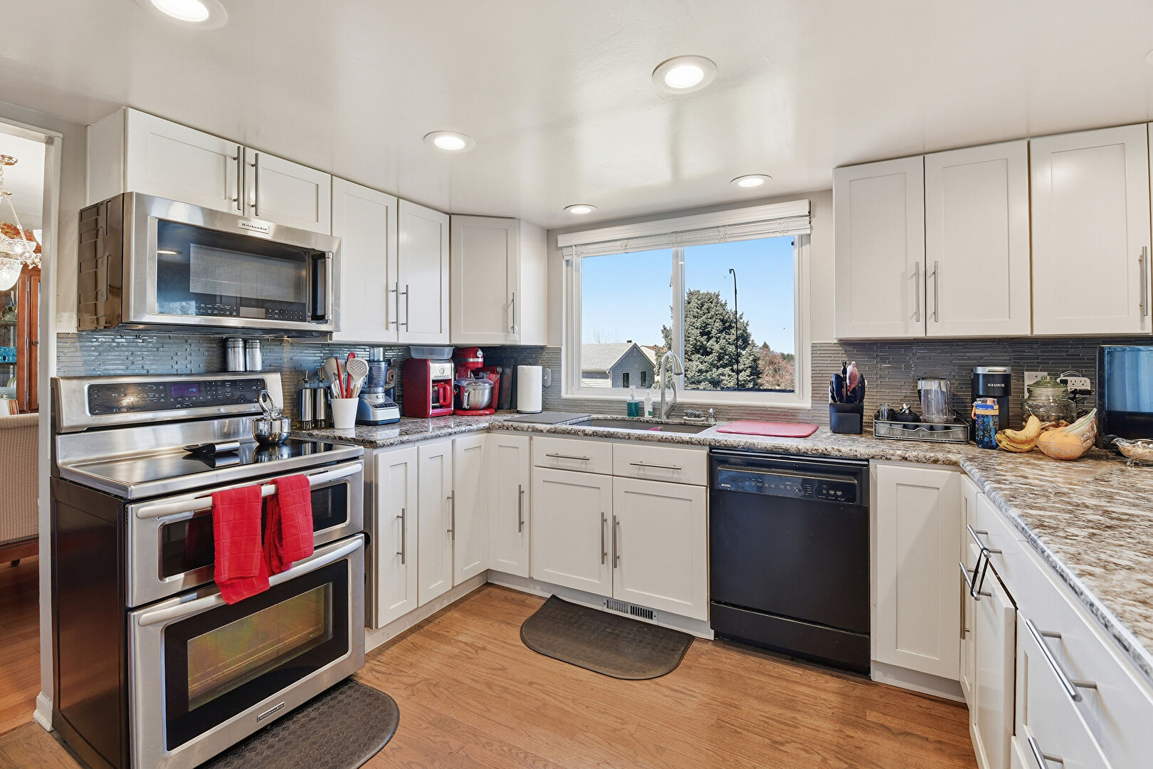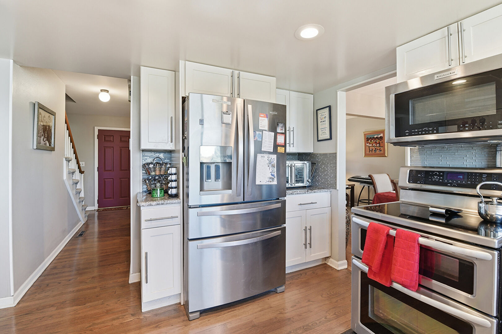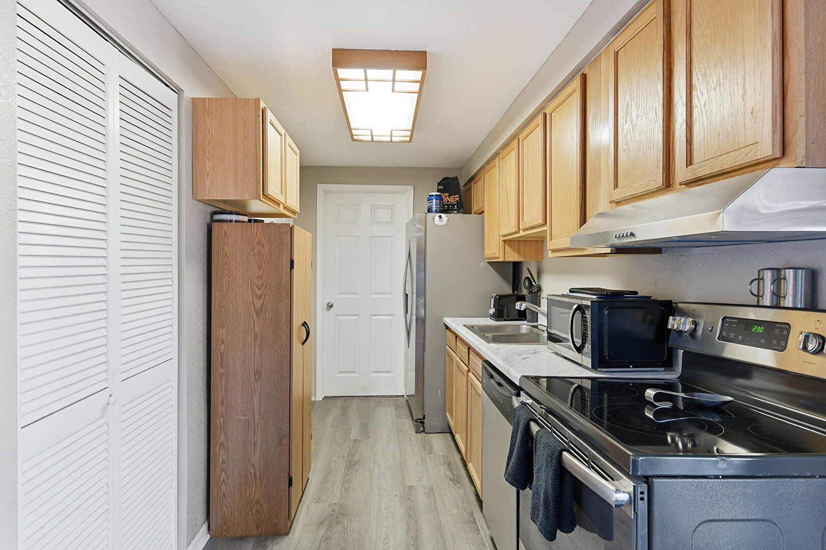 Galley Kitchen, Natural Light, Shaker Cabinets, Wood Finish Floor, Drywall
