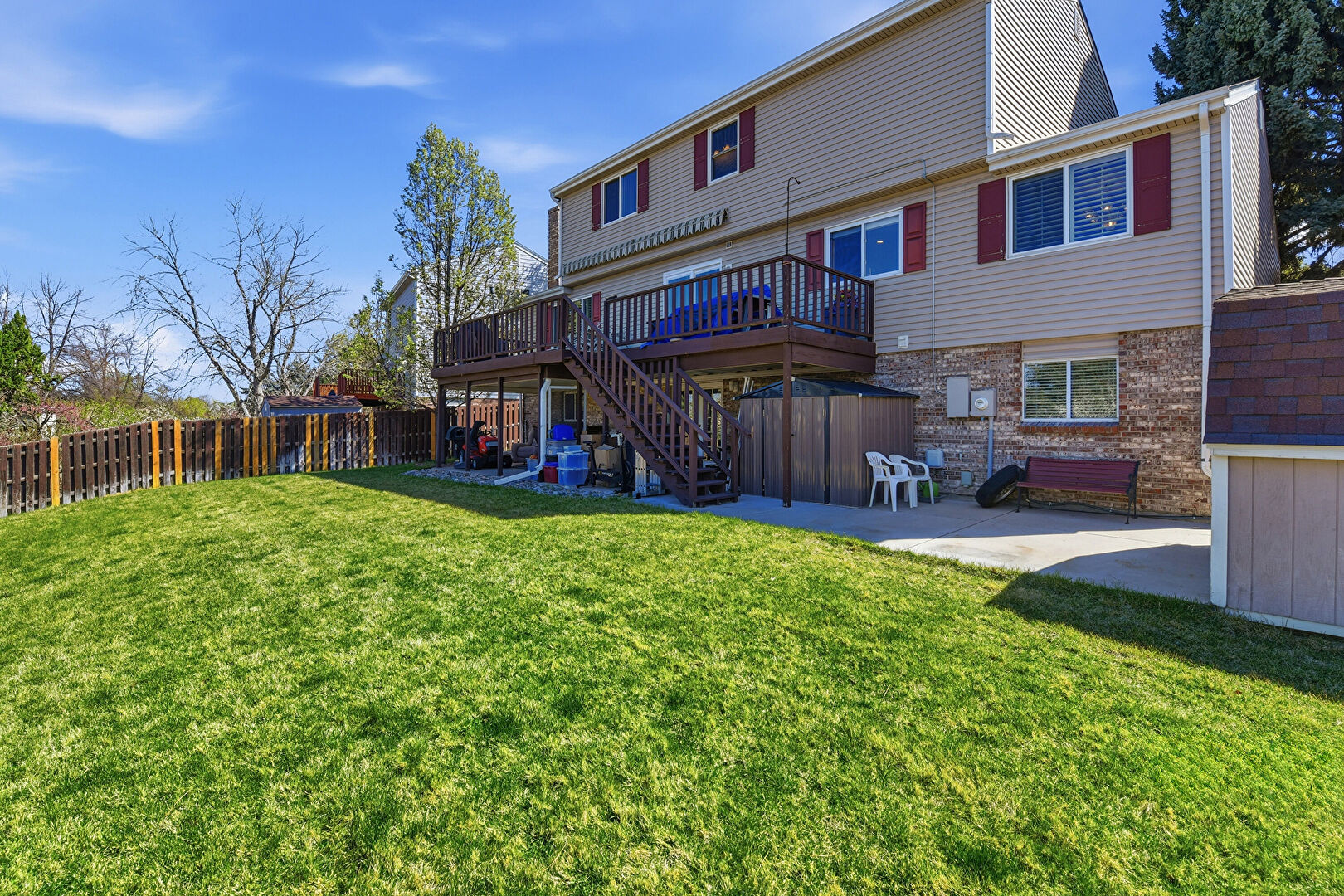 Brick Siding, Deck, Downspout, Electric Meter, Fence, Horizontal Siding, Lawn, Outdoor Structure, Patio, Shed, Stairs, Gutters