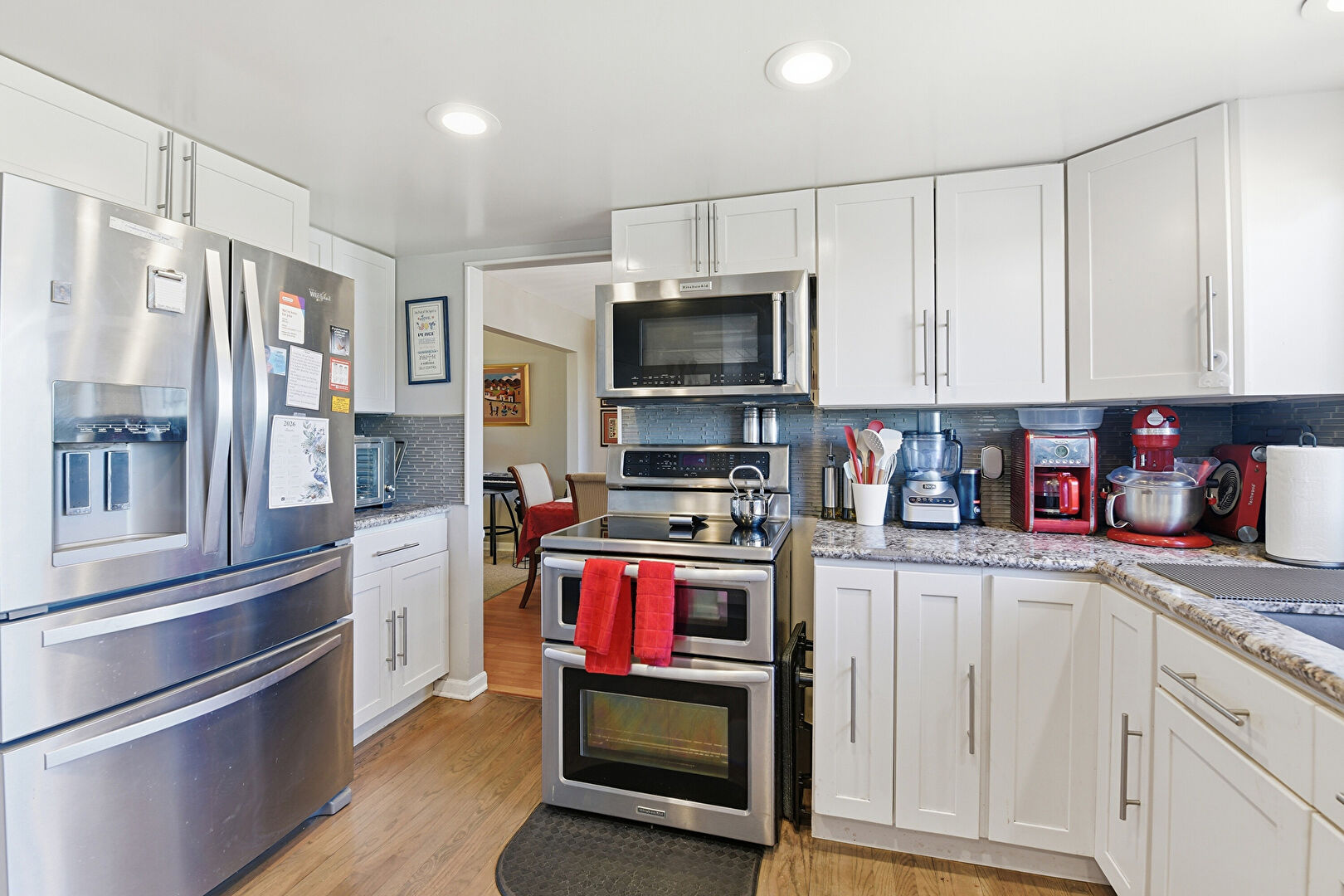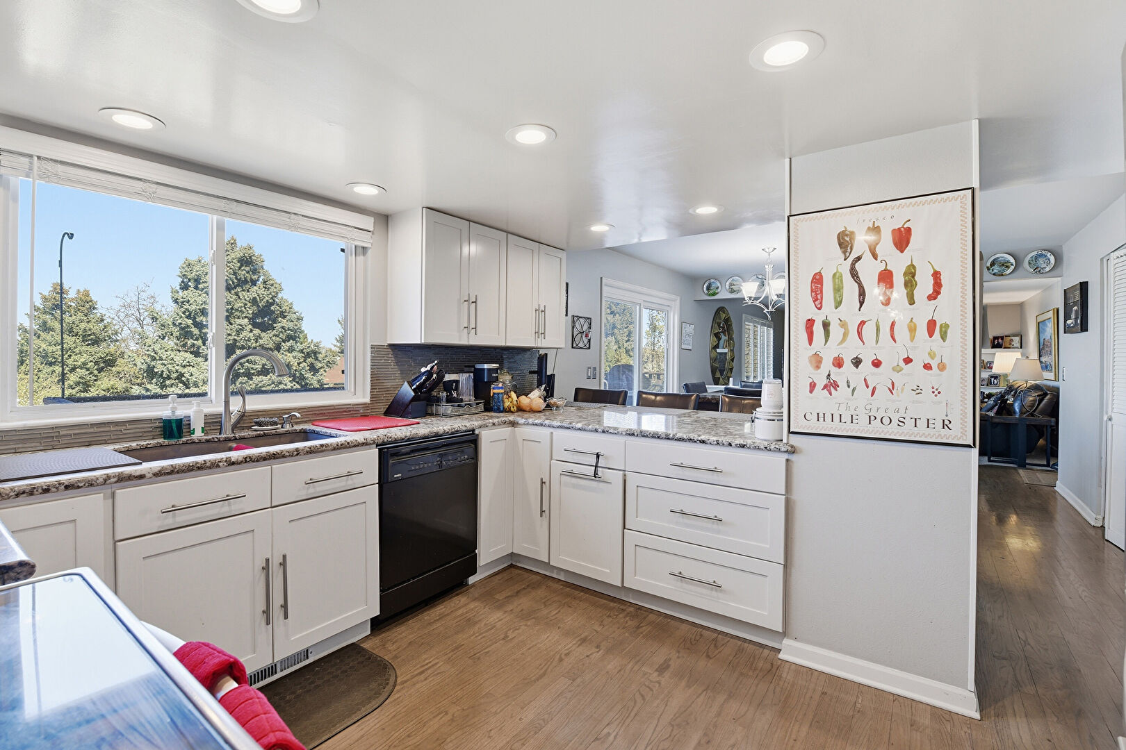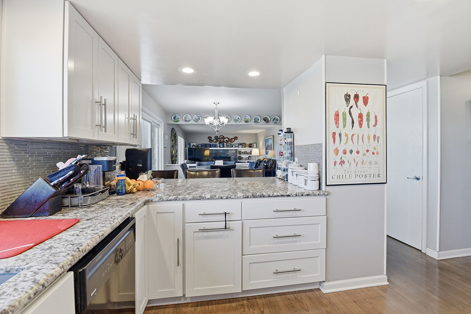 Baseboards Wall, Drywall, Kitchen Peninsula, Natural Light, Notable Chandelier, Opens To Living Area, Pass Through Window, Pendant Lighting, Recessed Lighting, Shaker Cabinets, Stone Countertops, Toaster, Vent, Wood Finish Floor, Recessed Lighting, Shaker Cabinets, Toaster, Wood Finish Floor