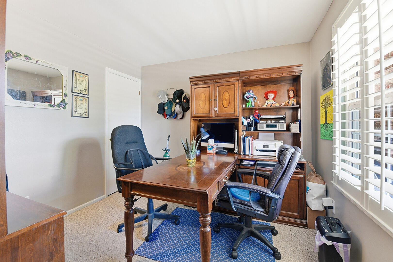 Baseboards Wall, Beamed Ceiling, Carpet, Natural Light, Office Area, Vent, Drywall