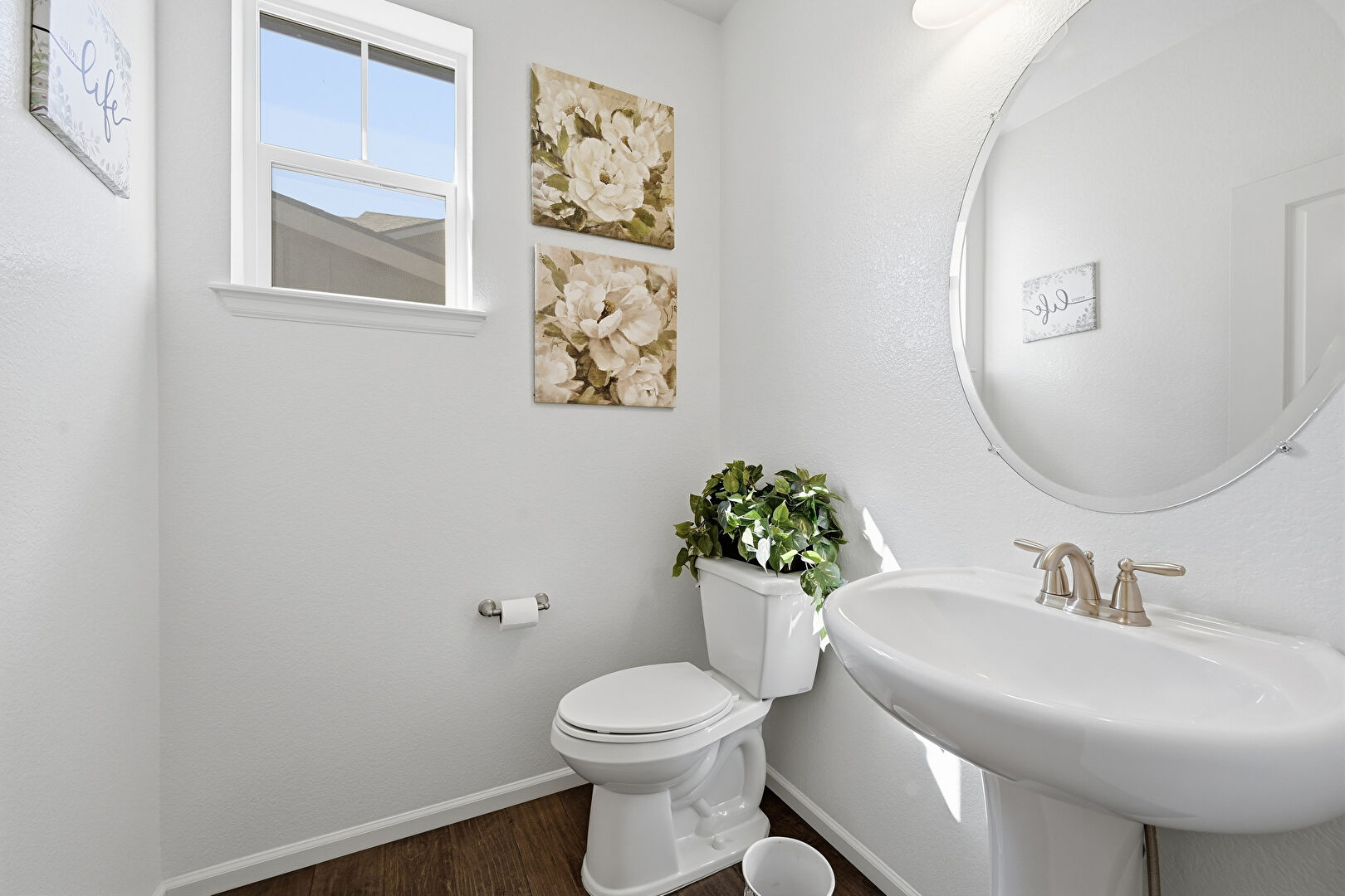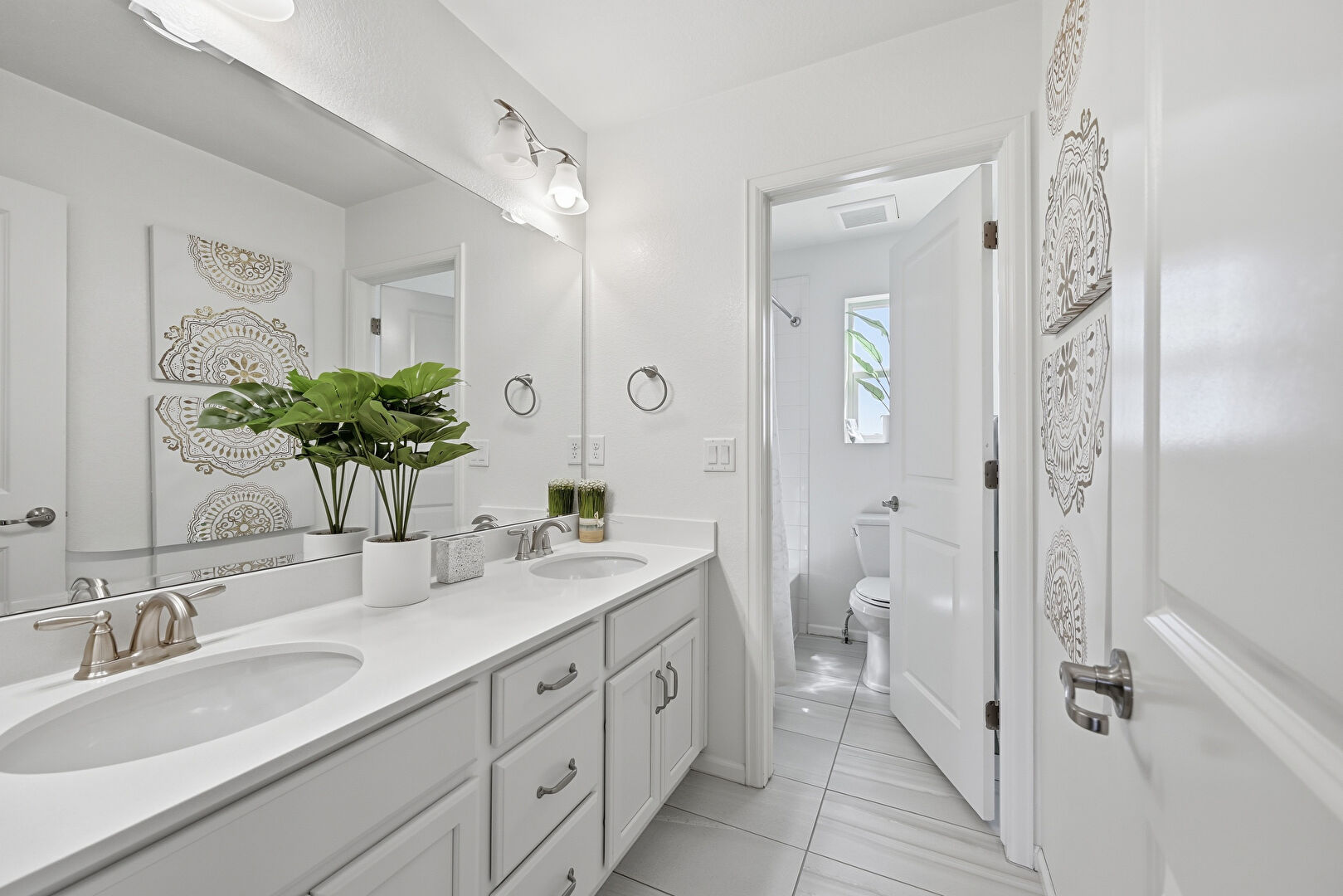 Baseboards Wall, Double Vanity, Drywall, Full Bathroom, Half Bathroom, Natural Light, Tile Floor, Vent, Wood Finish Floor