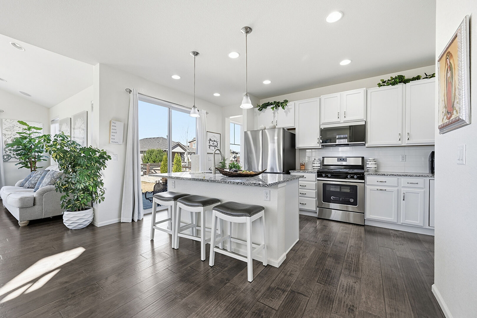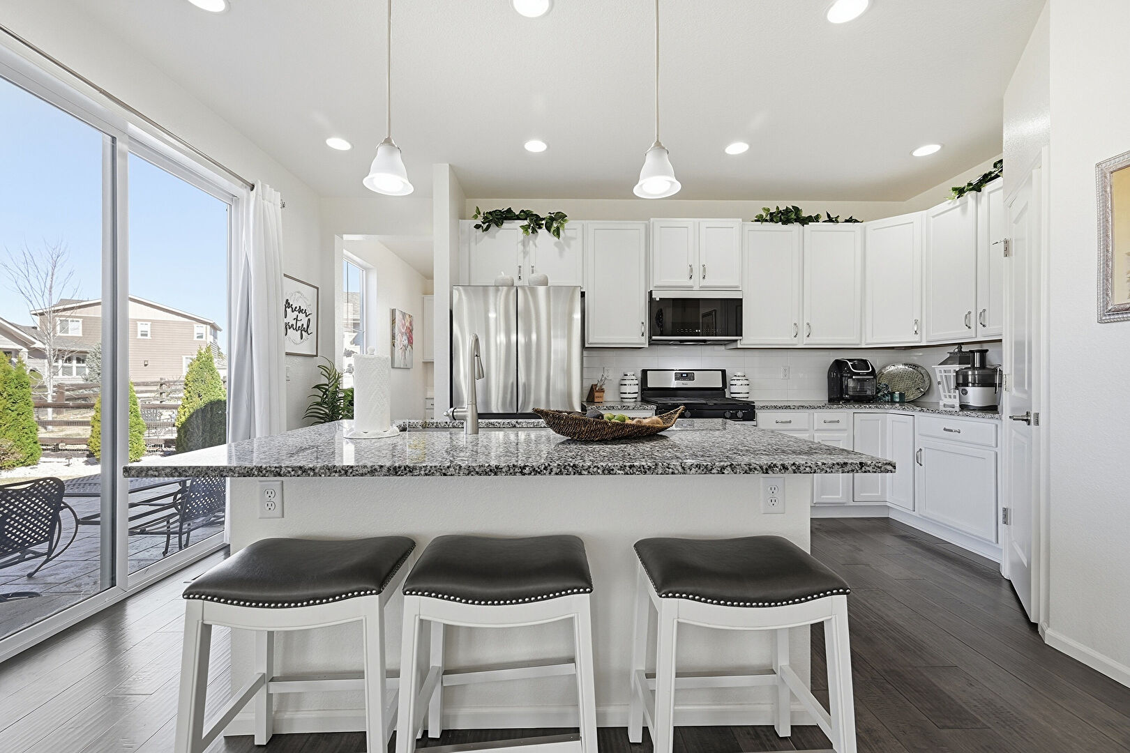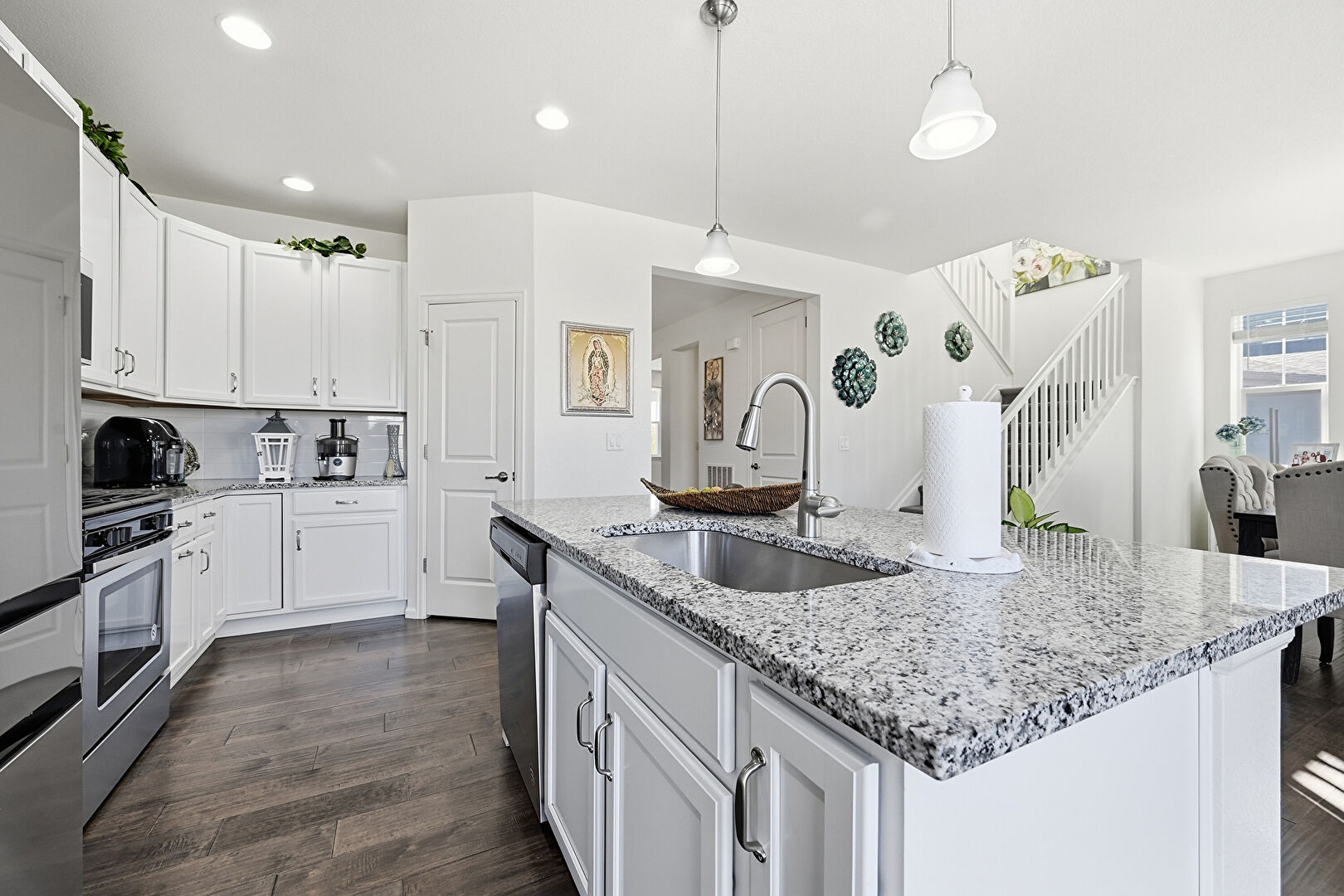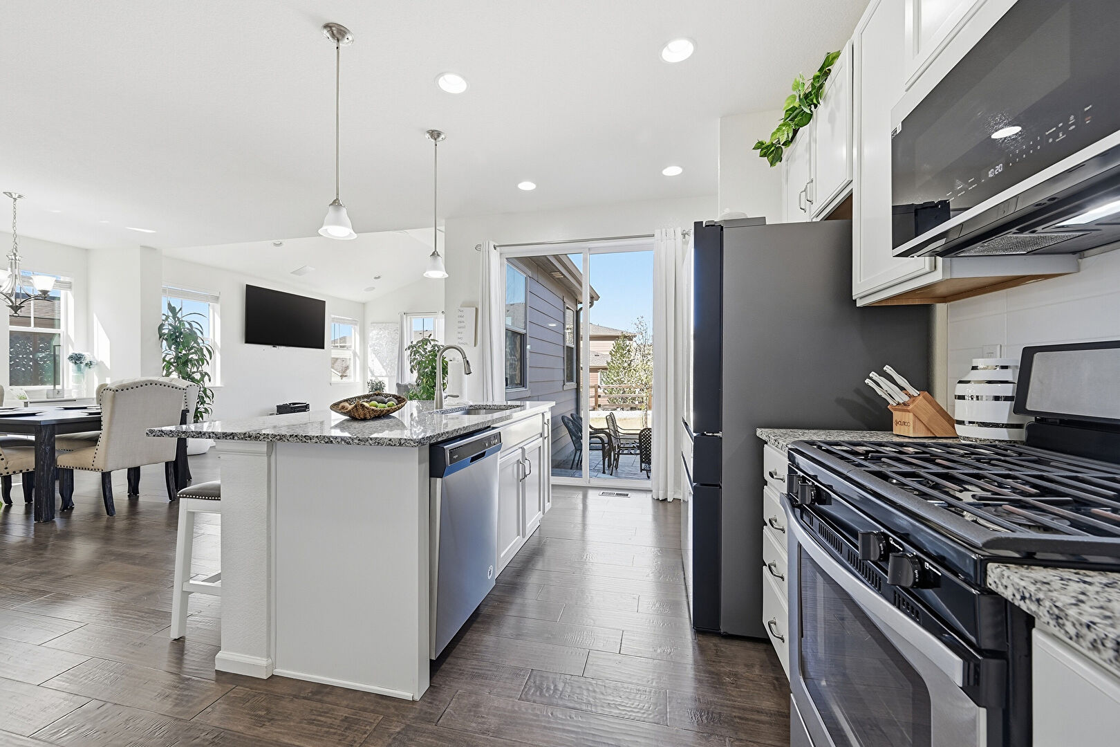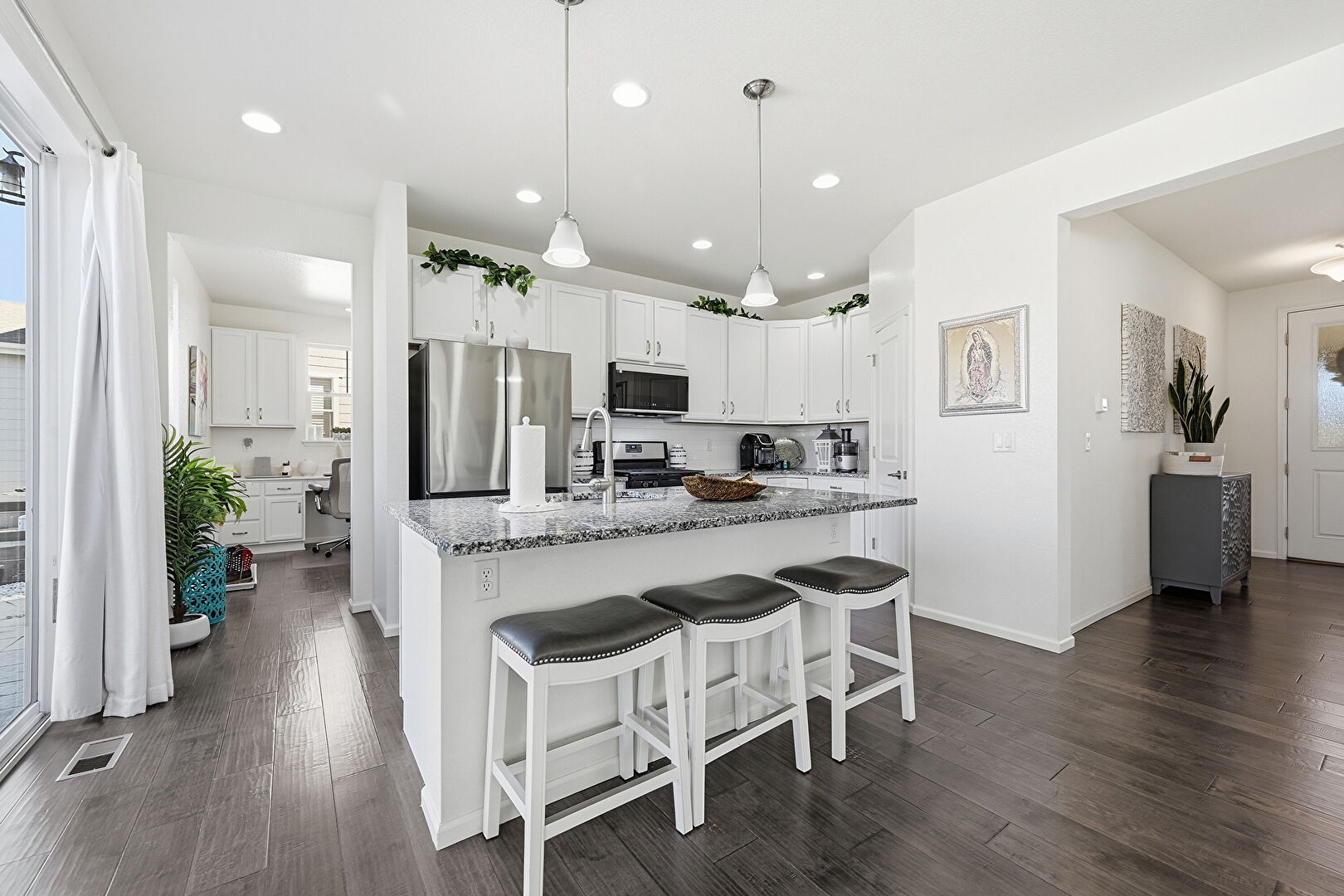Baseboards Wall, Built In Desk, Drywall, Kitchen Bar, Kitchen Island, L Shaped Kitchen, Natural Light, Notable Chandelier, Office Area, Opens To Living Area, Pendant Lighting, Recessed Lighting, Shaker Cabinets, Stone Countertops, Vaulted Ceiling, Wood Finish Floor, Drywall, Recessed Lighting, Shaker Cabinets, Stone Countertops, Vent, Wood Finish Floor