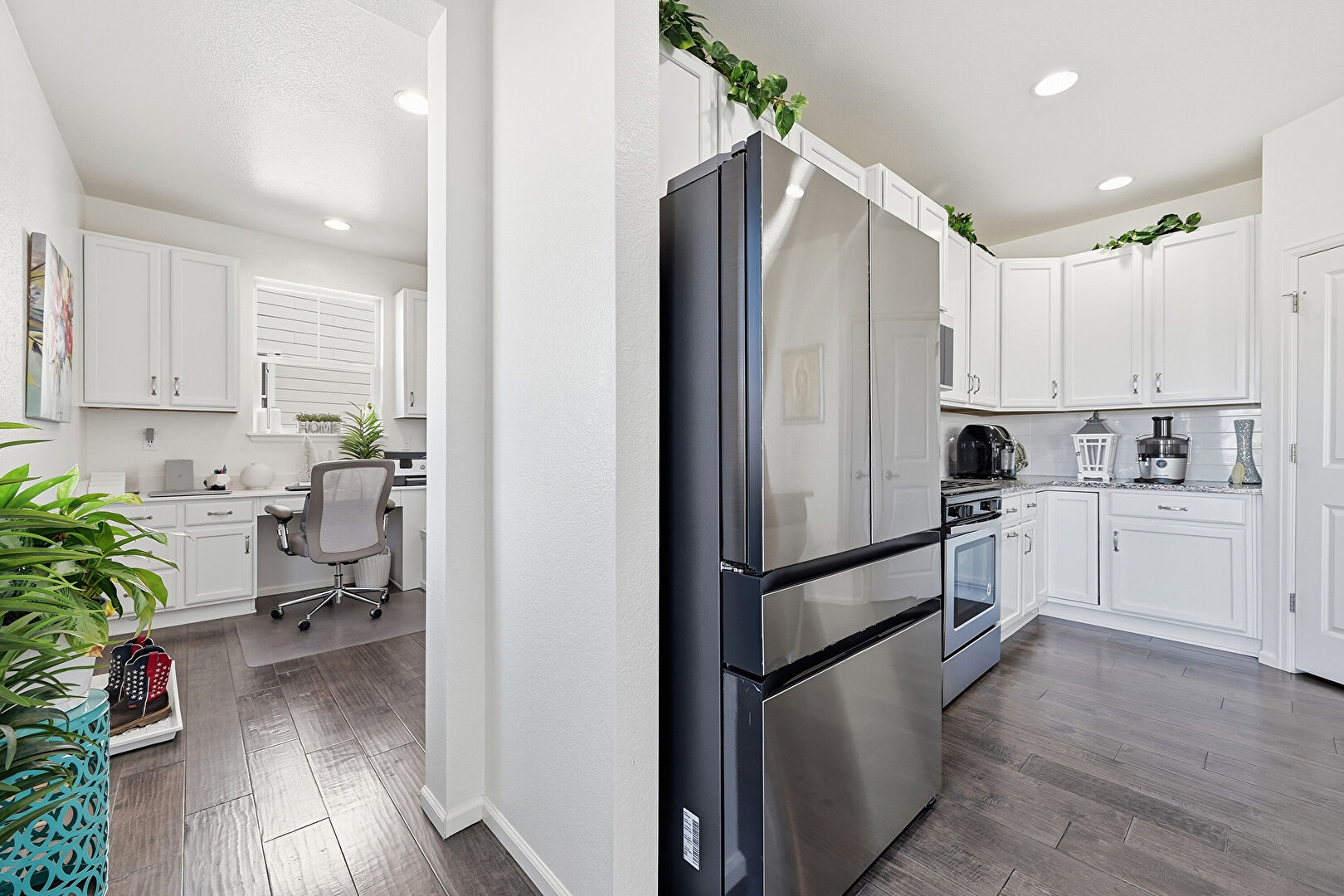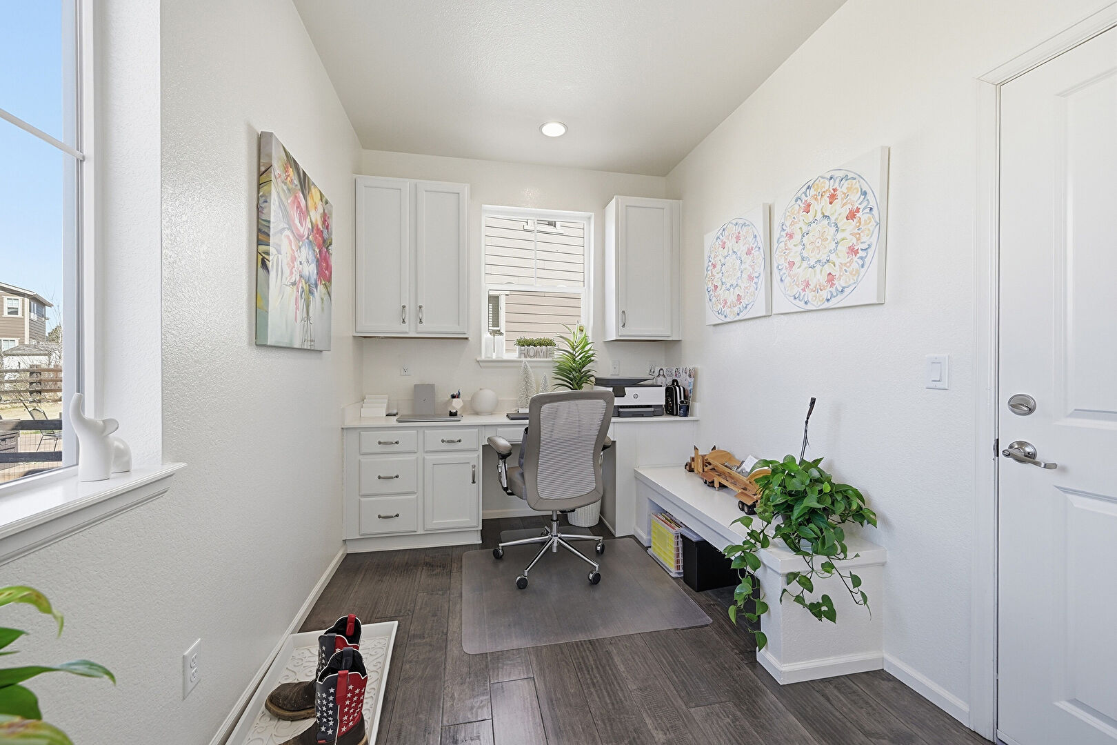 Baseboards Wall, Built In Desk, Drywall, Natural Light, Office Area, Recessed Lighting, Wood Finish Floor, Drywall, Recessed Lighting