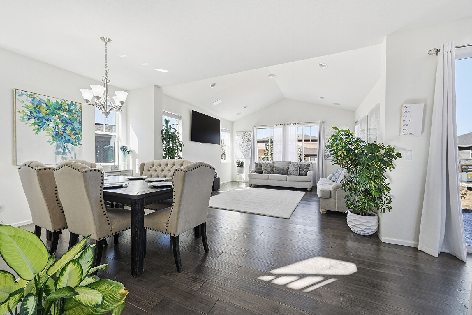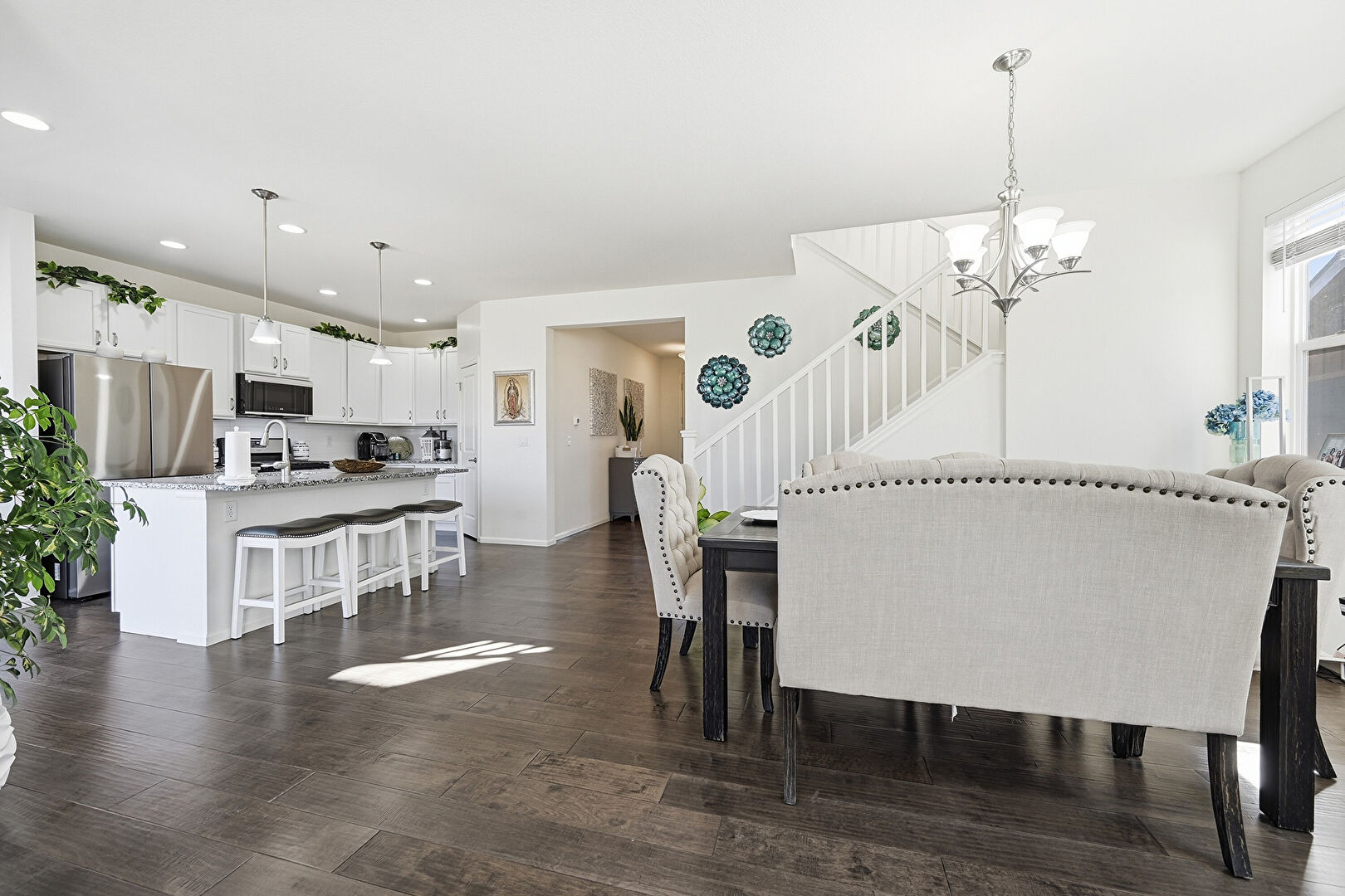 Baseboards Wall, Cathedral Ceiling, Drywall, L Shaped Kitchen, Natural Light, Notable Chandelier, Recessed Lighting, Stairs, Wood Finish Floor, Recessed Lighting, Stairs, Vaulted Ceiling