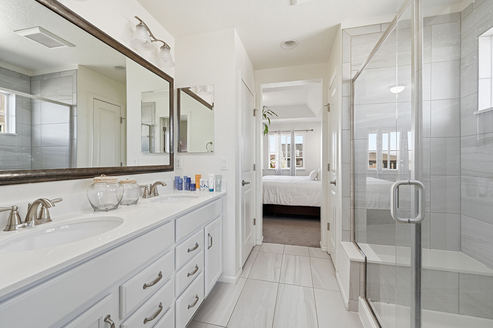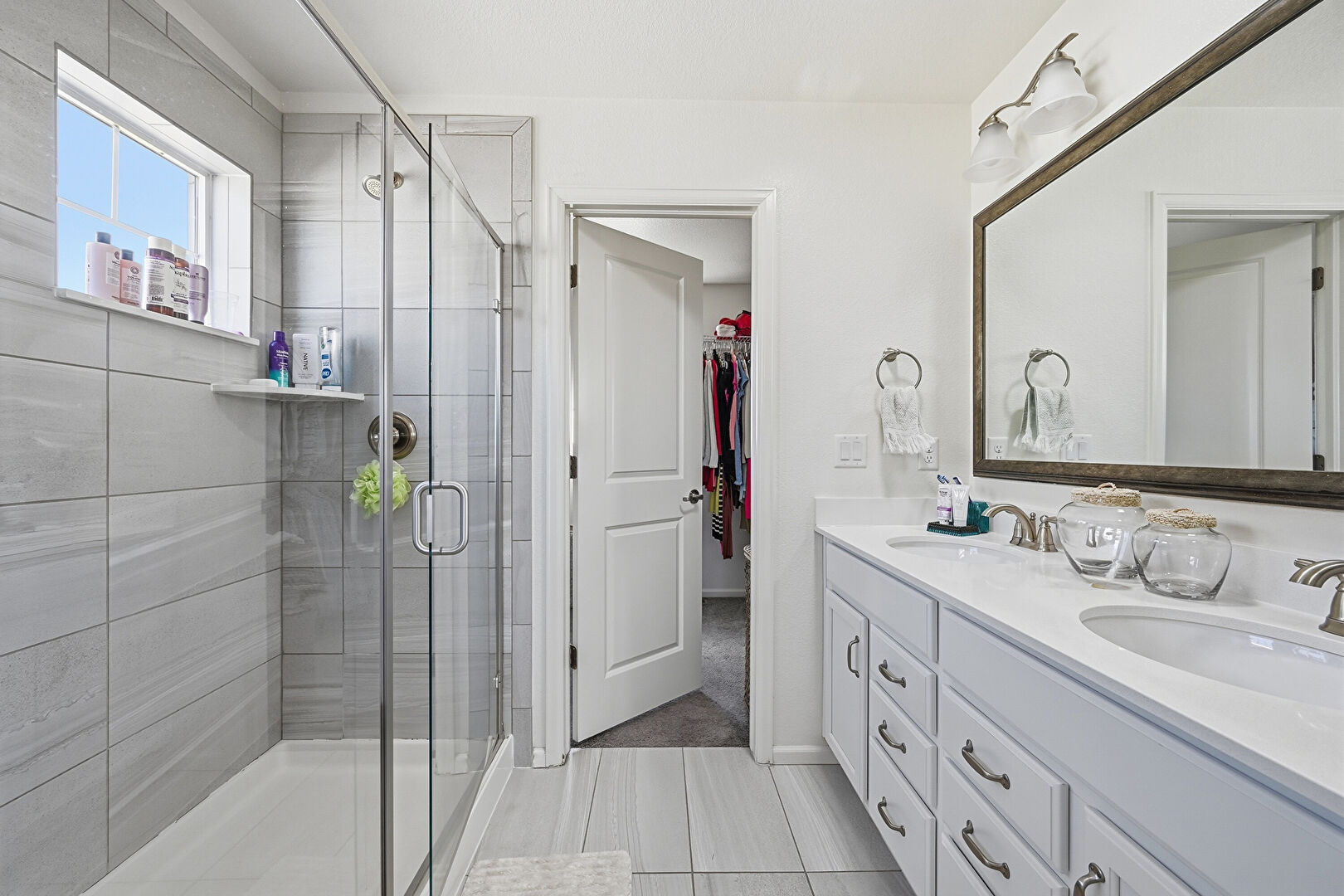 Baseboards Wall, Double Vanity, Drywall, Ensuite Bathroom, Full Bathroom, Natural Light, Tile Floor, Vent, Walk In Closet, Baseboards Wall, Double Vanity