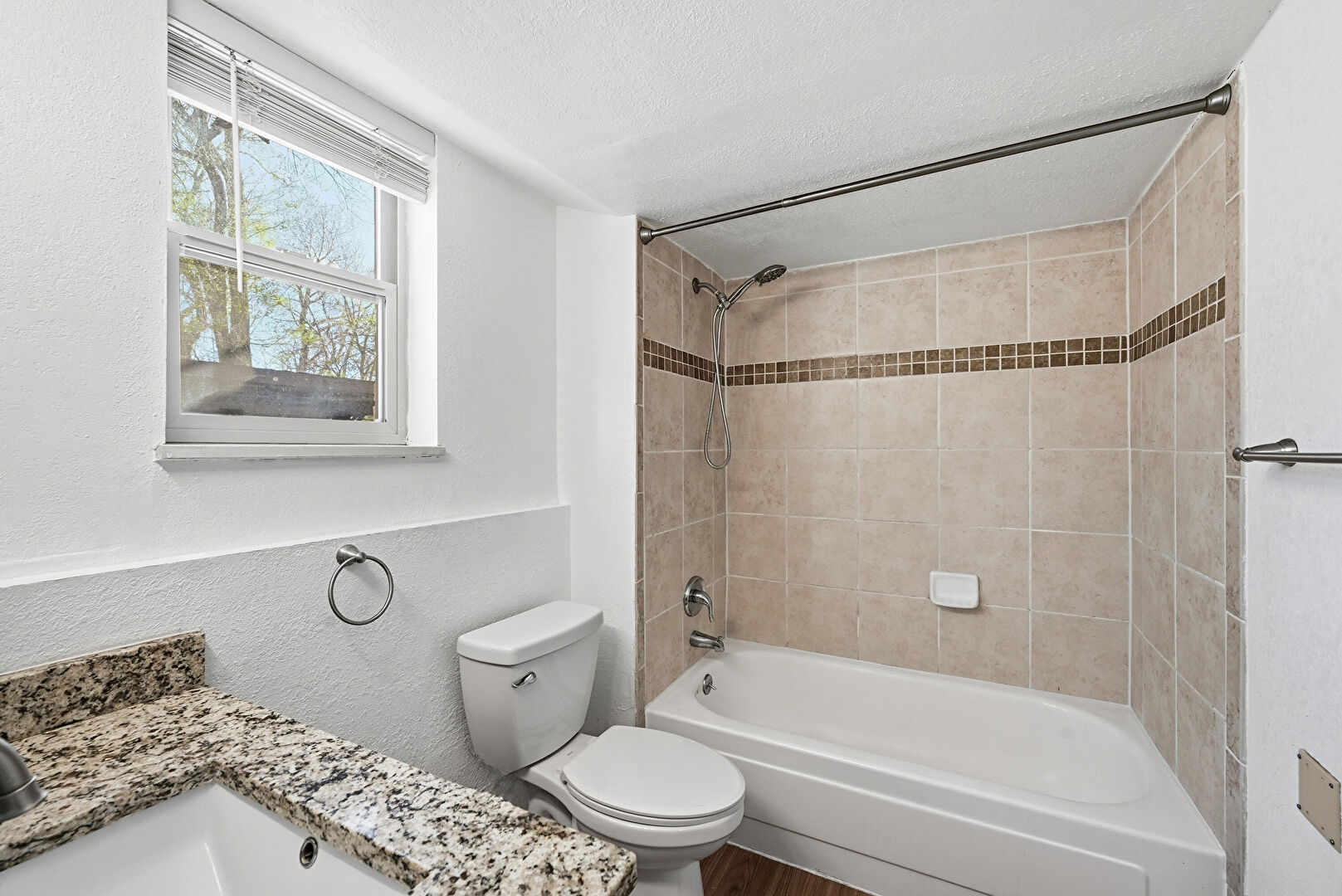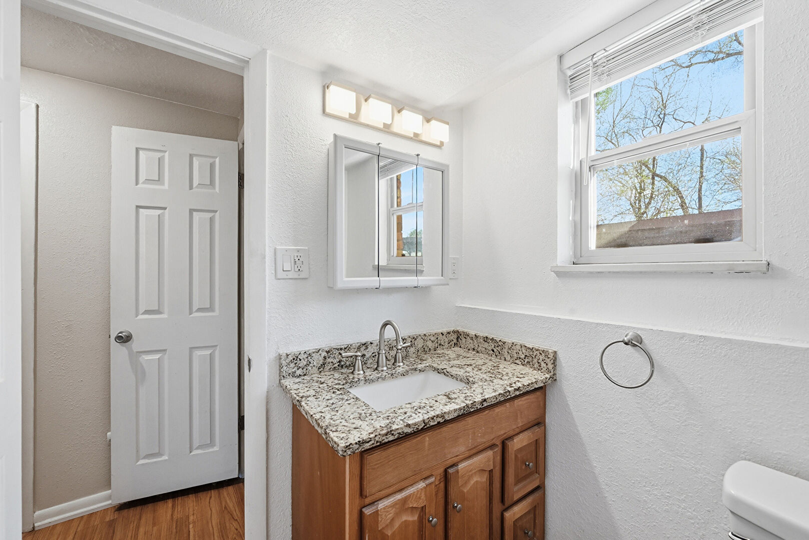 Baseboards Wall, Combined Bath Shower, Natural Light, Textured Ceiling, Textured Wall, Vanity, Wood Finish Floor, Full Bathroom, Half Bathroom