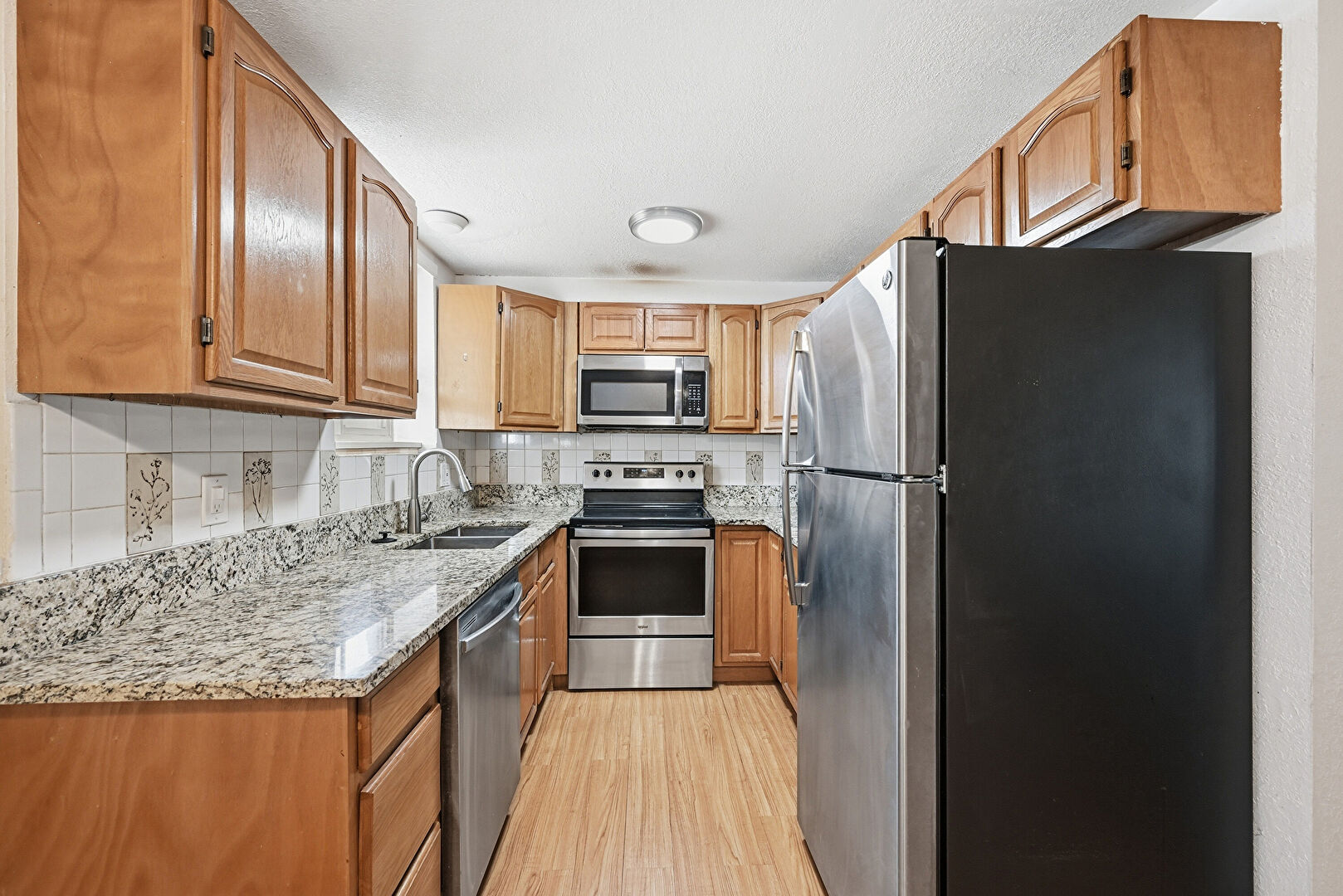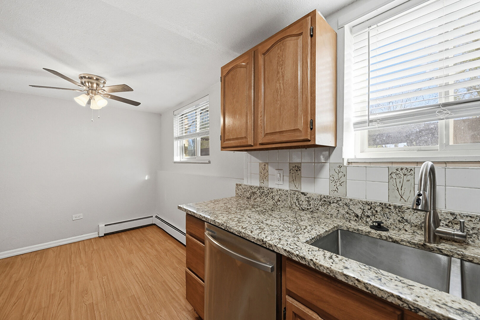 Arched Cabinets, Baseboard Radiator, Baseboards Wall, Ceiling Fan, Drywall, Medium Brown Cabinets, Natural Light, Raised Cabinets, Stone Countertops, Textured Ceiling, Textured Wall, U Shaped Kitchen, Visible Hinge Cabinets, Wood Finish Floor, Medium Brown Cabinets, Natural Light, Raised Cabinets