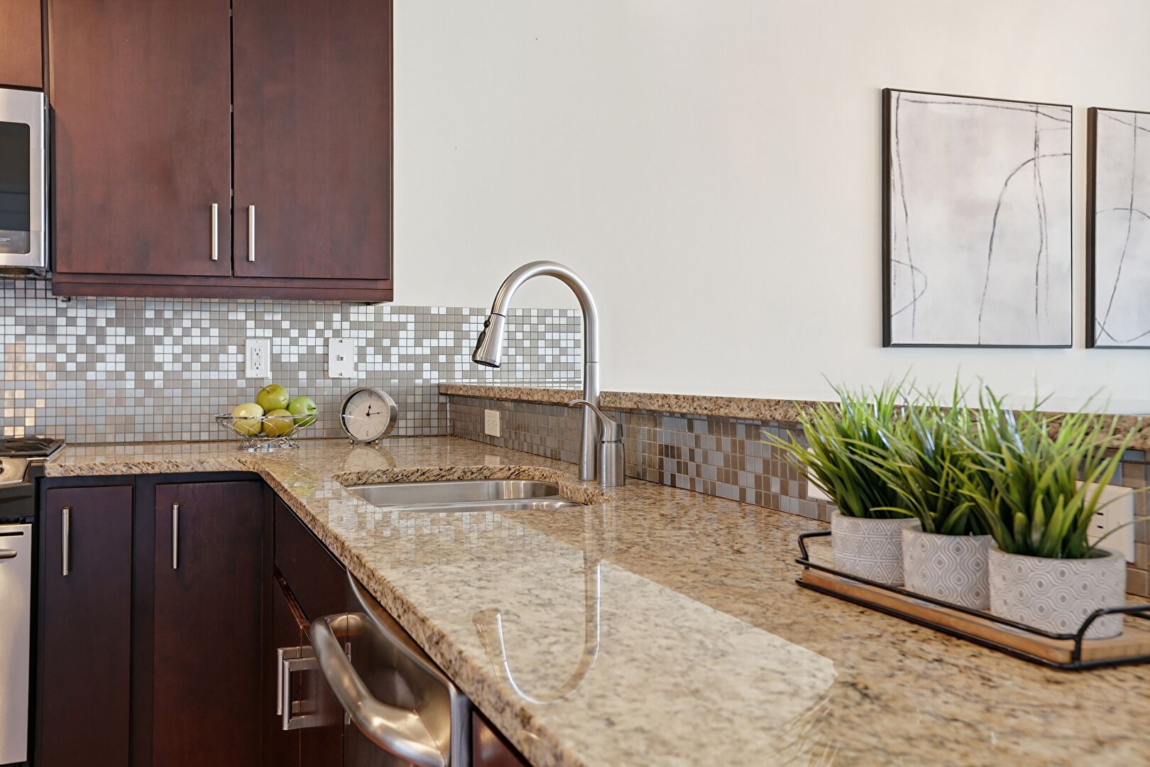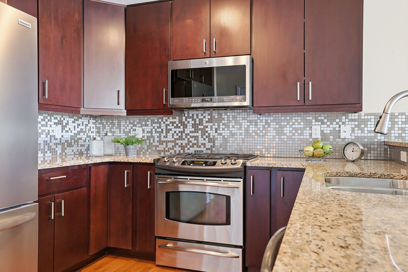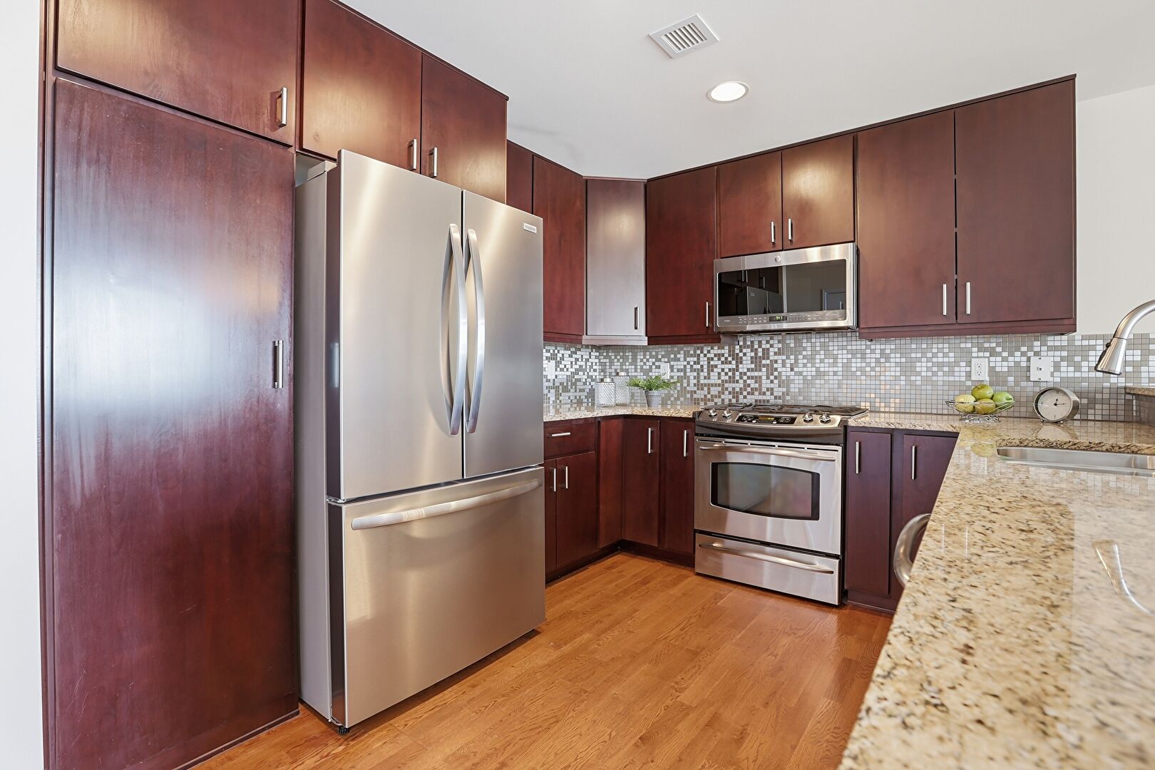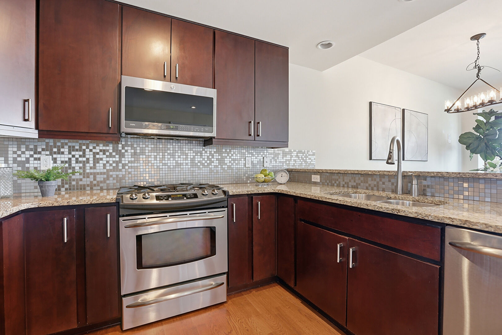 Dark Brown Cabinets, Drywall, Kitchen Peninsula, Notable Chandelier, Recessed Lighting, Stone Countertops, U Shaped Kitchen, Vent, Wood Finish Floor, Drywall, Flat Panel Cabinets, Pendant Lighting, Stone Countertops