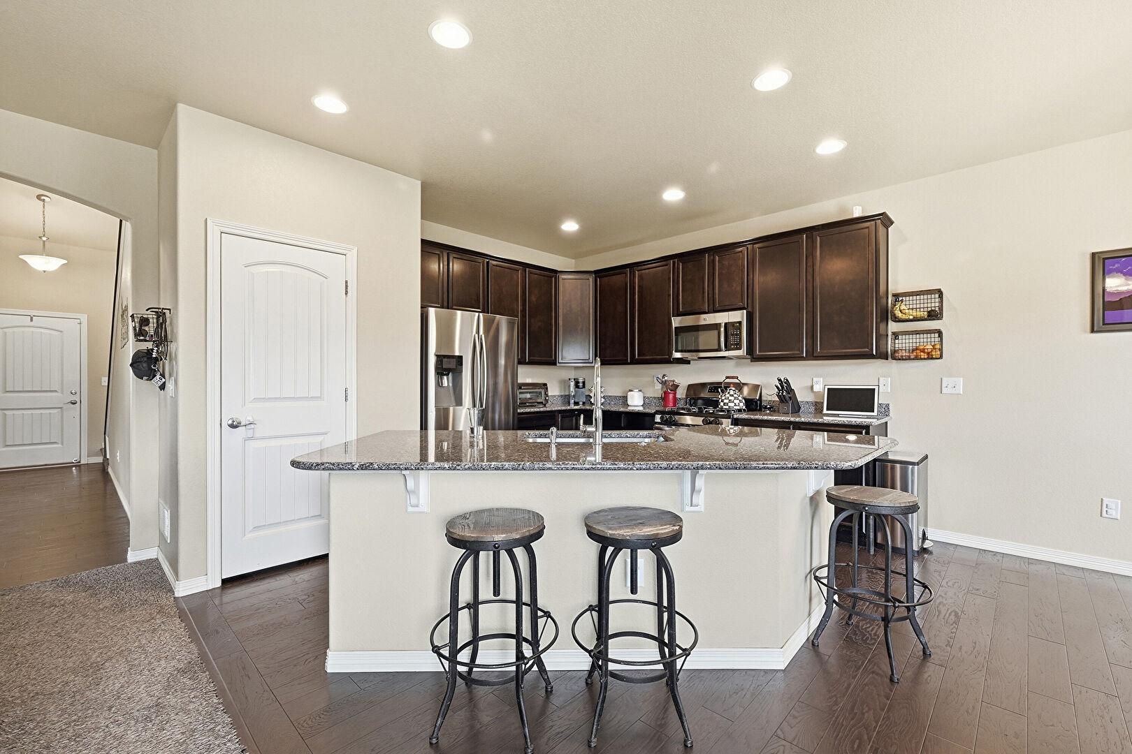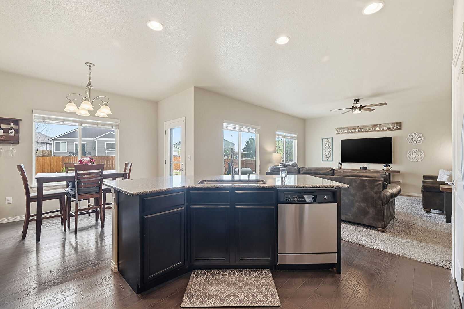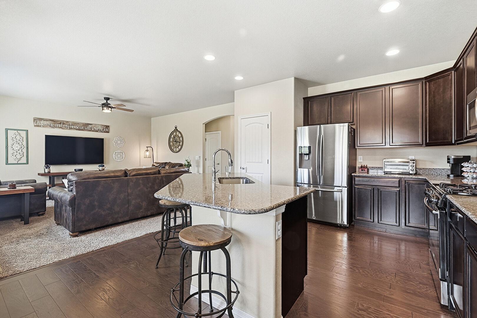 Arched Walkways, Baseboards Wall, Black Cabinets, Ceiling Fan, Crown Molding Cabinets, Dark Brown Cabinets, Drywall, Kitchen Bar, Kitchen Island, L Shaped Kitchen, Natural Light, Notable Chandelier, Opens To Living Area, Pendant Lighting, Recessed Lighting, Shaker Cabinets, Stone Countertops, Textured Ceiling, Toaster, Wood Finish Floor, Ceiling Fan, Shaker Cabinets, Stone Countertops