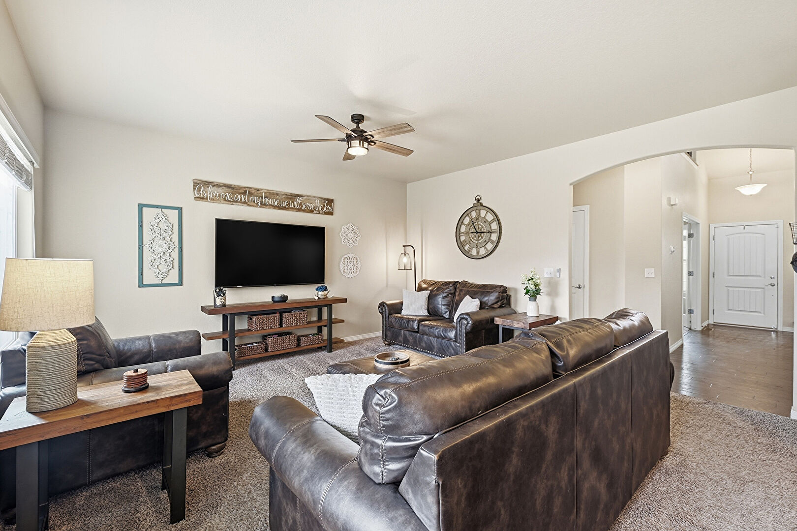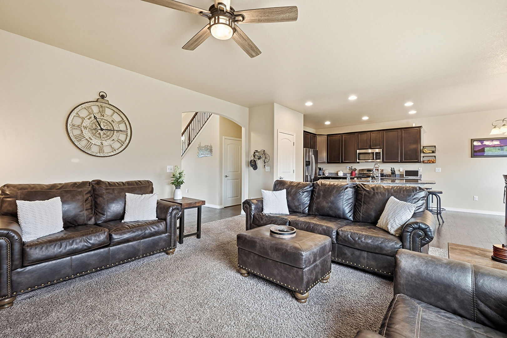 Arched Walkways, Baseboards Wall, Carpet, Ceiling Fan, Drywall, L Shaped Kitchen, Natural Light, Notable Chandelier, Recessed Lighting, Stairs, Vent, Baseboards Wall, Ceiling Fan, Recessed Lighting