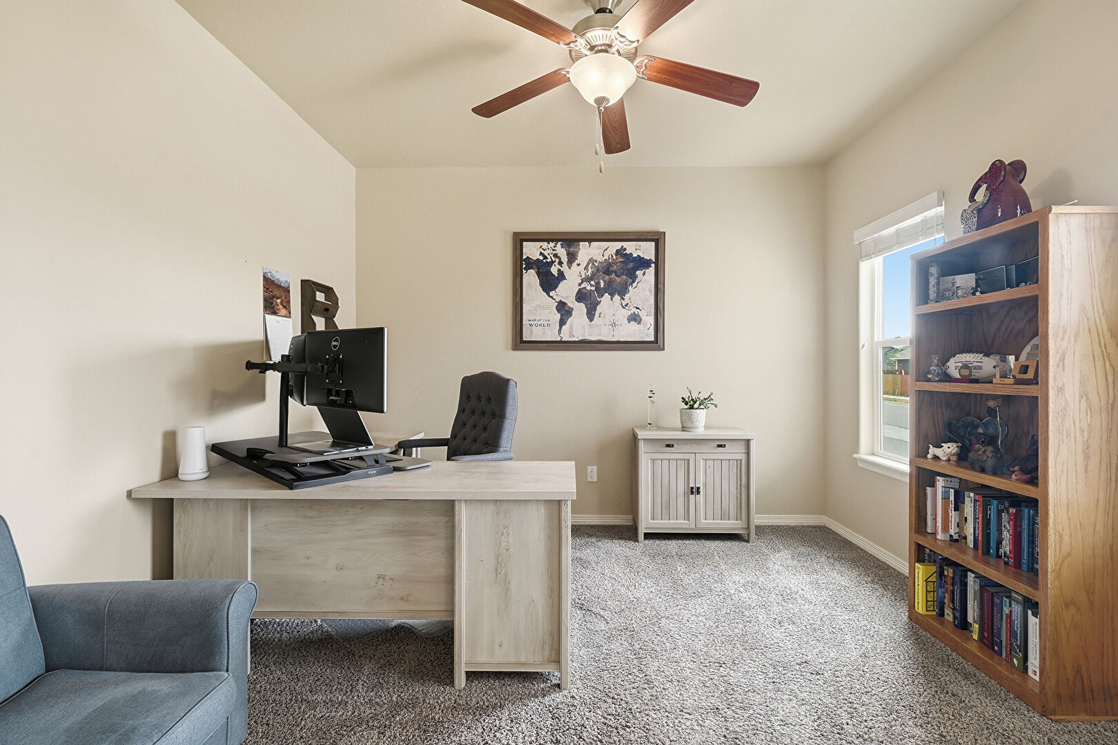 Baseboards Wall, Carpet, Ceiling Fan, Drywall, Natural Light, Office Area, Carpet, French Doors
