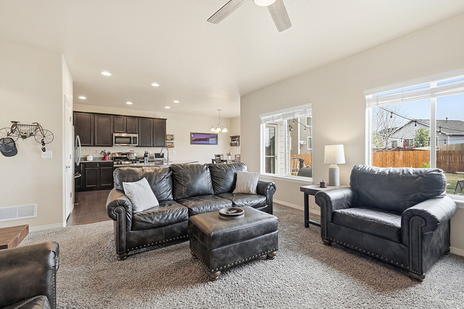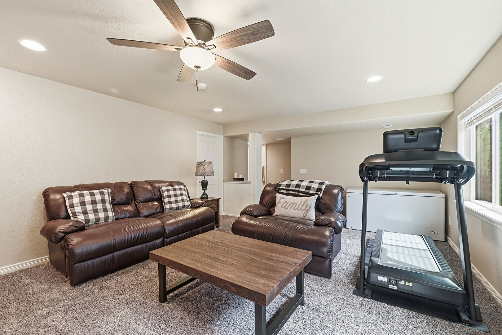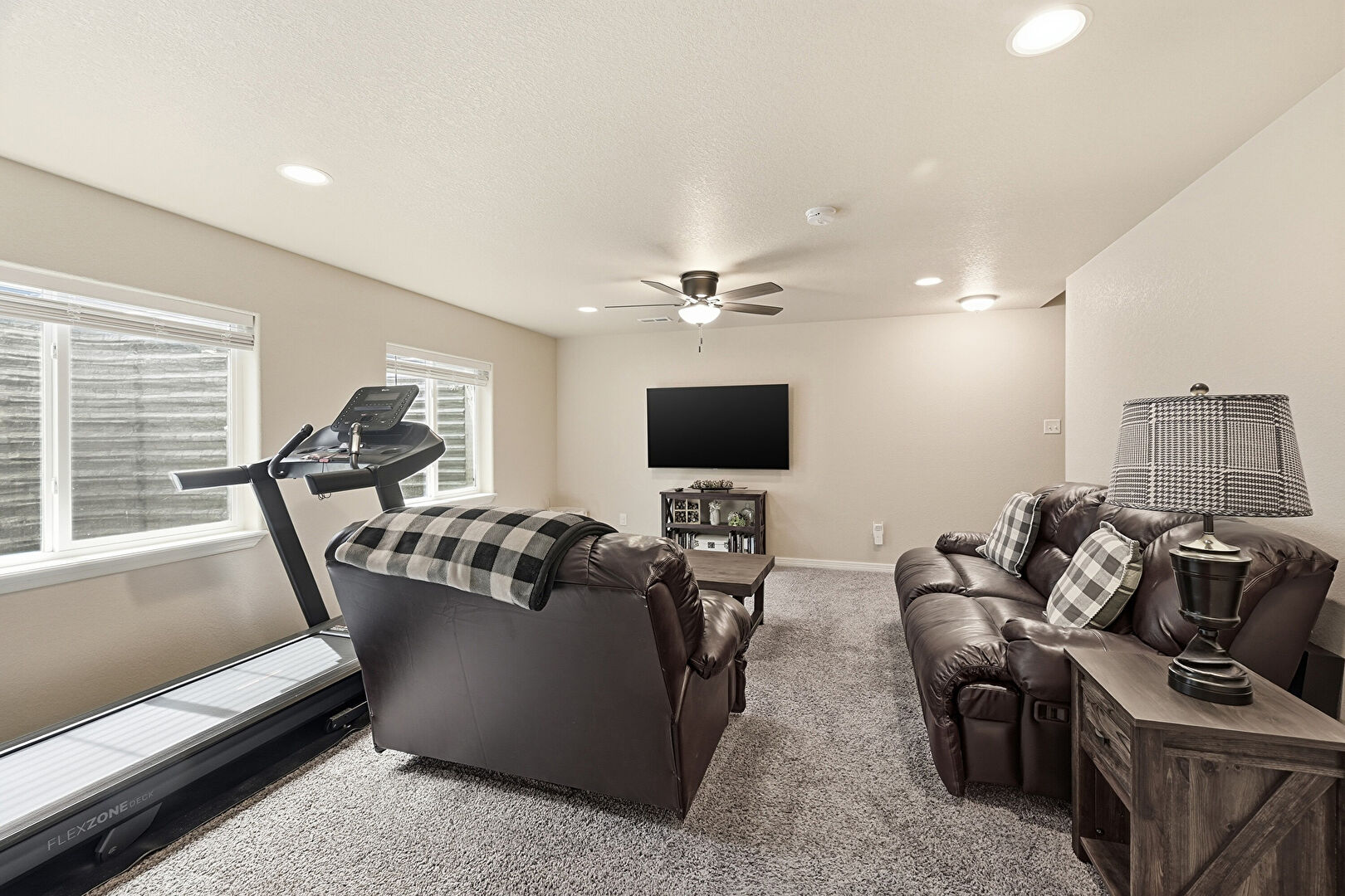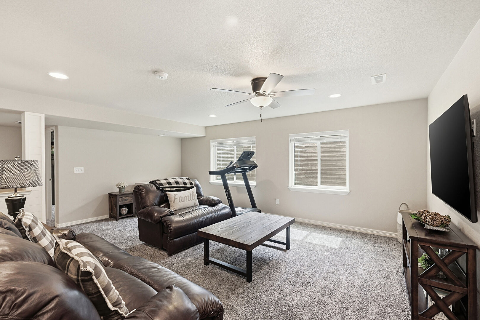 Baseboards Wall, Carpet, Ceiling Fan, Drywall, Natural Light, Recessed Lighting, Smoke Carbon Monoxide Detector, Textured Ceiling, Vent, Carpet, Recessed Lighting