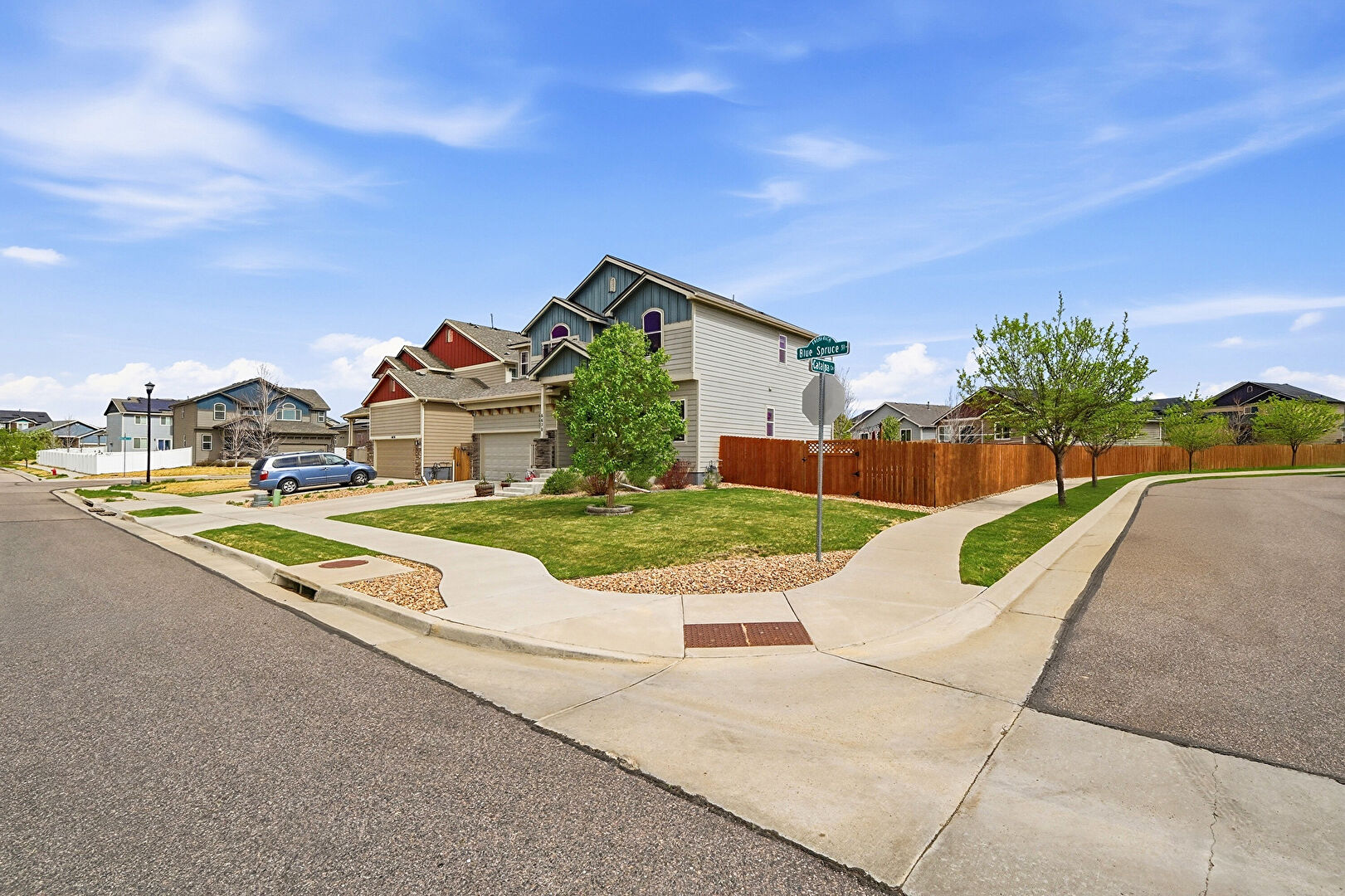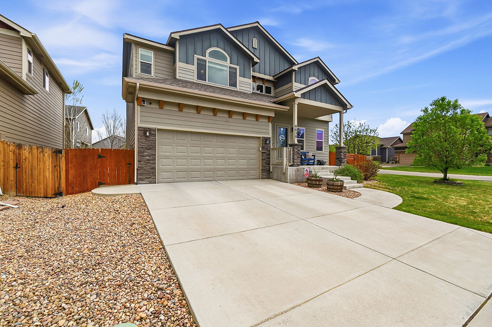 Board Batten Siding, Built In Garage, Downspout, Driveway, Fence, Gate, Gutters, Horizontal Siding, Lawn, Porch, Residential View, Shingle Roof, Stone Siding, Vertical Siding, Water Meter, Fence, Garage, Gutters, Porch