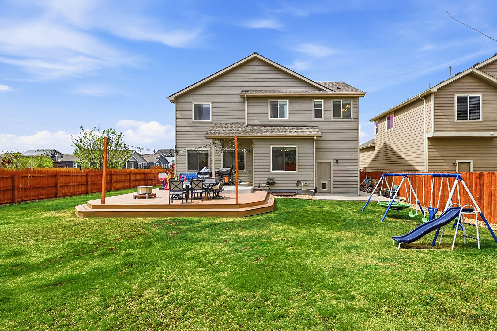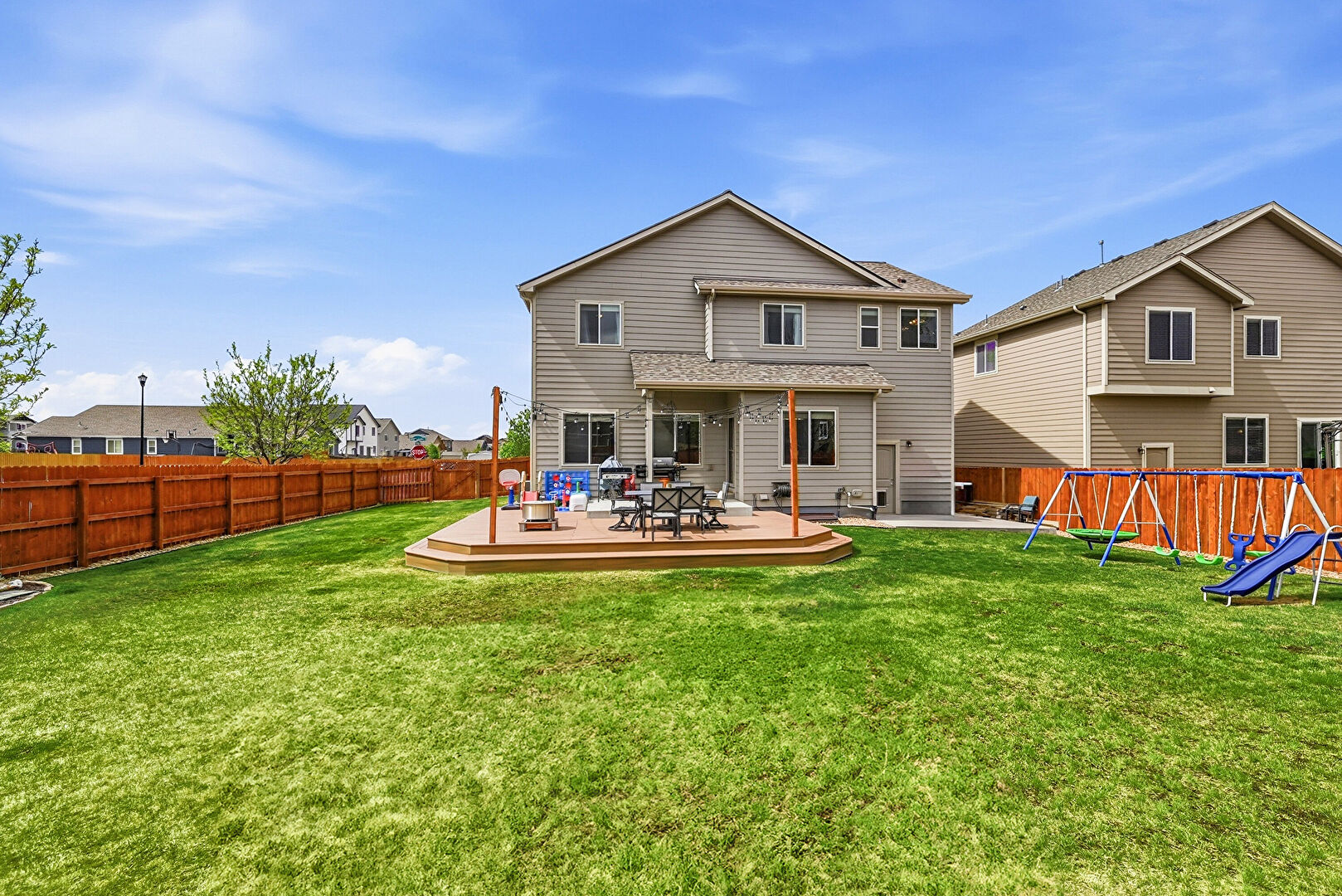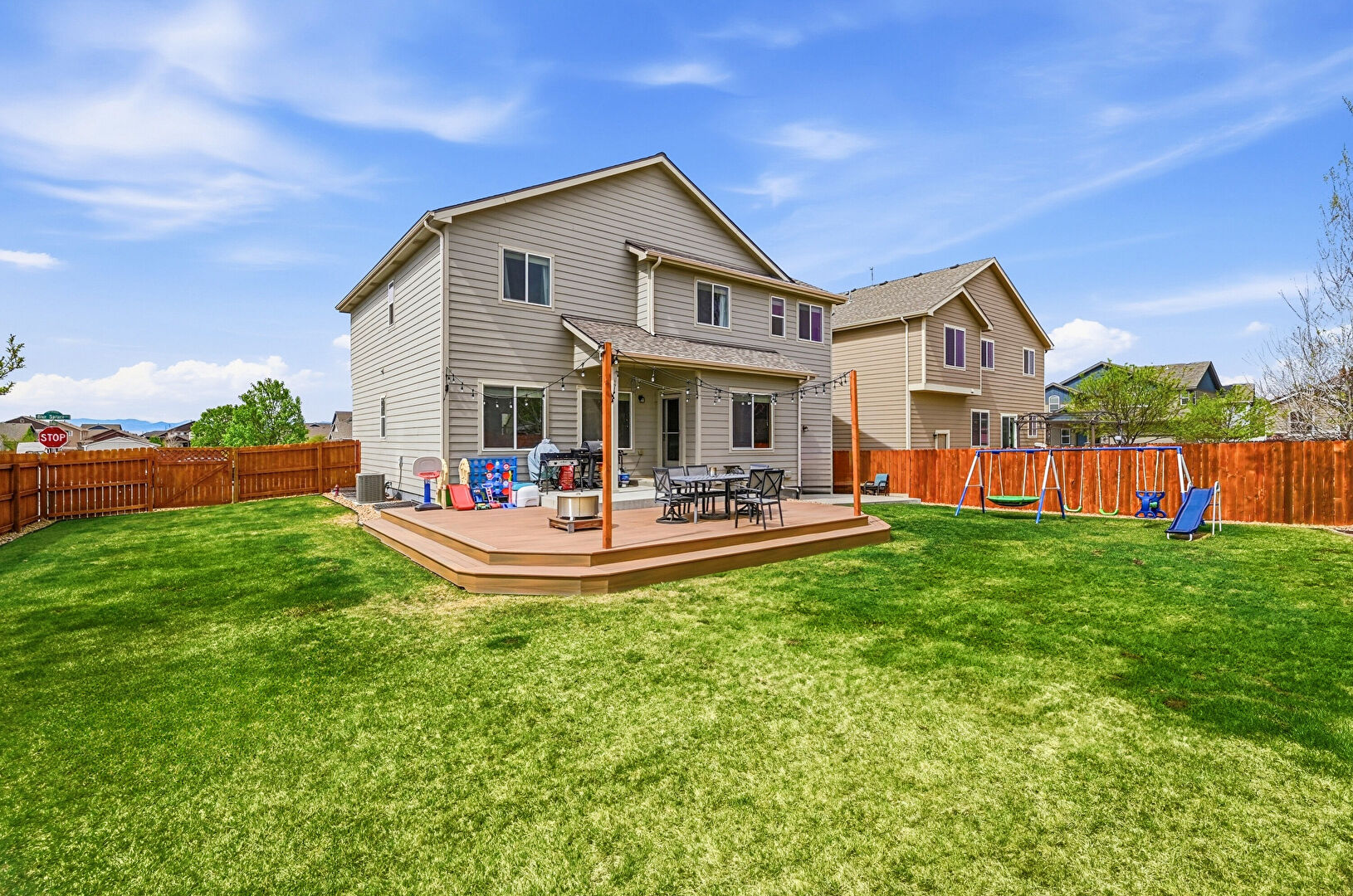 Concrete Foundation, Deck, Downspout, Fence, Gutters, Horizontal Siding, Lawn, Outdoor Dining Area, Patio, Playground, Residential View, Shingle Roof, Central Ac, Concrete Foundation, Deck