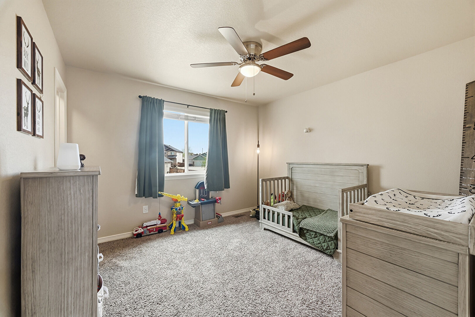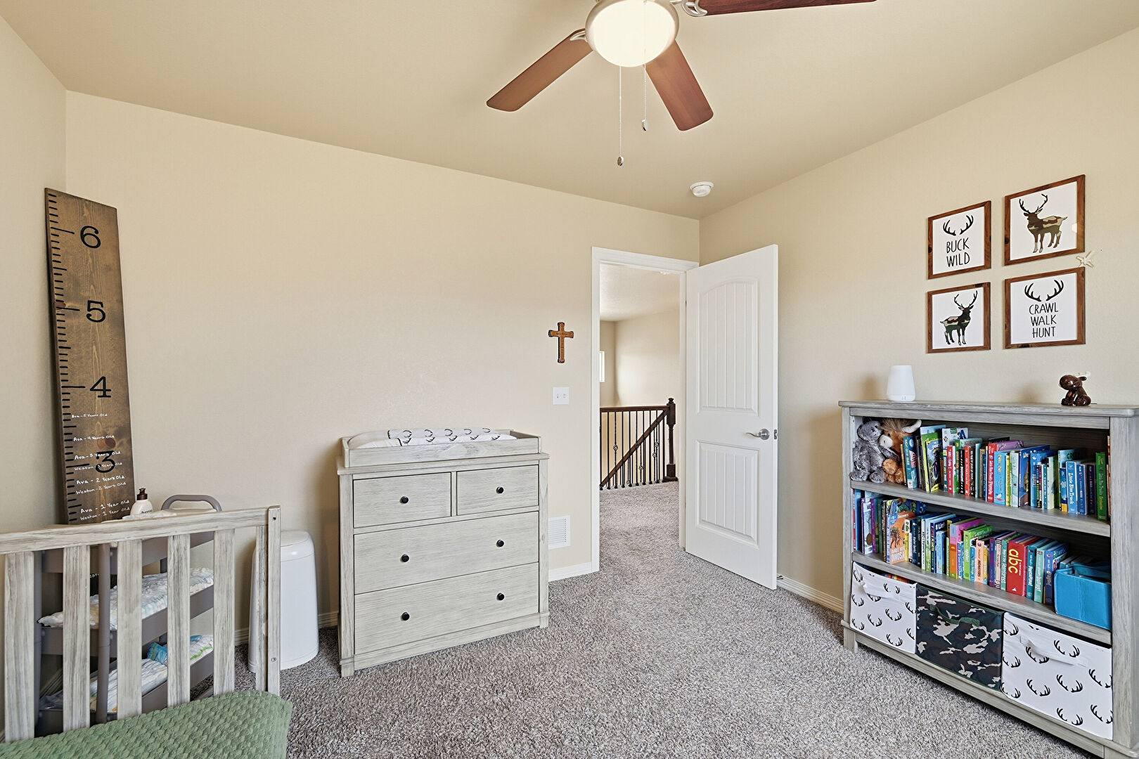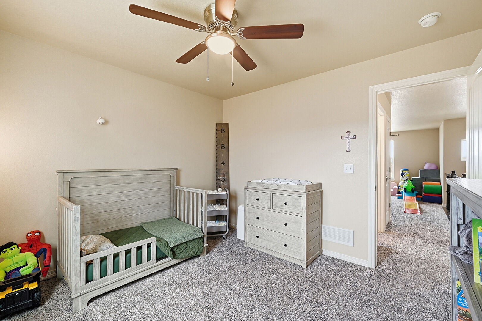 Baseboards Wall, Carpet, Ceiling Fan, Drywall, Nursery, Smoke Carbon Monoxide Detector, Vent, Drywall, Natural Light, Smoke Carbon Monoxide Detector