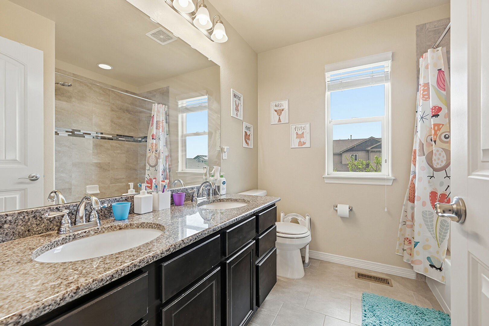 Baseboards Wall, Double Vanity, Drywall, Full Bathroom, Natural Light, Tile Floor, Vent, Combined Bath Shower