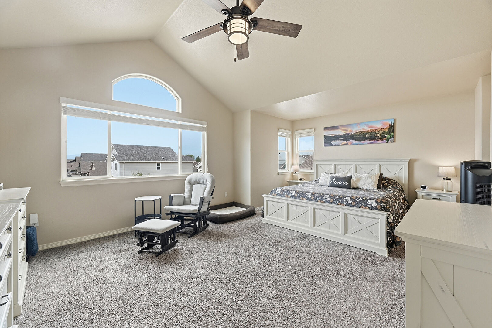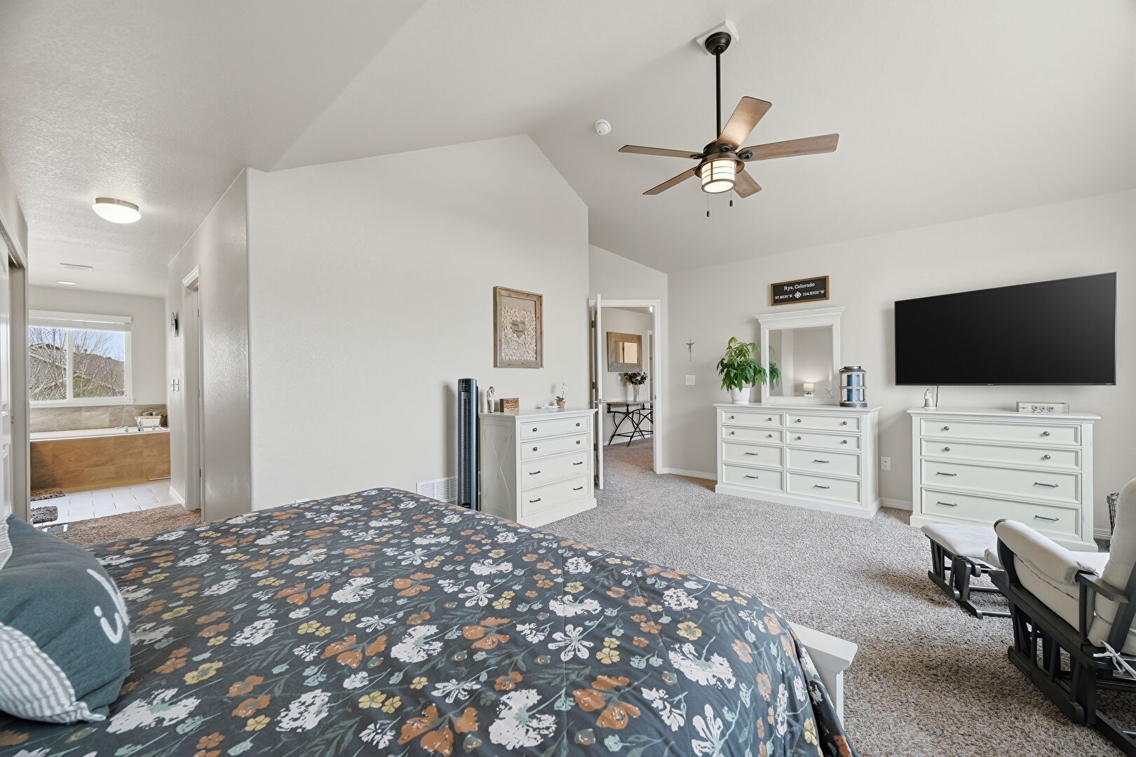 Baseboards Wall, Carpet, Cathedral Ceiling, Ceiling Fan, Drywall, Ensuite Bathroom, High Ceiling, Natural Light, Vaulted Ceiling, Baseboards Wall, Carpet, Natural Light, Vaulted Ceiling