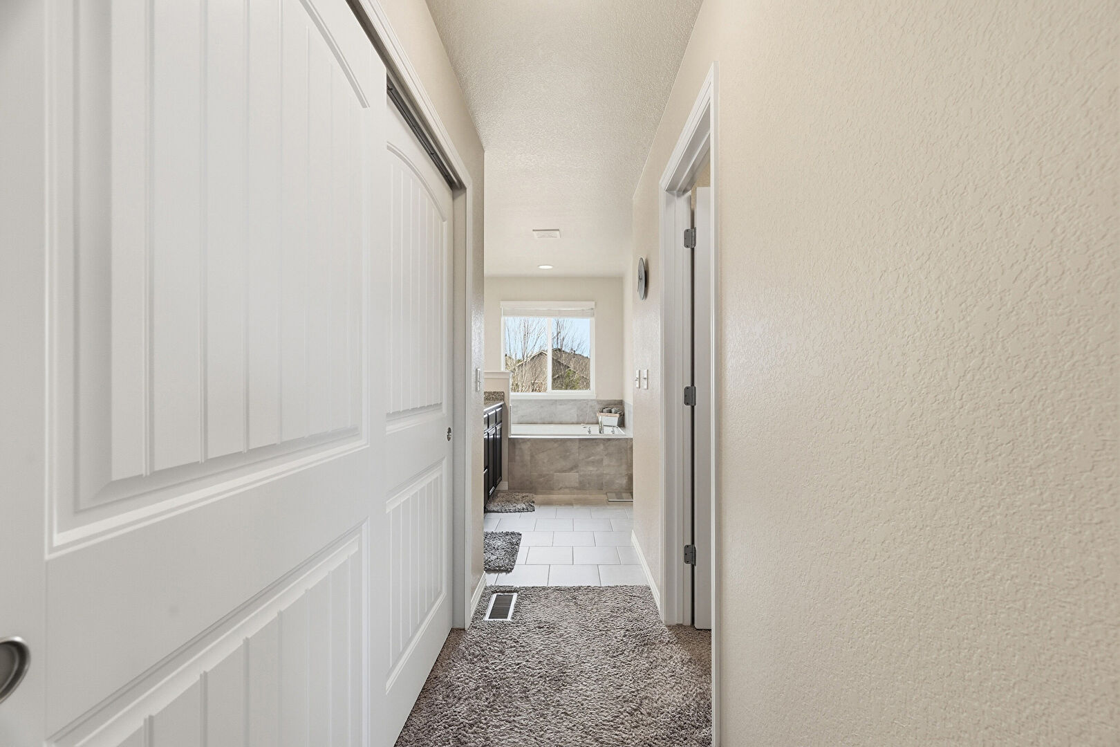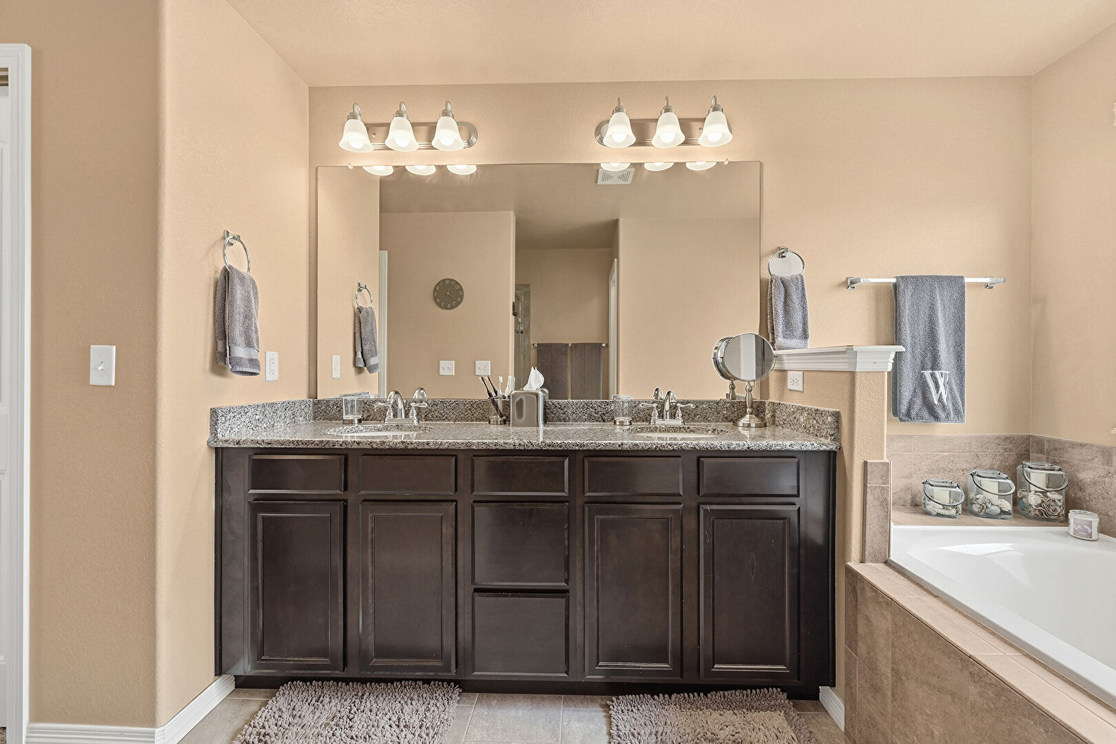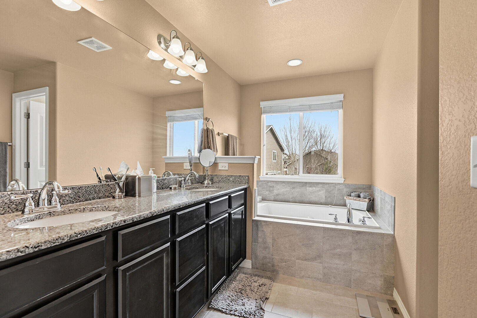 Carpet, Double Vanity, Drywall, Full Bathroom, Natural Light, Recessed Lighting, Textured Wall, Tile Floor, Vent, Baseboards Wall, Tile Floor