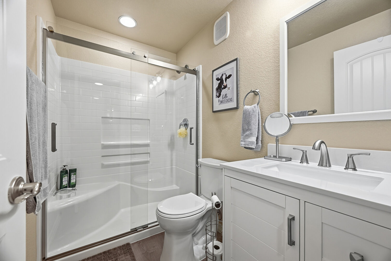 Recessed Lighting, Textured Wall, Vanity, Vent, Wood Finish Floor, Full Bathroom
