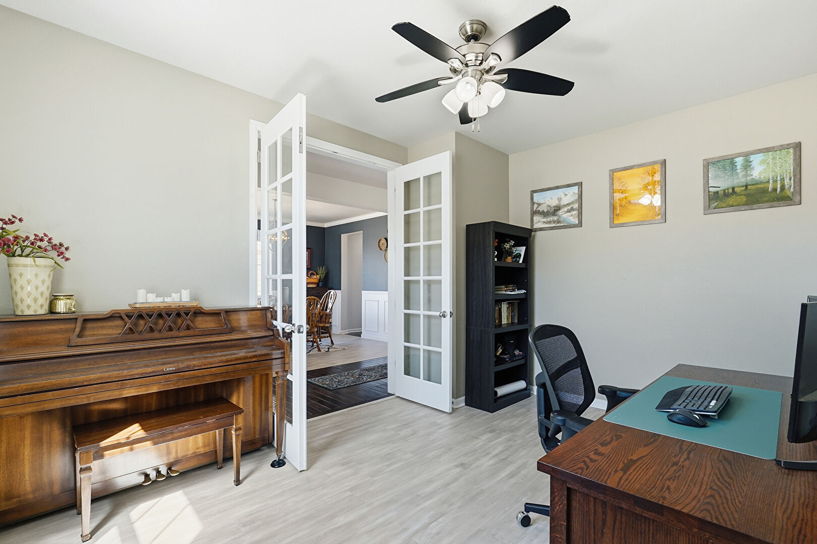 Baseboards Wall, Built In Shelves, Ceiling Fan, Drywall, French Doors, Office Area, Wood Finish Floor, Ceiling Fan, Drywall, Natural Light