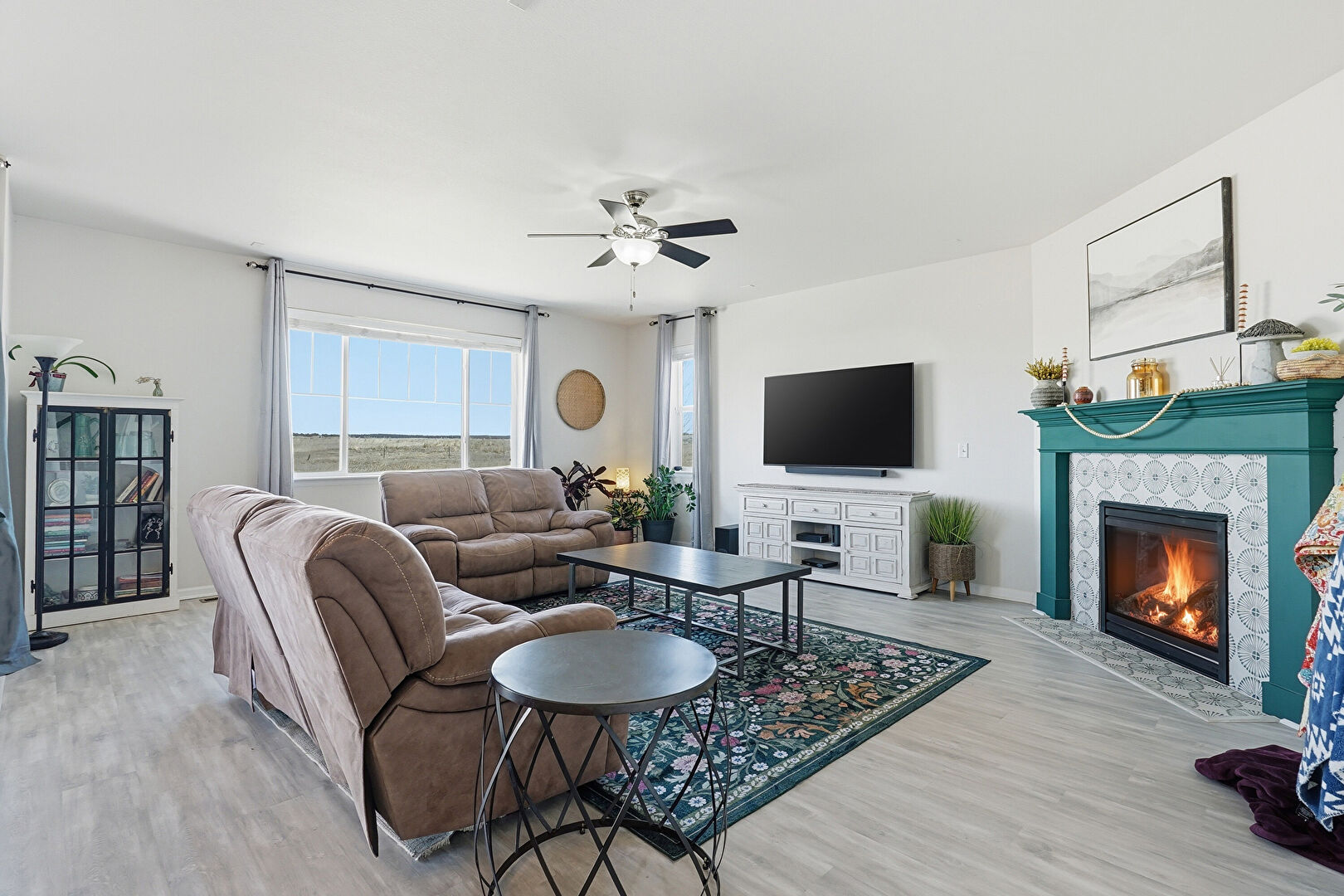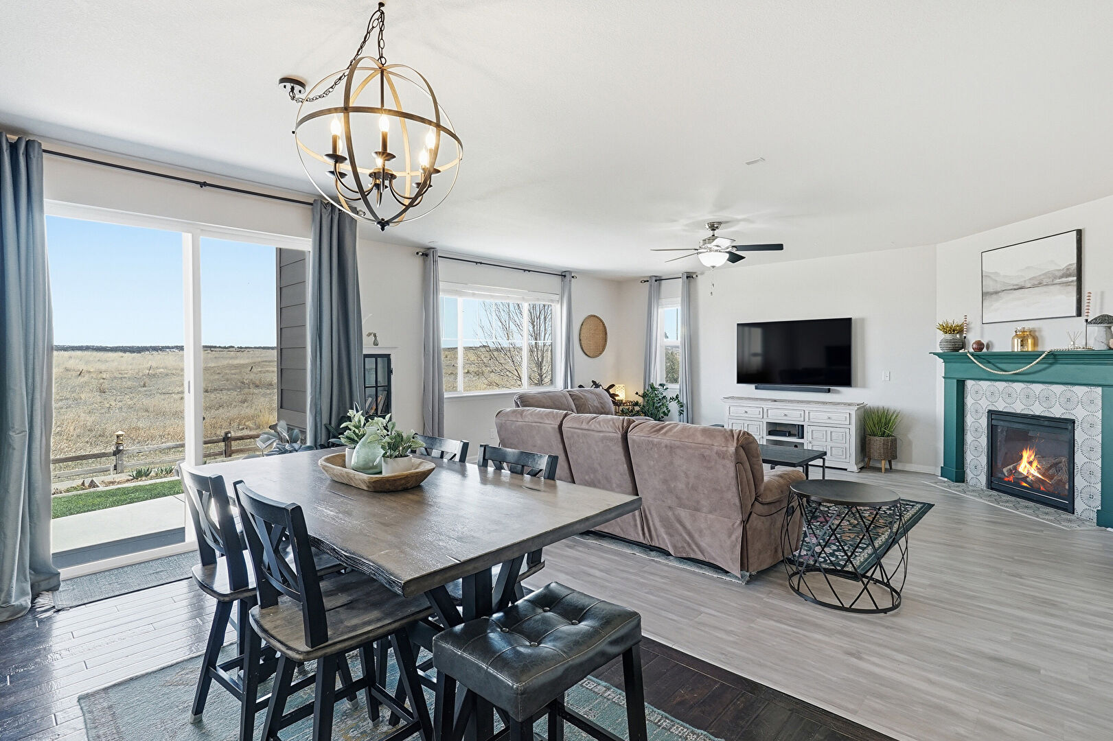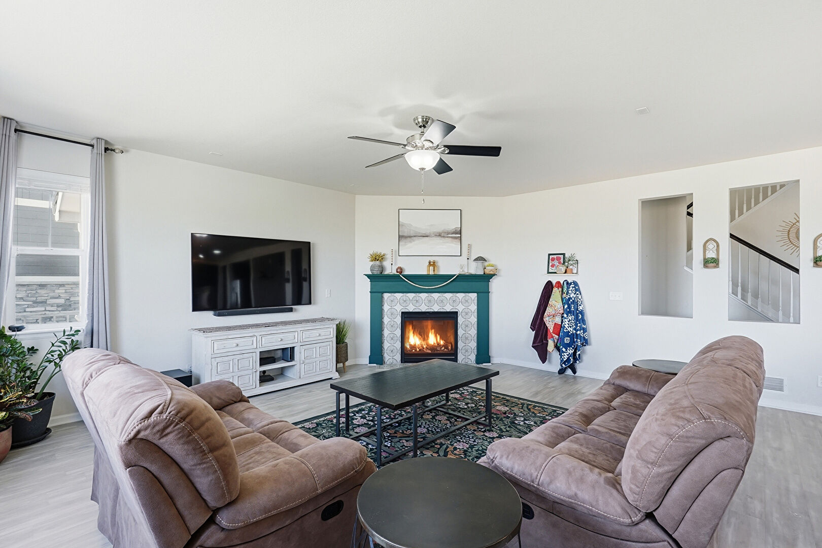 Baseboards Wall, Ceiling Fan, Drywall, Fireplace, L Shaped Kitchen, Natural Light, Notable Chandelier, Stairs, Vent, Wood Finish Floor, Ceiling Fan, Drywall, Fireplace, Recessed Lighting