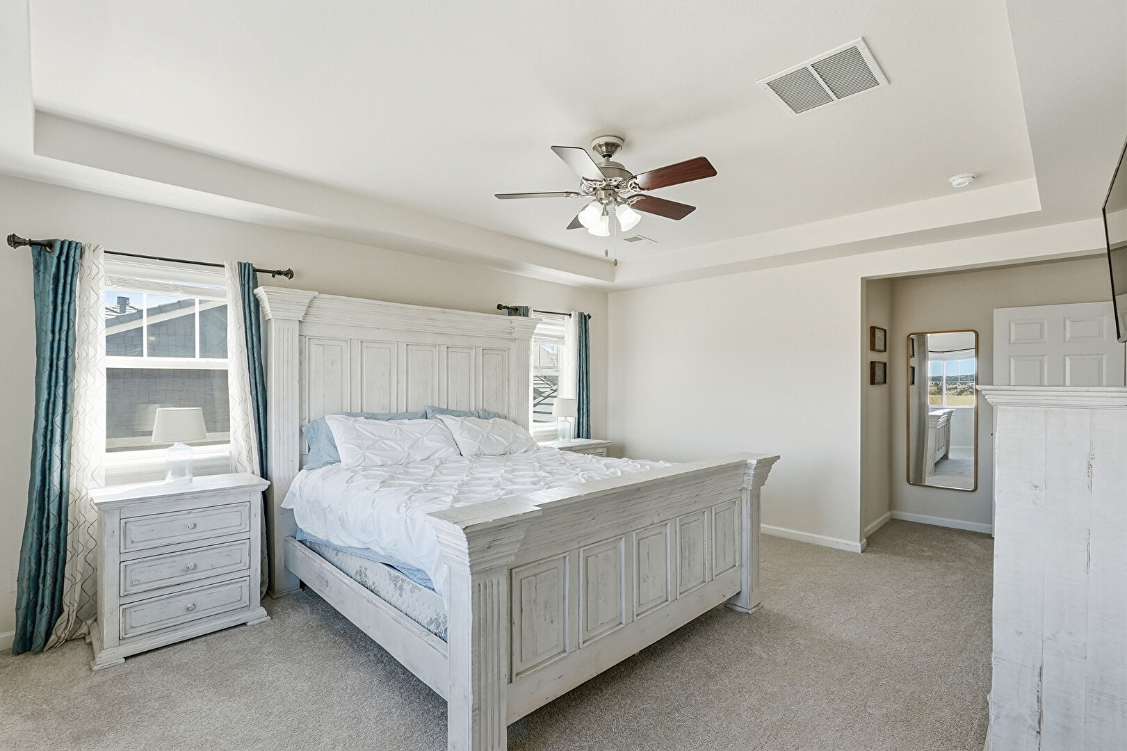 Baseboards Wall, Carpet, Ceiling Fan, Drywall, Ensuite Bathroom, Natural Light, Tray Ceiling, Vent, Baseboards Wall, Drywall, Tray Ceiling