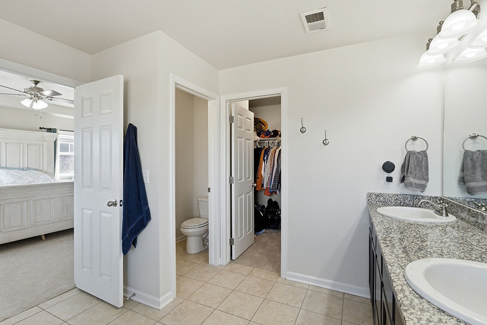 Baseboards Wall, Carpet, Ceiling Fan, Double Vanity, Drywall, Ensuite Bathroom, Full Bathroom, Natural Light, Tile Floor, Vent, Walk In Closet, Water Closet, Double Vanity, Full Bathroom, Tile Floor