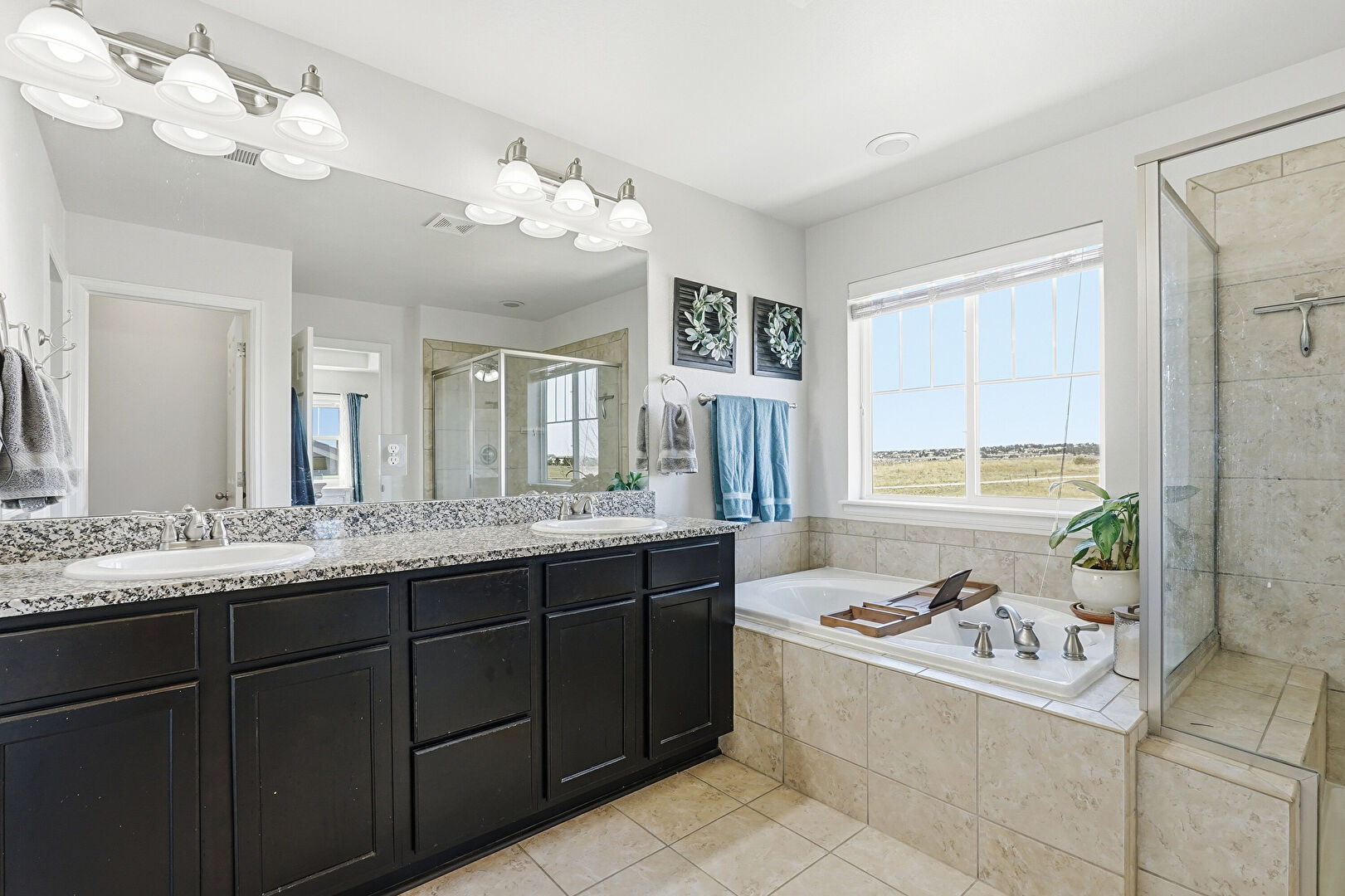 Combined Bath Shower, Double Vanity, Drywall, Recessed Lighting, Tile Floor, Full Bathroom
