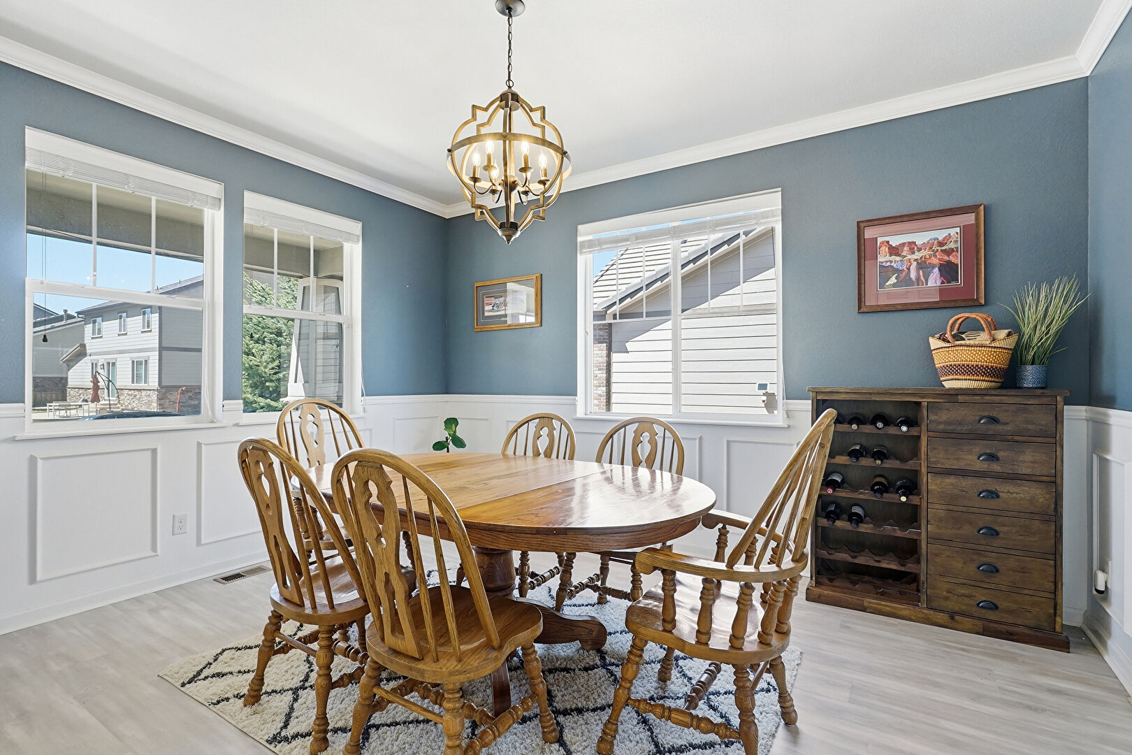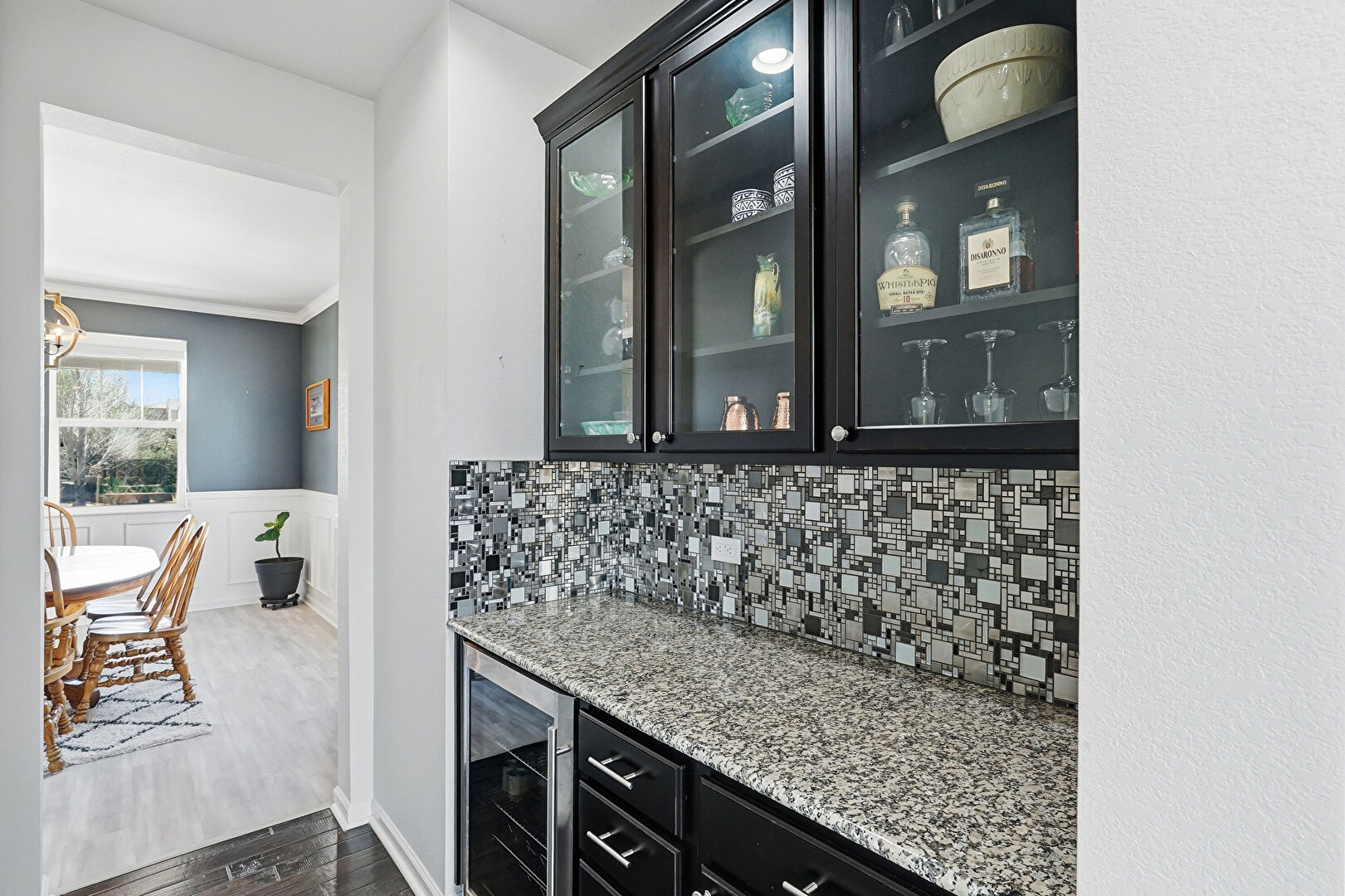 Black Cabinets, Crown Molding, Crown Molding Cabinets, Drywall, Glass Insert Cabinets, Indoor Bar, Natural Light, Shaker Cabinets, Stone Countertops, Wainscot Wall, Wine Cooler, Wood Finish Floor, Baseboards Wall