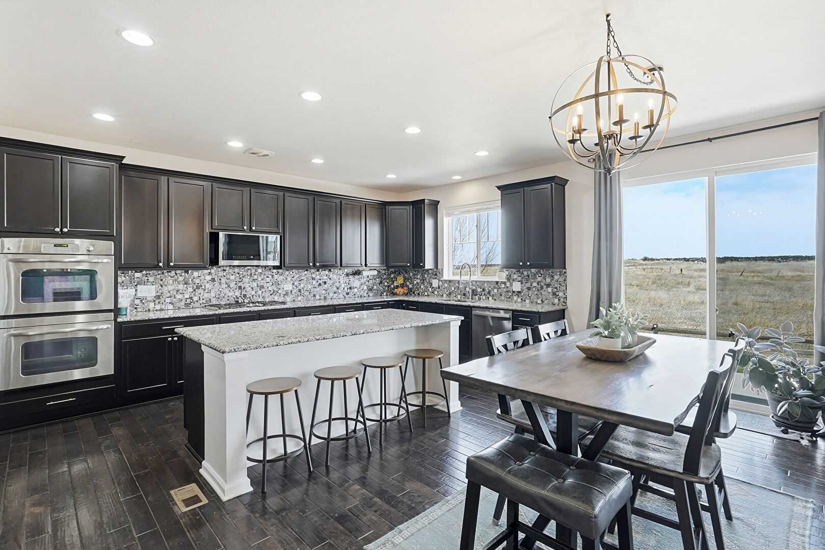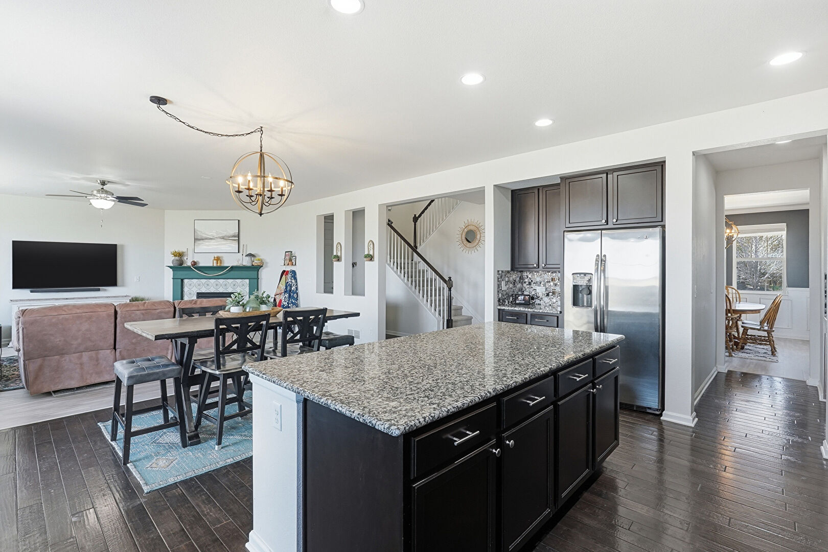 Baseboards Wall, Black Cabinets, Ceiling Fan, Crown Molding Cabinets, Dark Brown Cabinets, Double Oven, Drywall, Fireplace, Kitchen Bar, Kitchen Island, L Shaped Kitchen, Natural Light, Notable Chandelier, Opens To Living Area, Pendant Lighting, Recessed Lighting, Shaker Cabinets, Stone Countertops, Vent, Wood Finish Floor, Black Cabinets, Kitchen Bar, Kitchen Island