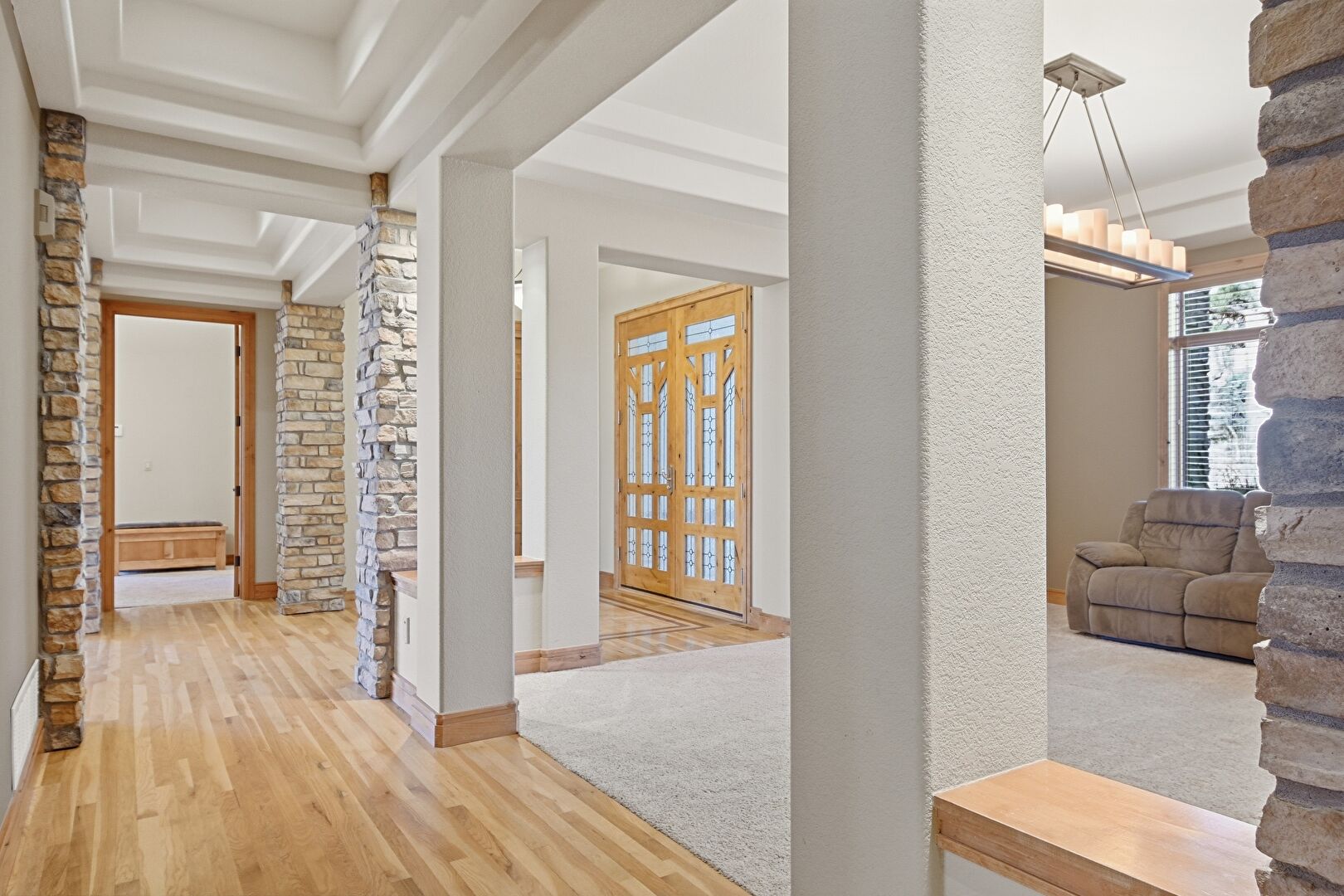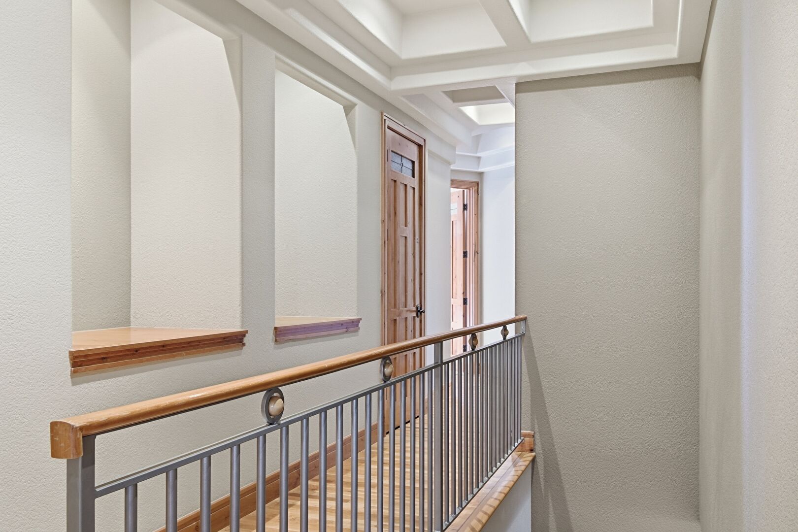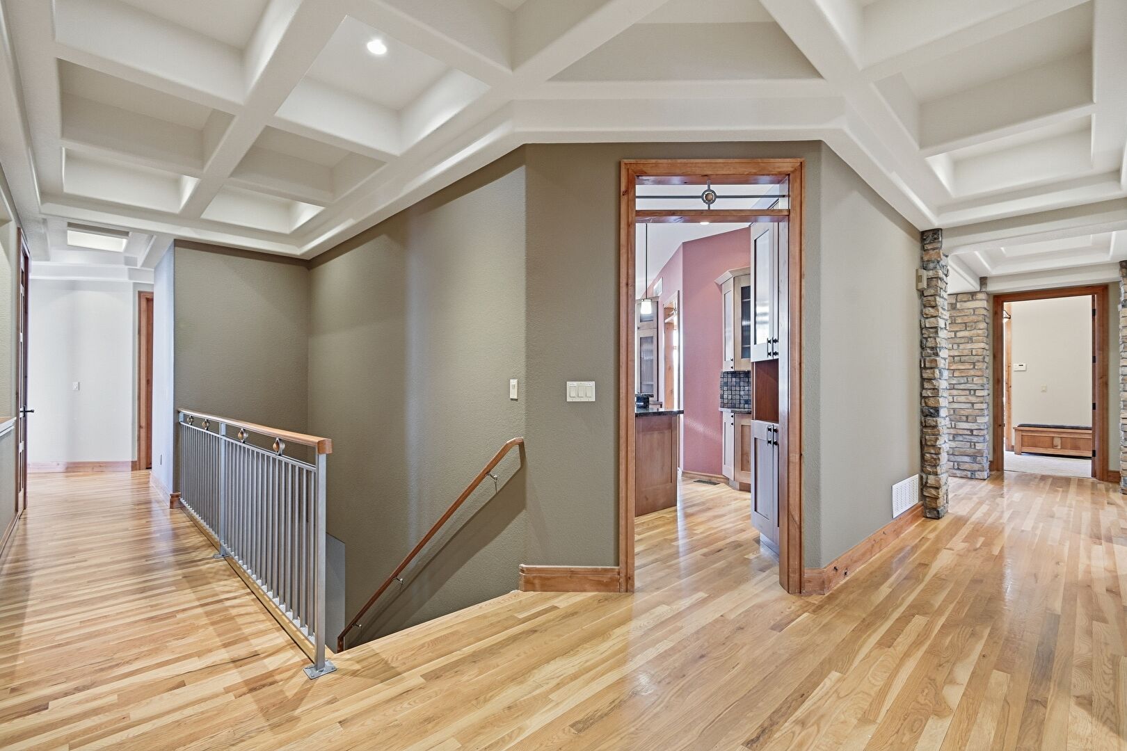 Baseboards Wall, Beamed Ceiling, Carpet, Coffered Ceiling, Drywall, French Doors, Natural Light, Notable Chandelier, Recessed Lighting, Stone Wall, Textured Wall, Tray Ceiling, Upstairs Landing, Vent, Wood Finish Floor, Baseboards Wall, Upstairs Landing, Vent, Wood Finish Floor