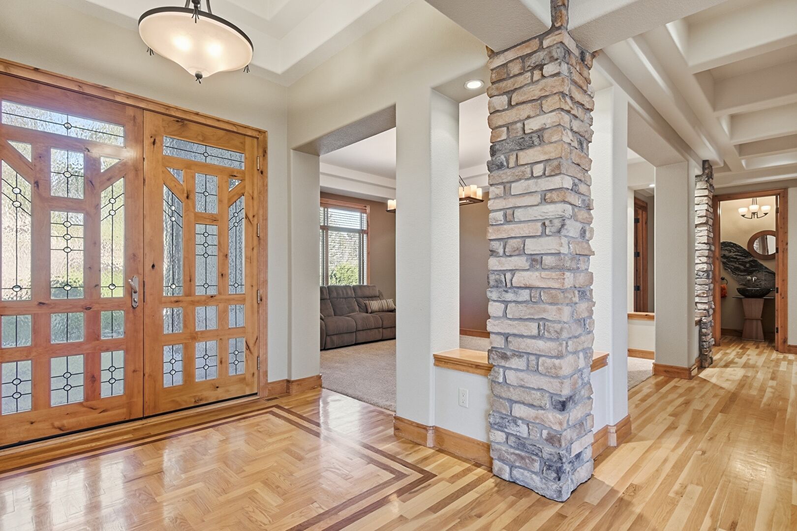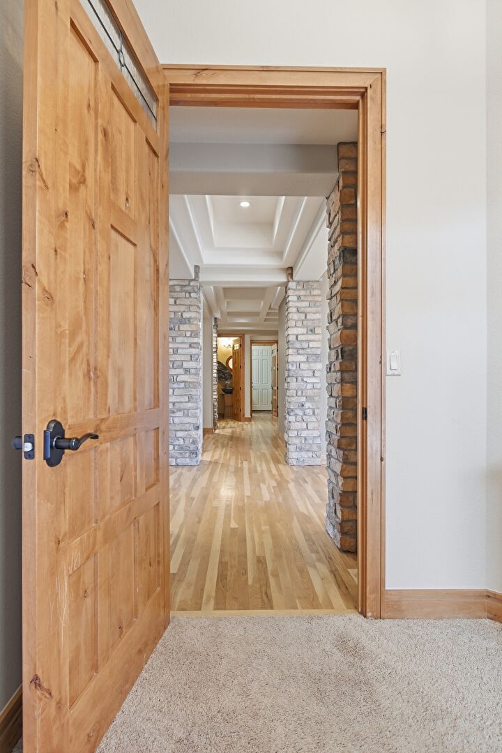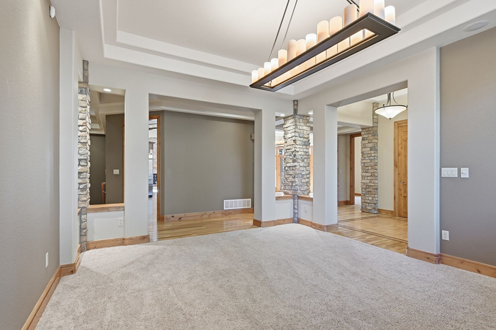 Baseboards Wall, Beamed Ceiling, Carpet, Coffered Ceiling, Drywall, French Doors, Natural Light, Notable Chandelier, Recessed Lighting, Stone Wall, Textured Wall, Tray Ceiling, Upstairs Landing, Vent, Wood Finish Floor, Baseboards Wall, Upstairs Landing, Vent, Wood Finish Floor
