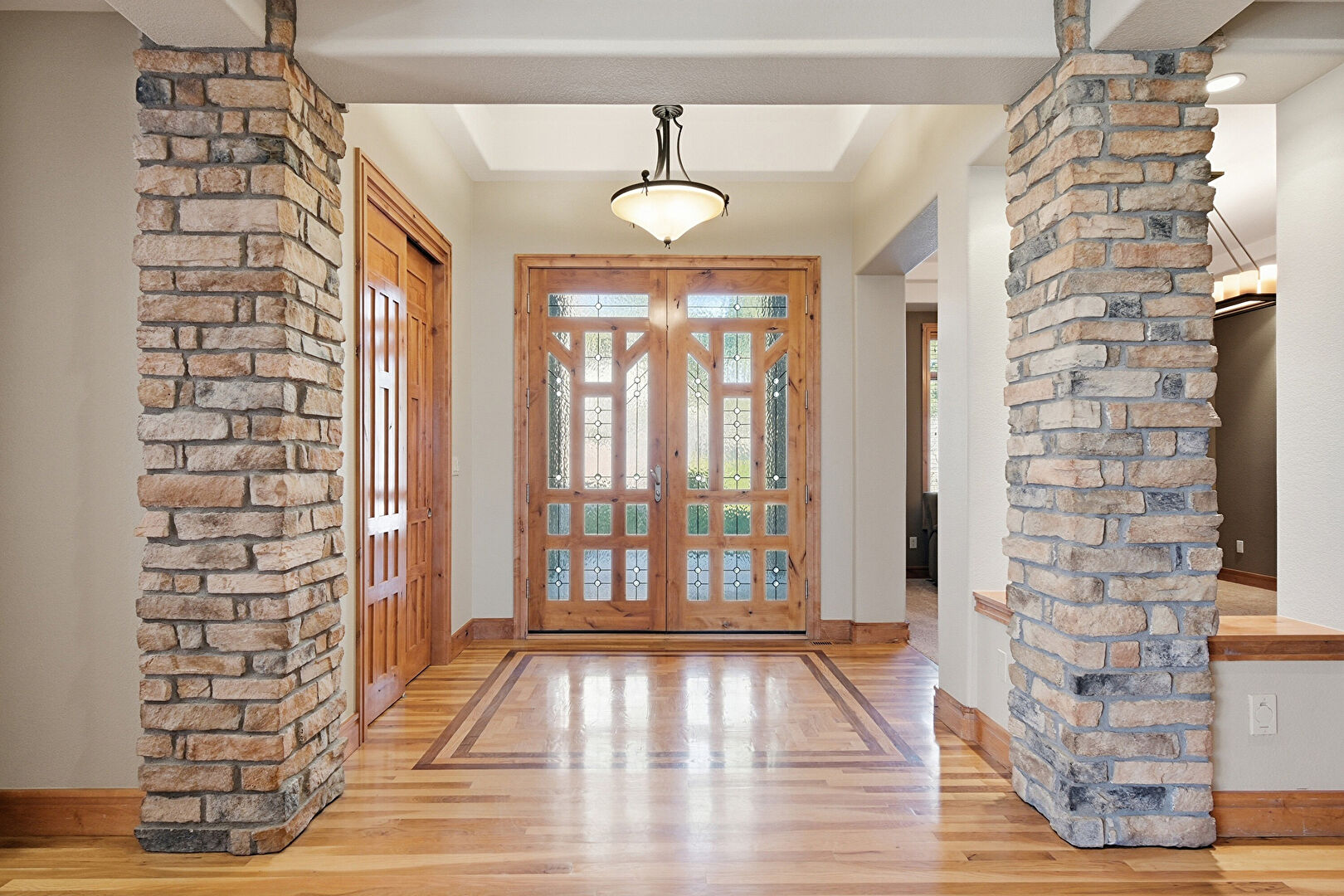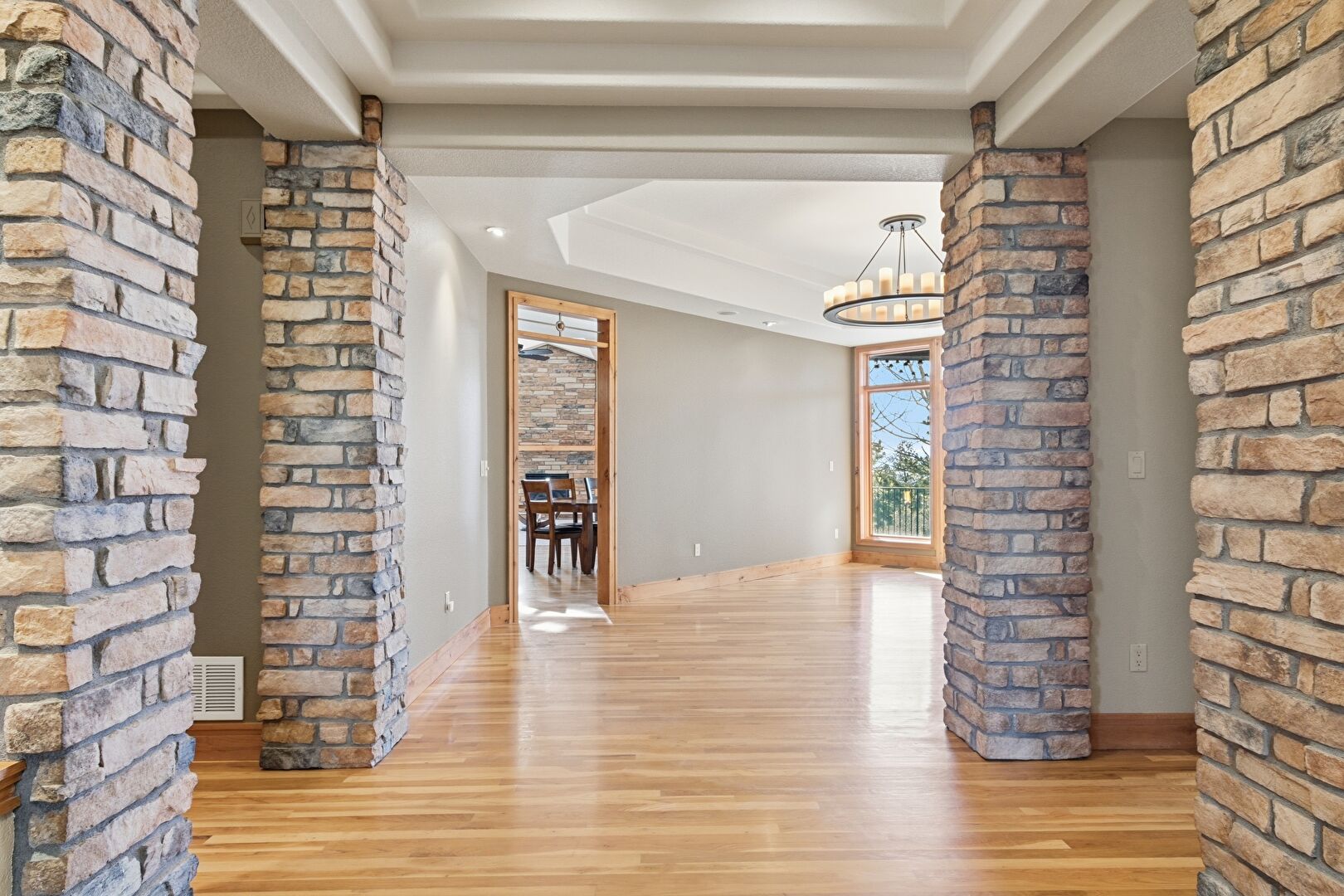 Baseboards Wall, Decorative Columns, Drywall, Natural Light, Wood Finish Floor, Natural Light, Notable Chandelier