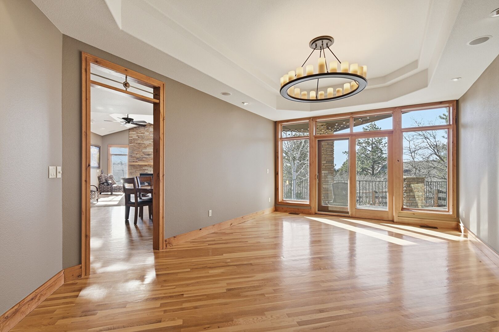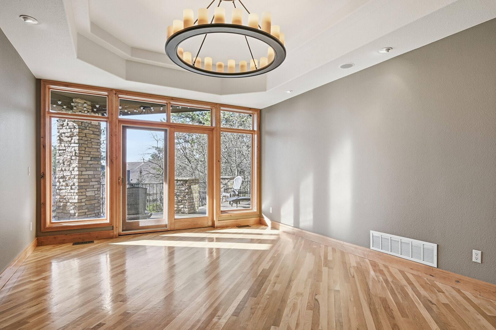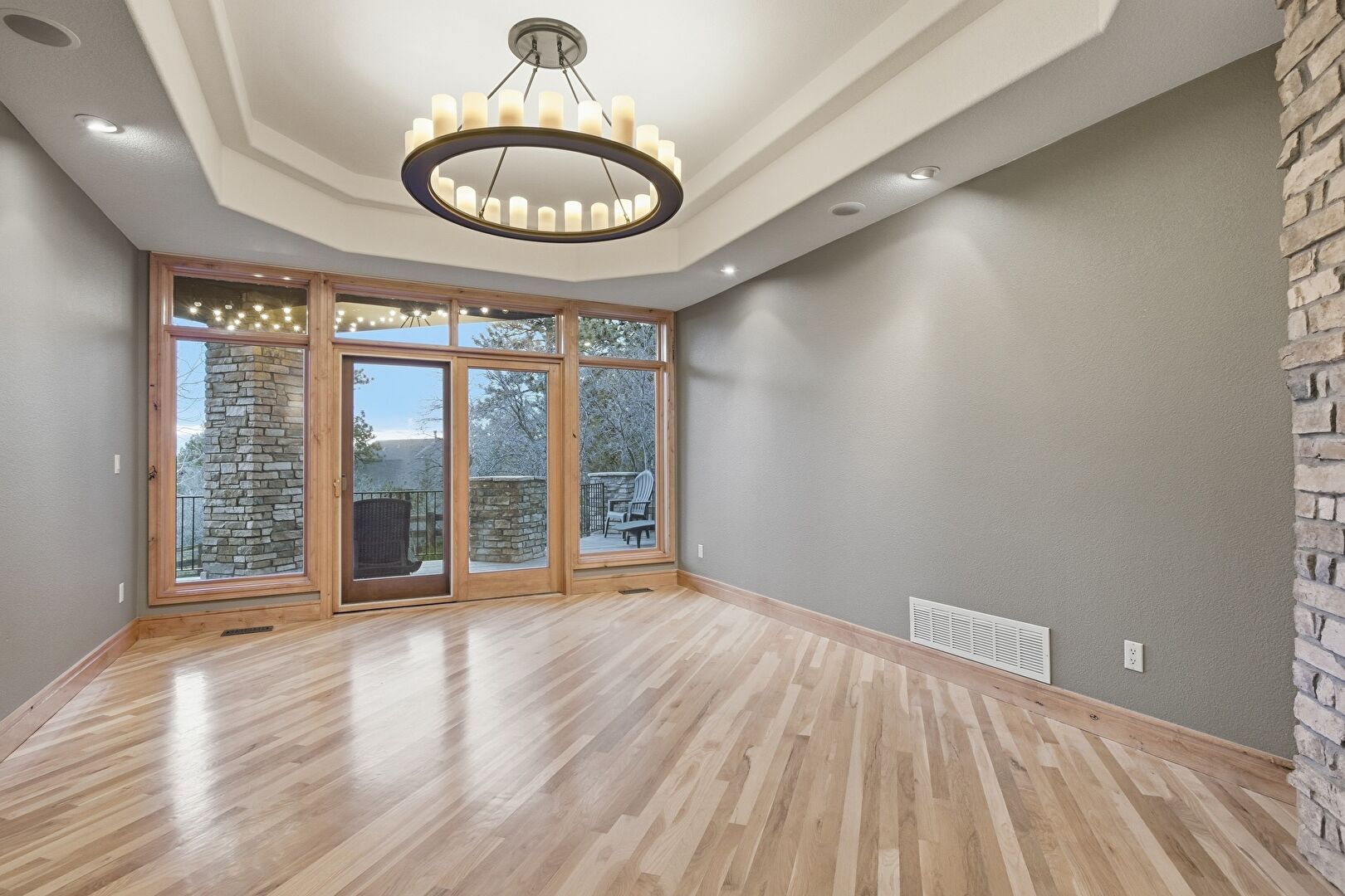 Baseboards Wall, Decorative Columns, Drywall, Floor Ceiling Windows, Natural Light, Notable Chandelier, Recessed Lighting, Textured Wall, Tray Ceiling, Vent, Wood Finish Floor, Baseboards Wall, Ceiling Fan, Notable Chandelier, Recessed Lighting