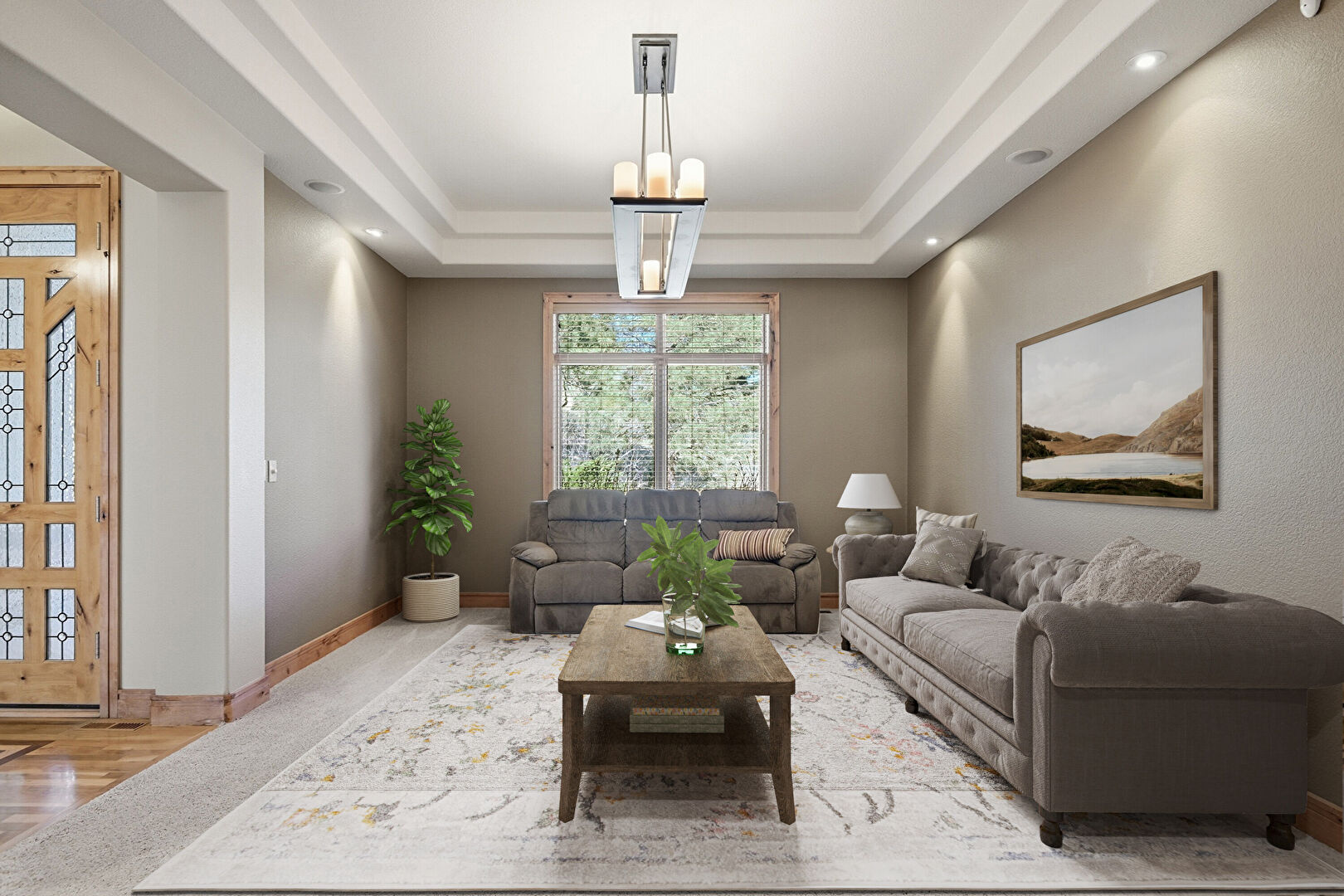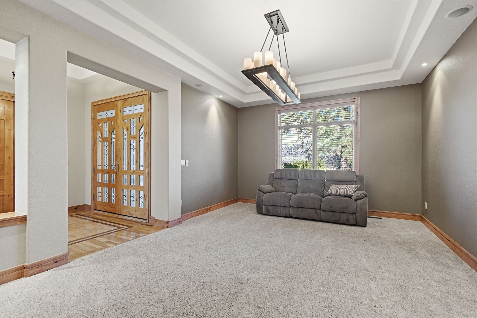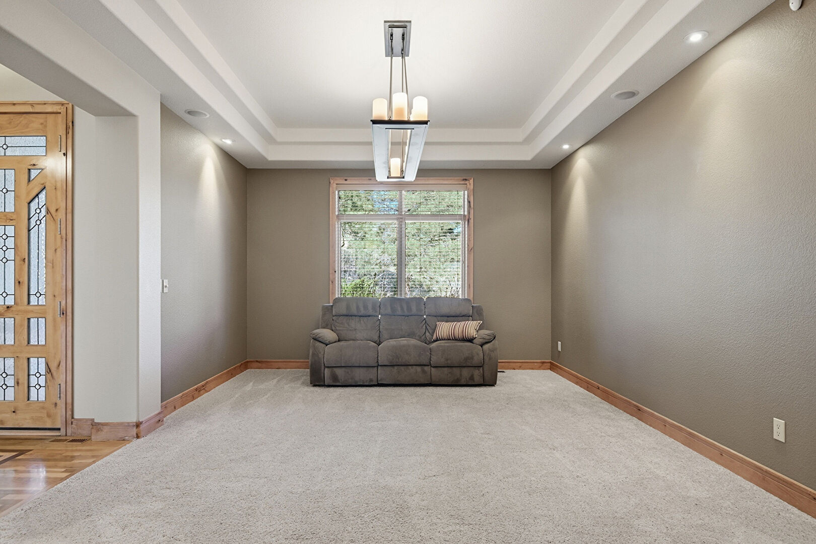 Baseboards Wall, Carpet, Ceiling Fan, Drywall, Fireplace, Natural Light, Notable Chandelier, Recessed Lighting, Textured Wall, Tray Ceiling, Carpet, Natural Light, Vent