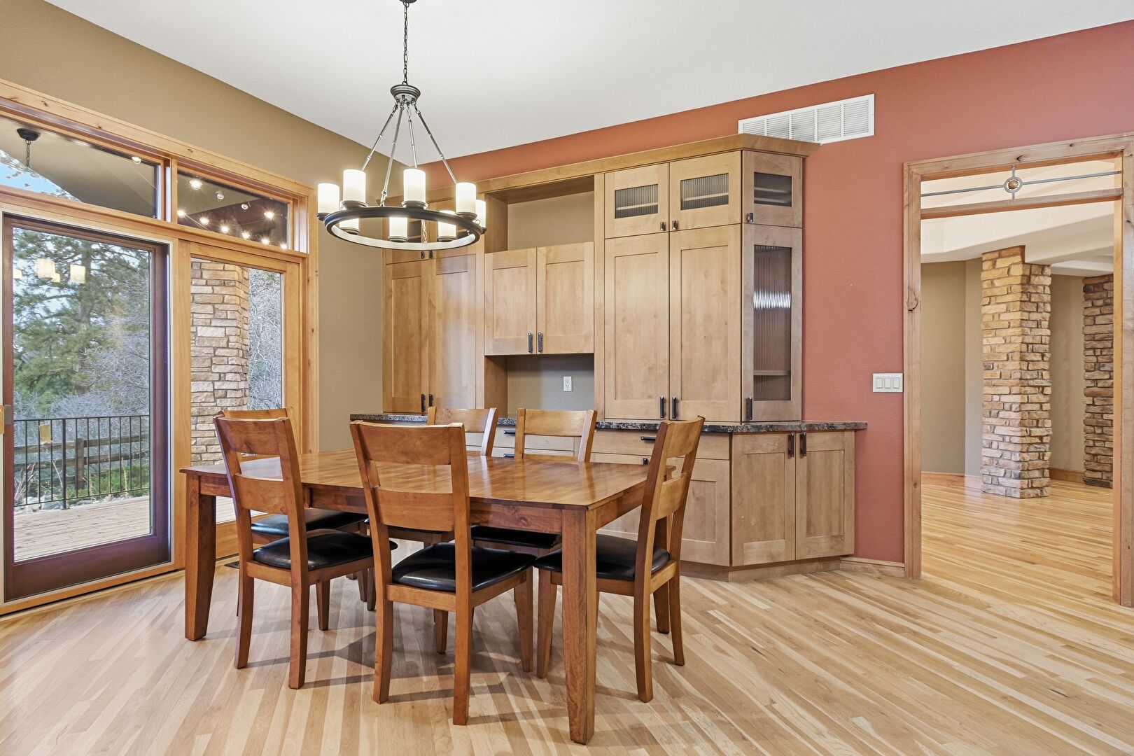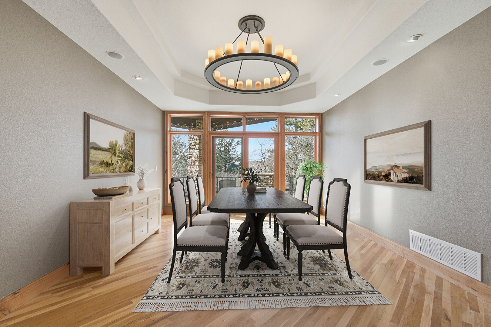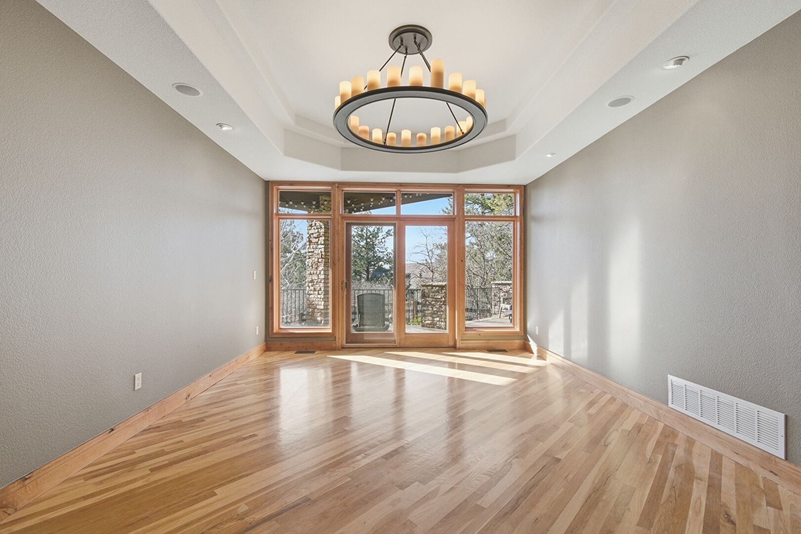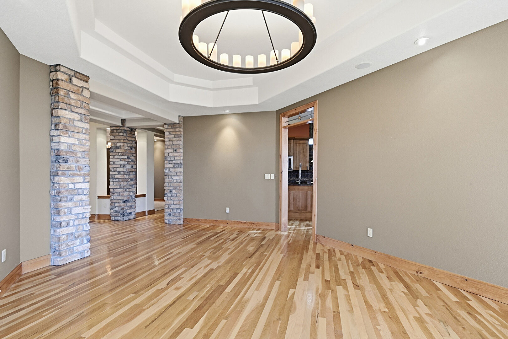 Baseboards Wall, Decorative Columns, Natural Light, Notable Chandelier, Recessed Lighting, Tray Ceiling, Vent, Wood Finish Floor, Drywall, Fence