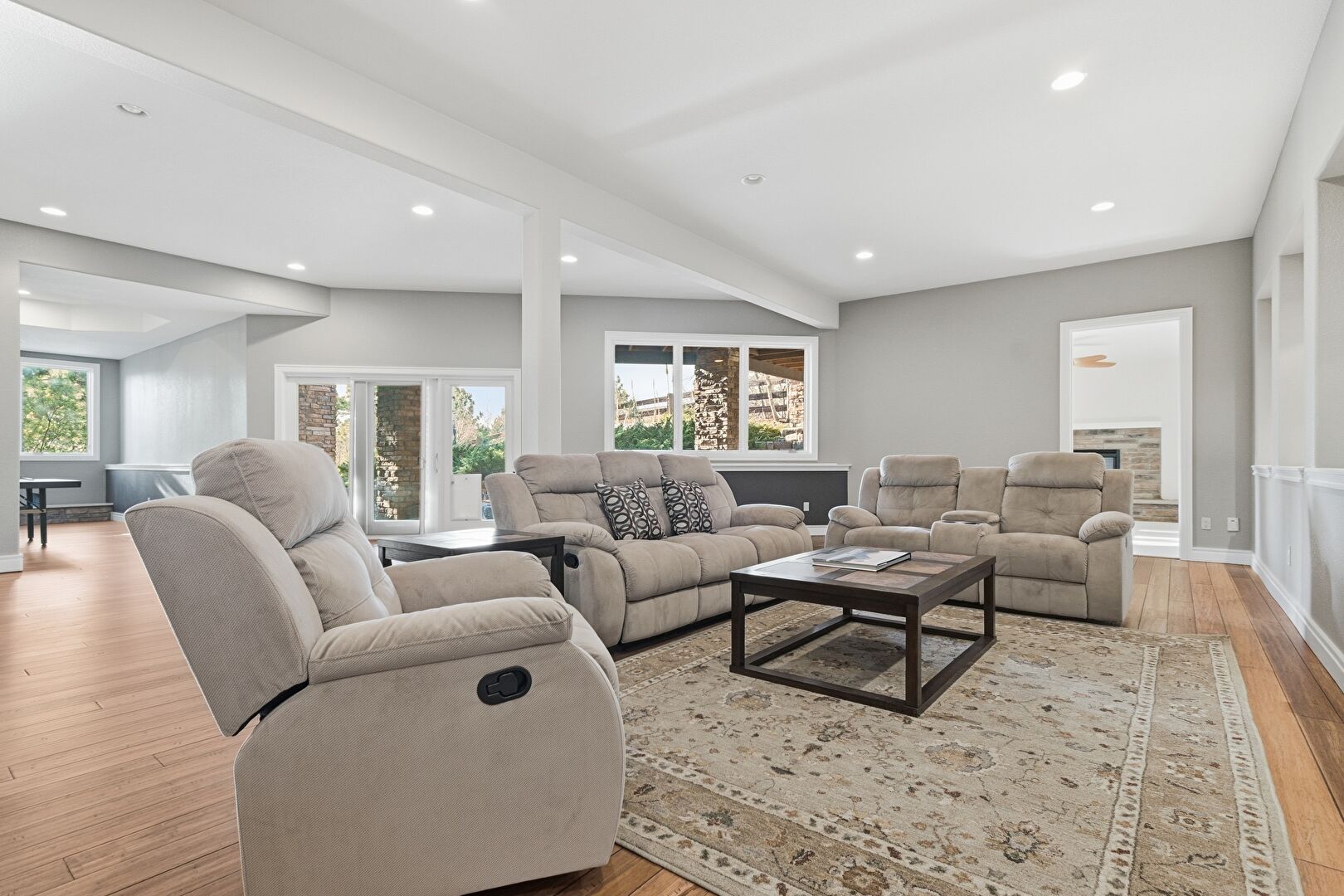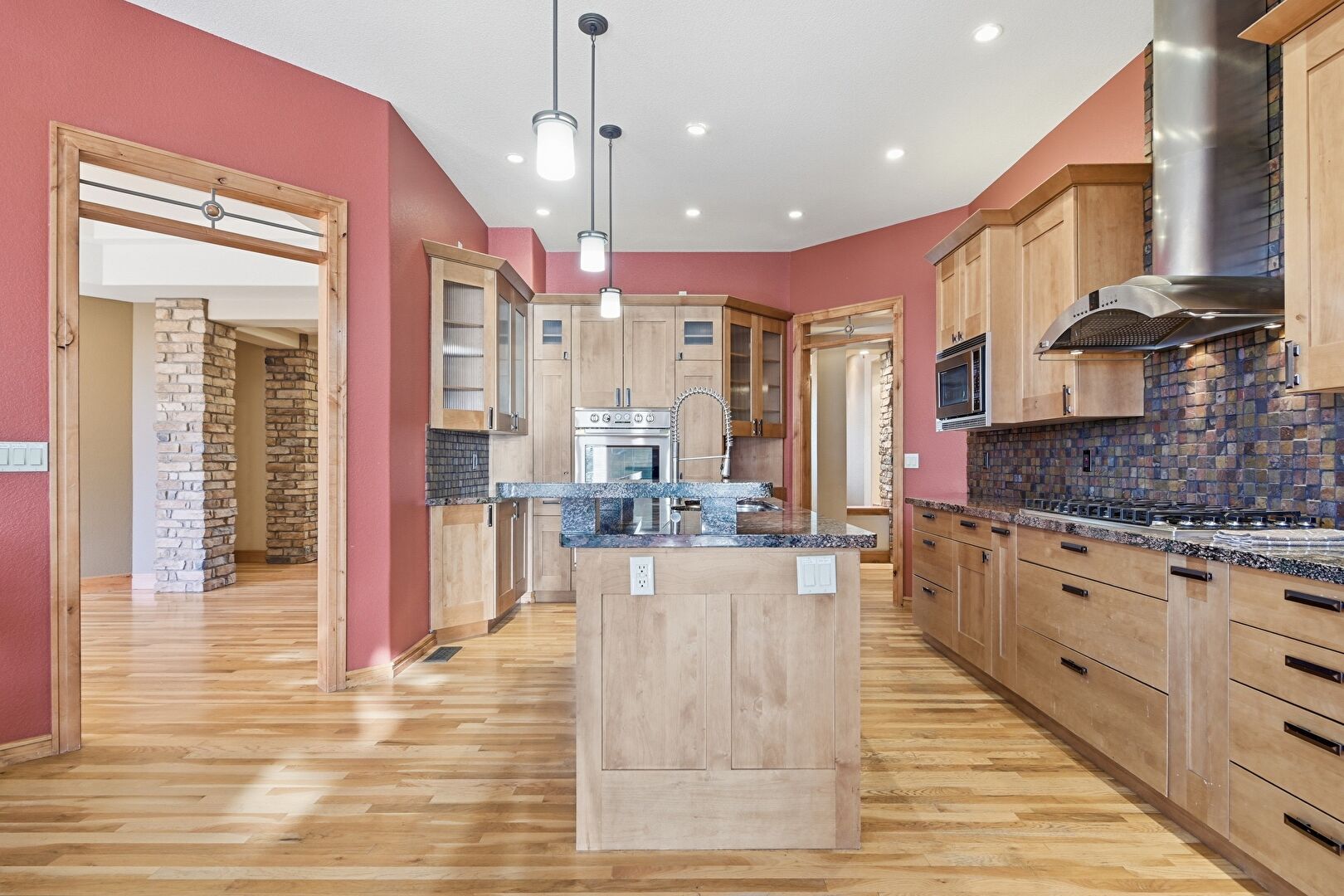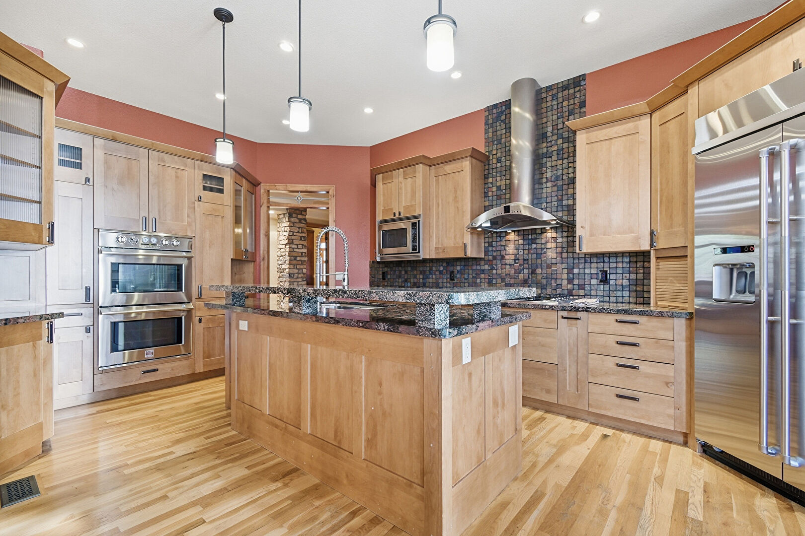 Baseboards Wall, Cathedral Ceiling, Ceiling Fan, Double Oven, Drywall, Fireplace, Natural Light, Notable Chandelier, Recessed Lighting, Vaulted Ceiling, Vent, Wood Finish Floor, Baseboards Wall, Natural Light, U Shaped Kitchen, Wood Finish Floor