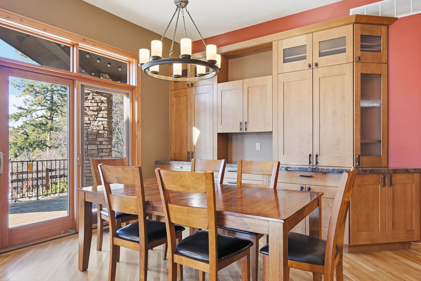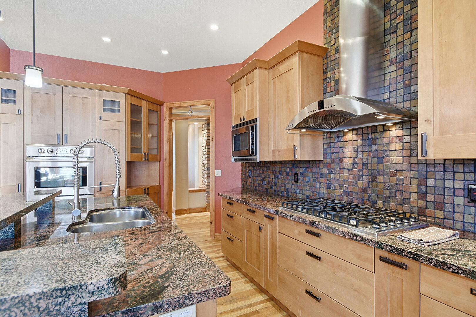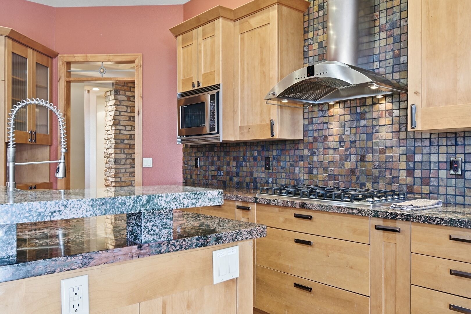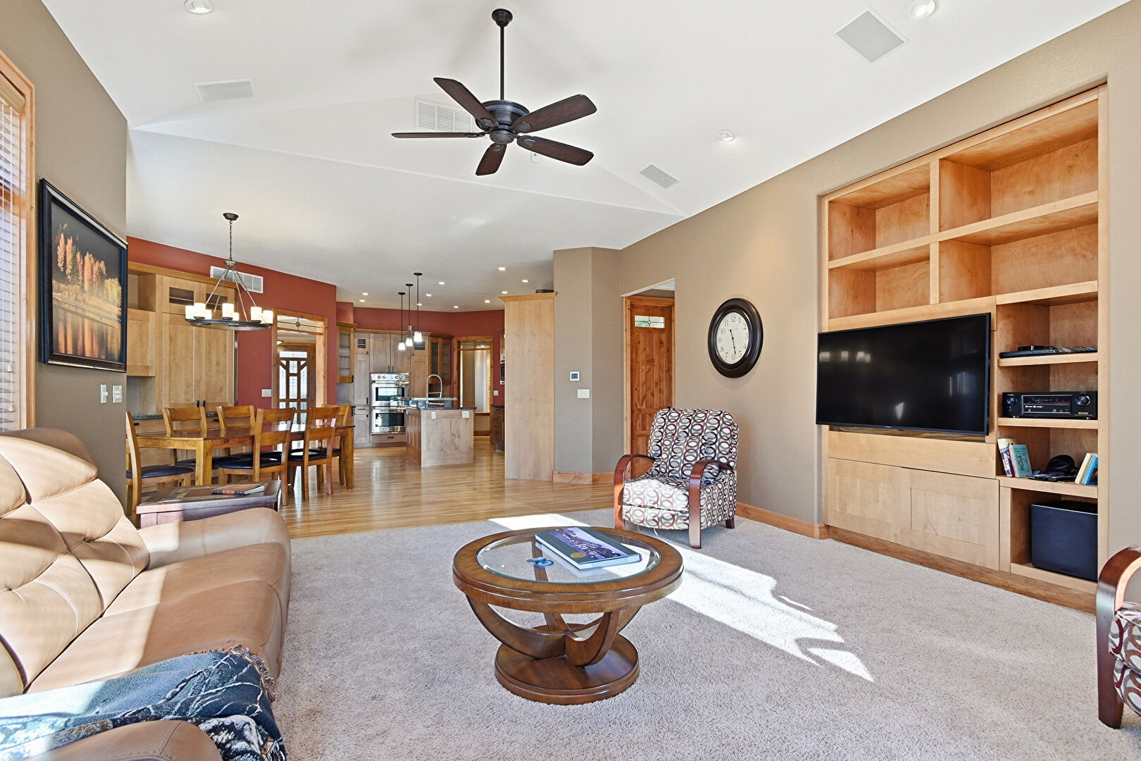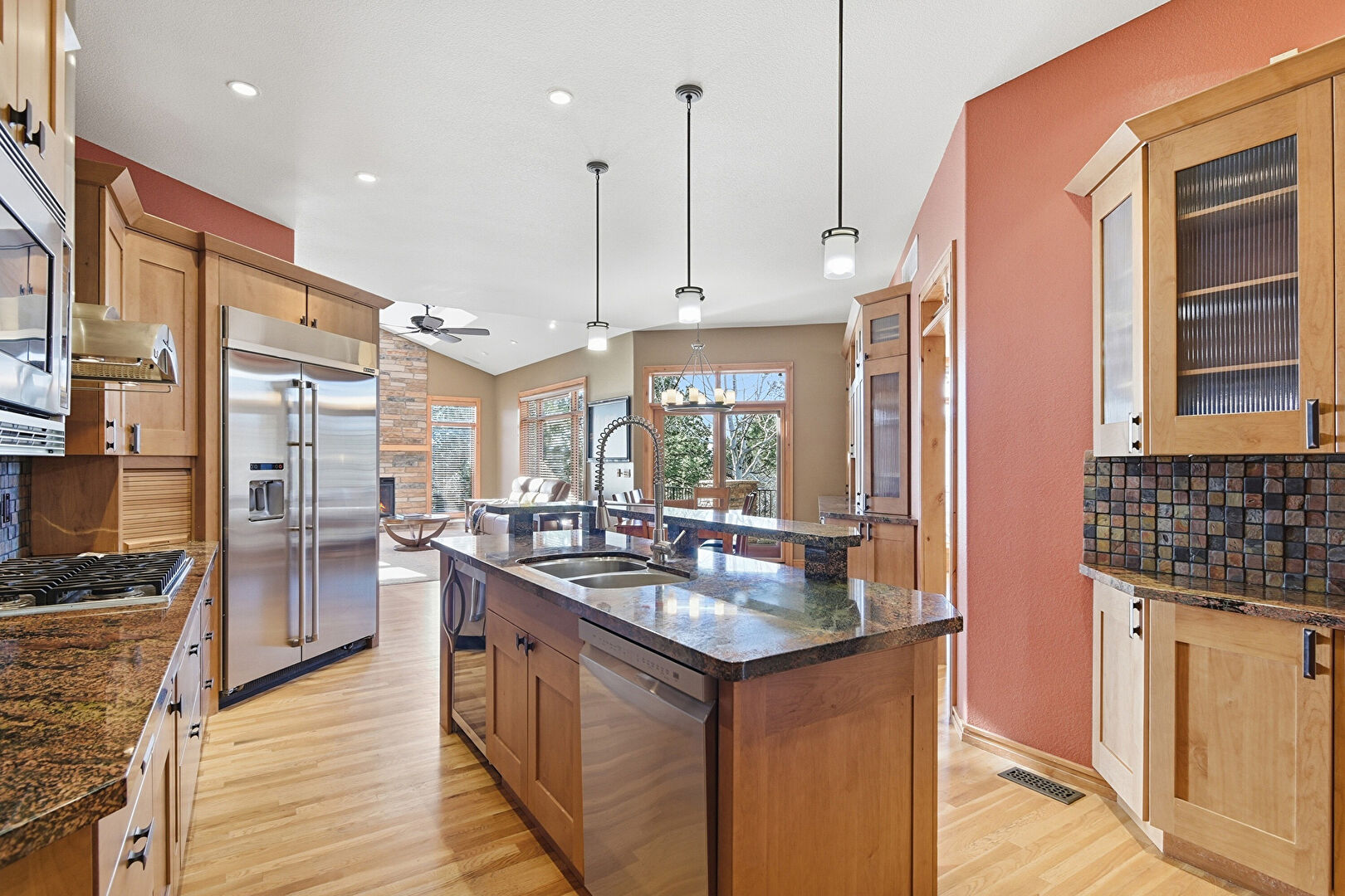 Baseboards Wall, Ceiling Fan, Crown Molding Cabinets, Double Oven, Drywall, Fireplace, Glass Insert Cabinets, Kitchen Island, Medium Brown Cabinets, Natural Light, Notable Chandelier, Open Shelves, Pendant Lighting, Recessed Lighting, Shaker Cabinets, Stone Countertops, U Shaped Kitchen, Vaulted Ceiling, Vent, Wine Cooler, Wood Finish Floor, Ceiling Fan, Fireplace, Glass Insert Cabinets, Pendant Lighting, Shaker Cabinets, Wood Finish Floor