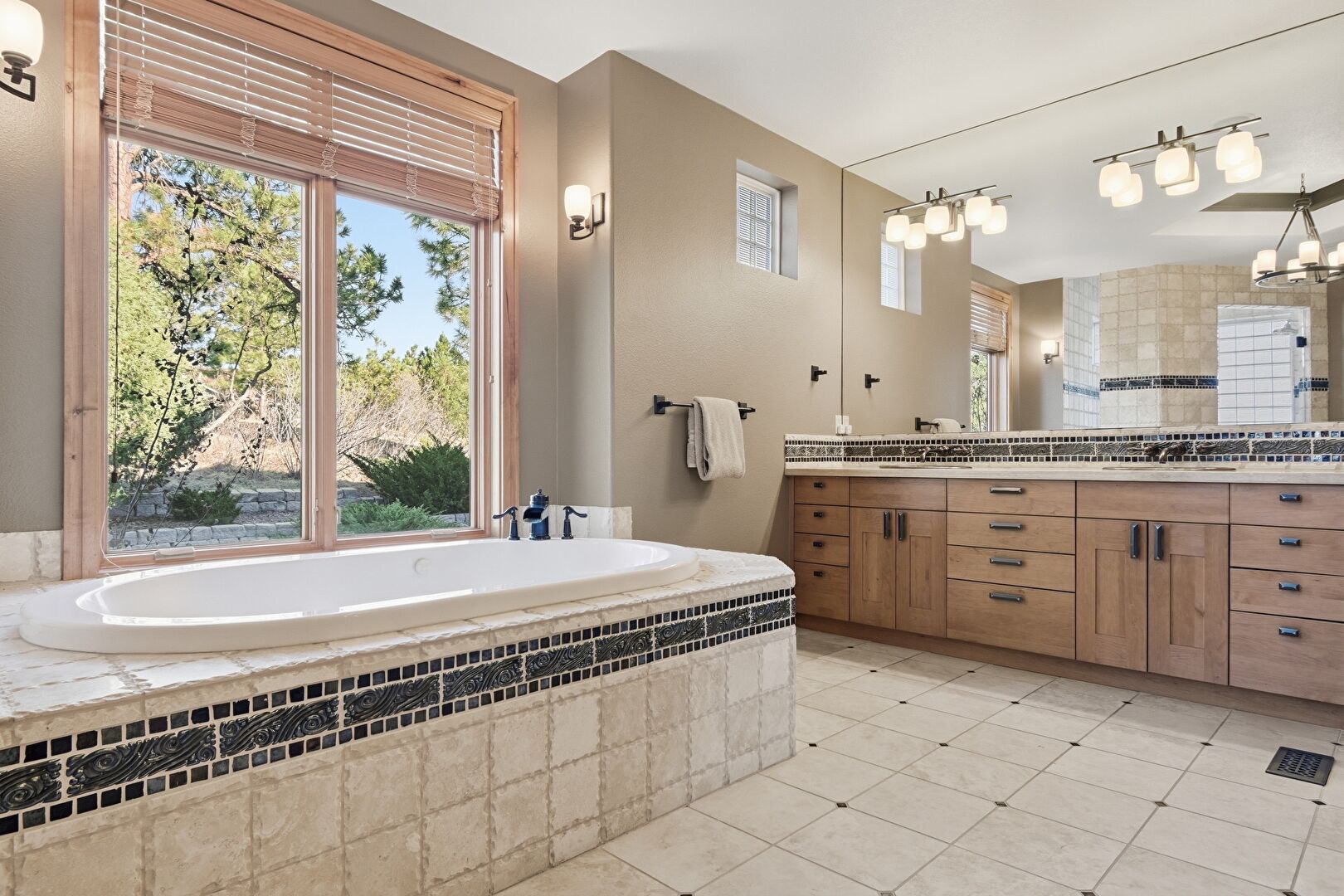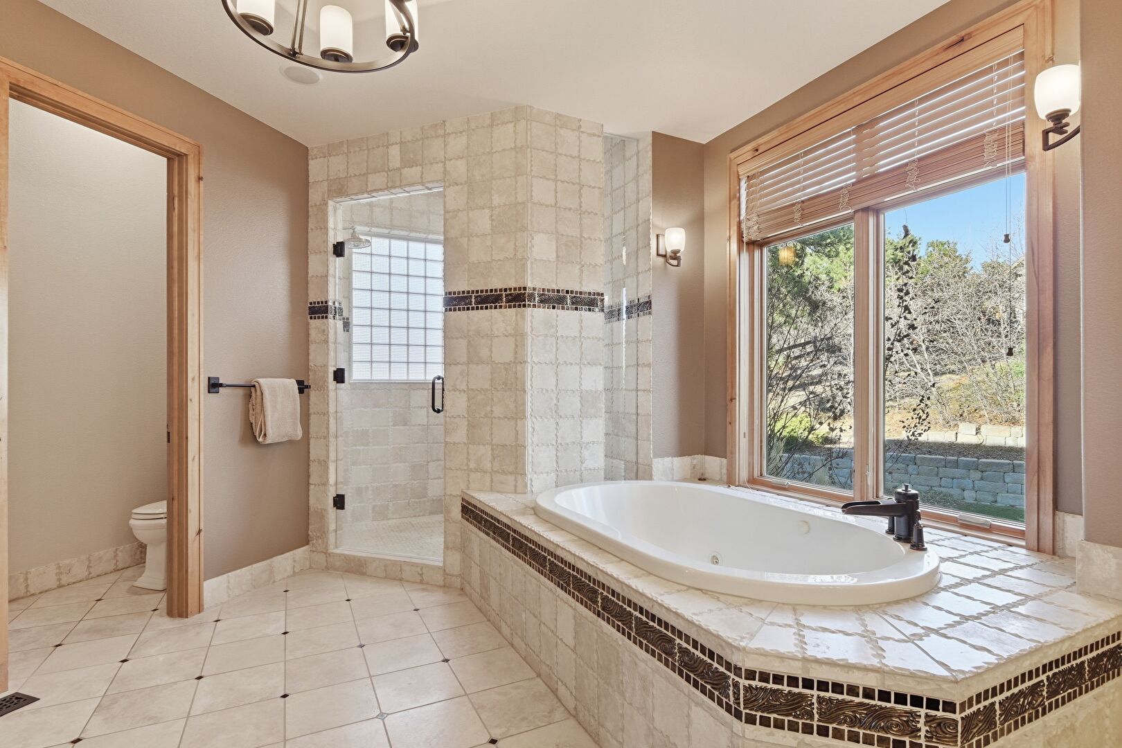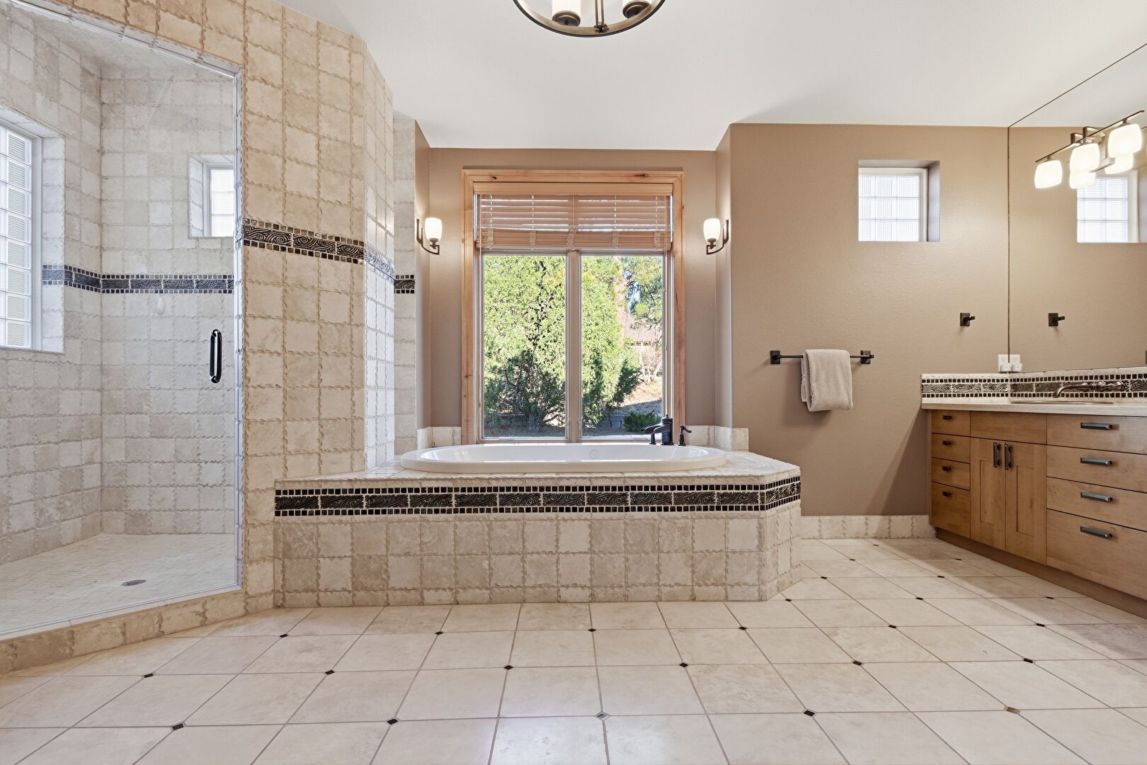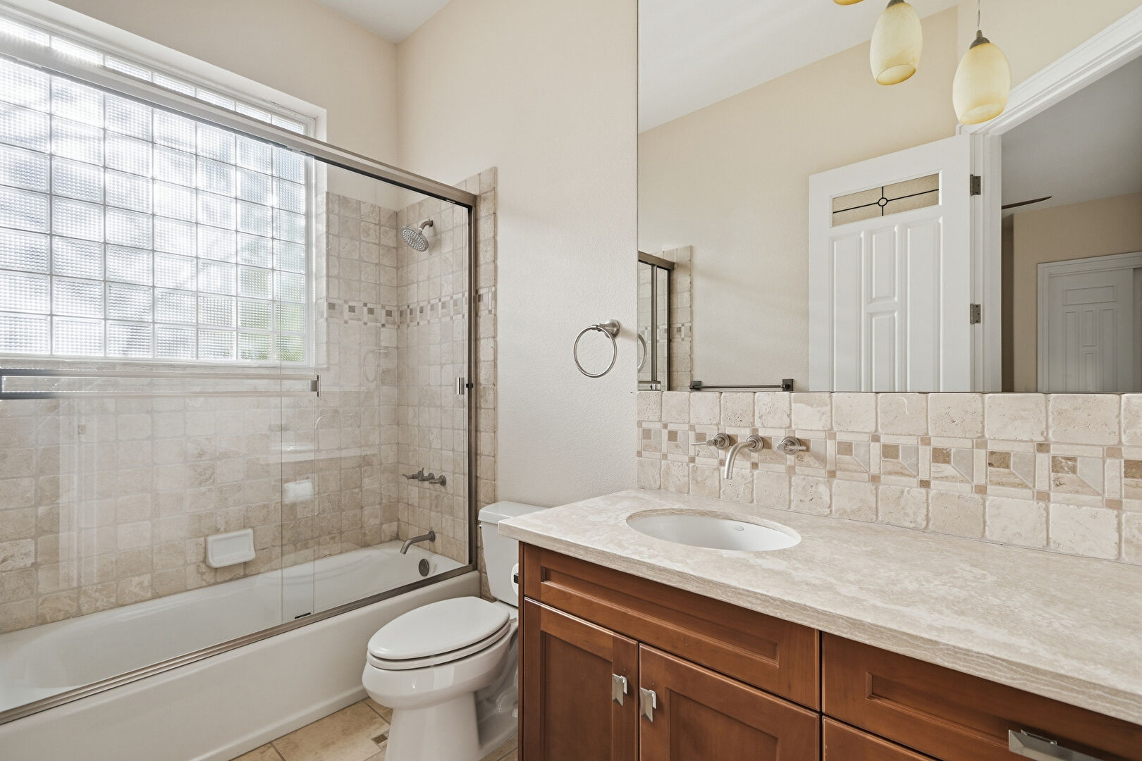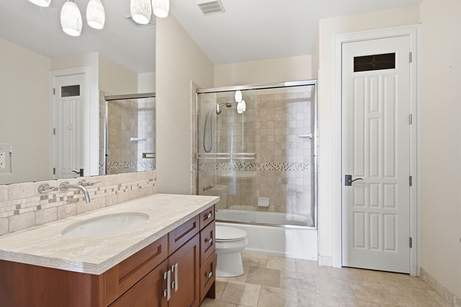 Baseboards Wall, Ceiling Fan, Combined Bath Shower, Double Vanity, Drywall, Full Bathroom, Natural Light, Notable Chandelier, Tile Floor, Vanity, Vent, Water Closet, Drywall, Full Bathroom, Natural Light, Textured Wall, Tile Floor, Vanity