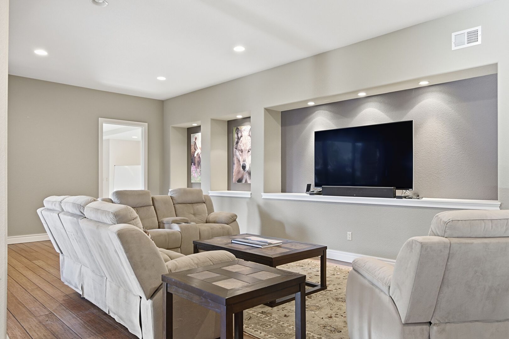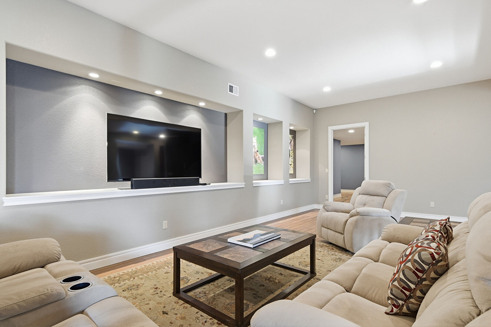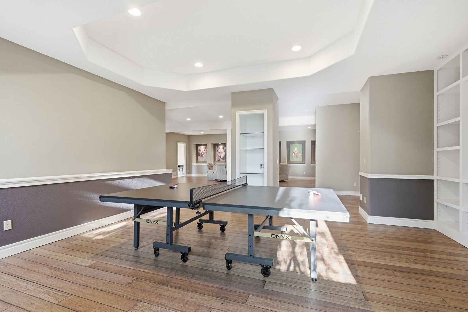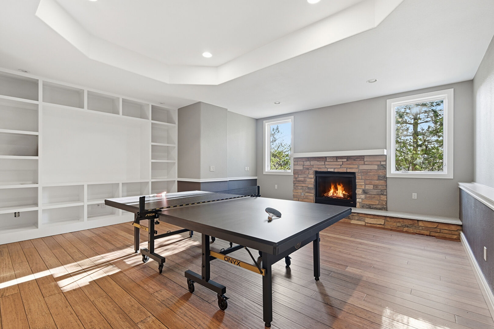 Baseboards Wall, Built In Shelves, Drywall, Fireplace, Natural Light, Recessed Lighting, Tray Ceiling, Wood Finish Floor, Baseboards Wall, Tray Ceiling